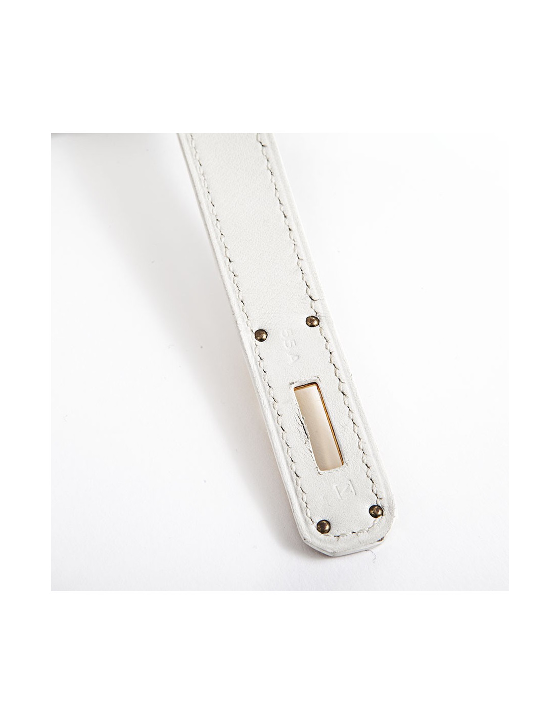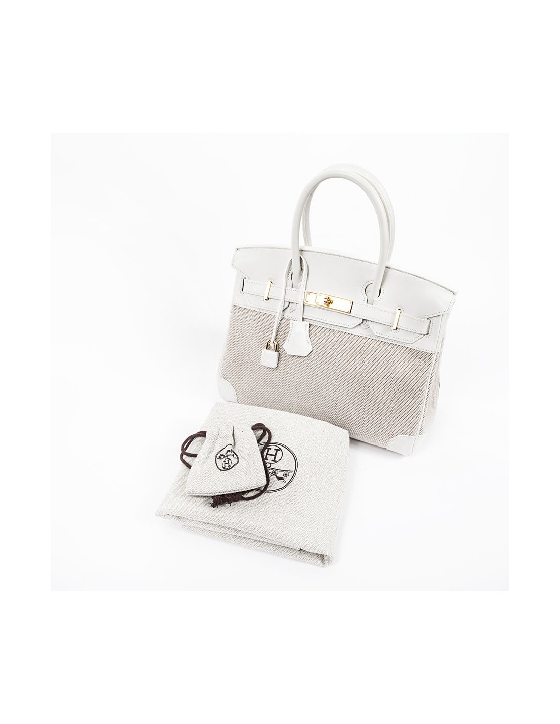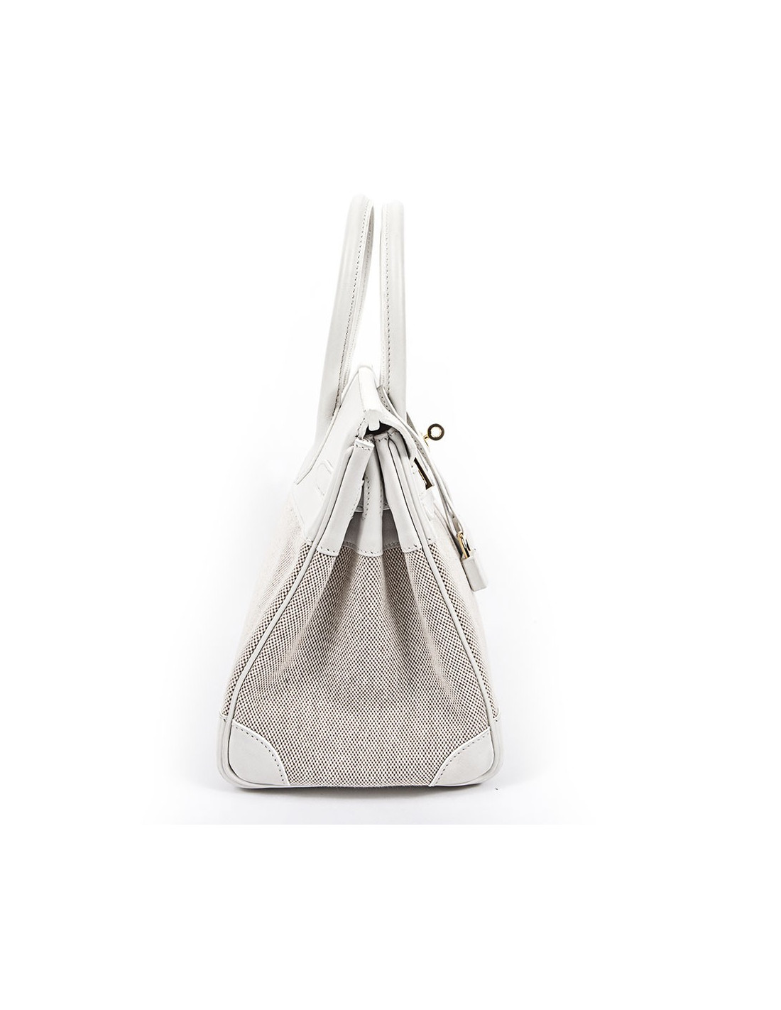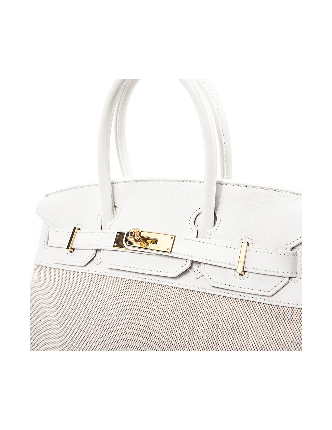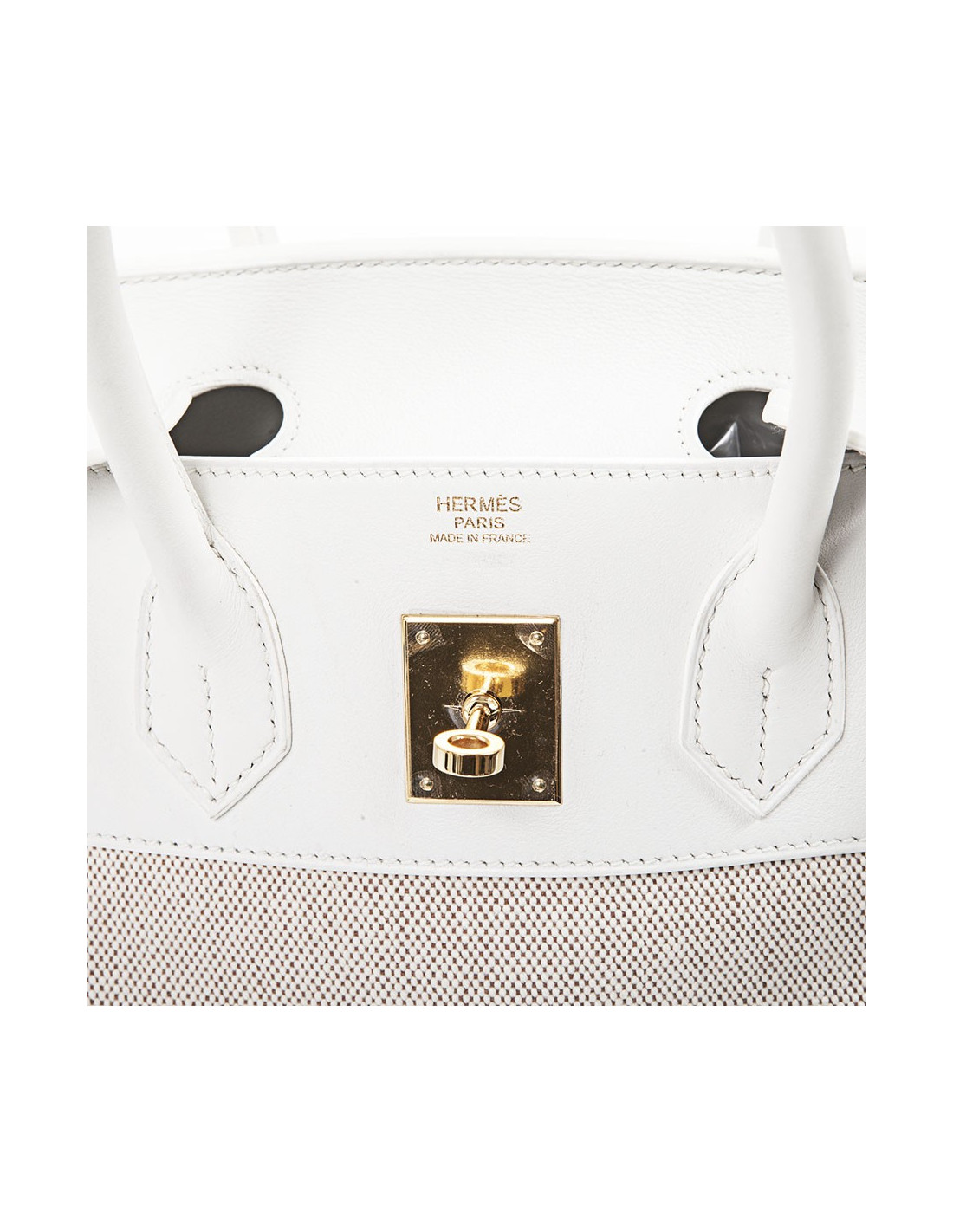 Birkin 30 Hermès en cuir swift blanc et toile beige, bijouterie dorée. La toile est impeccable, le cuir blanc aussi, les coins sont légèrement usés, les clous sous le sac sont protégées par des plastiques, les bijouteries sur les sangles ont des micros rayures.