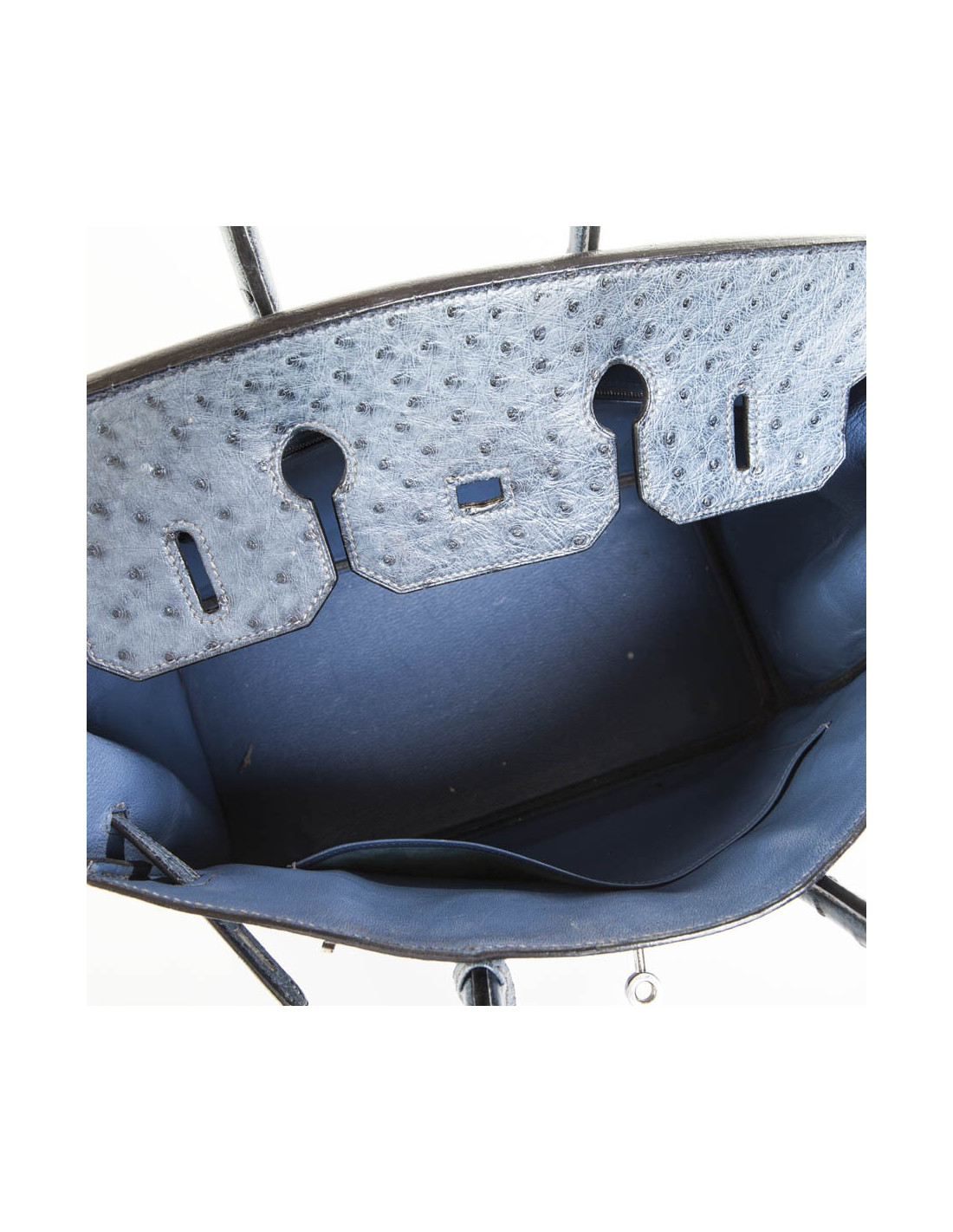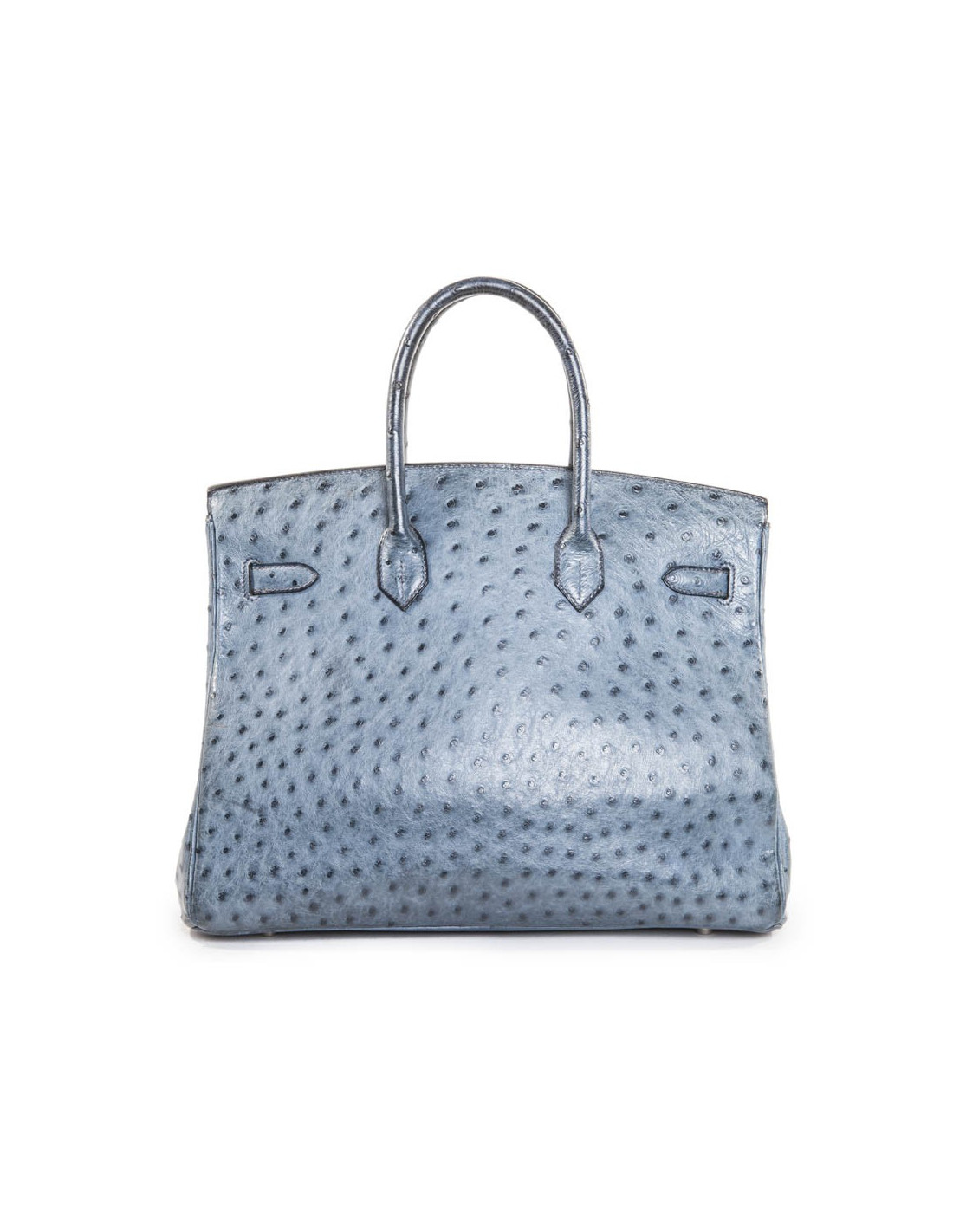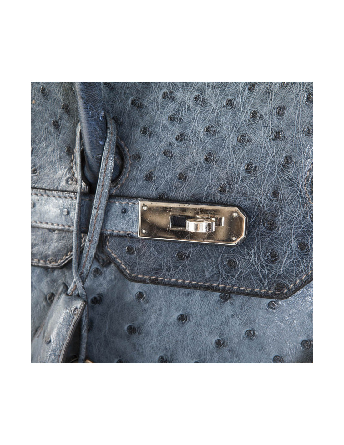 Rare Birkin 35 Hermès en autruche bleu jean et bijouterie argent palladié.