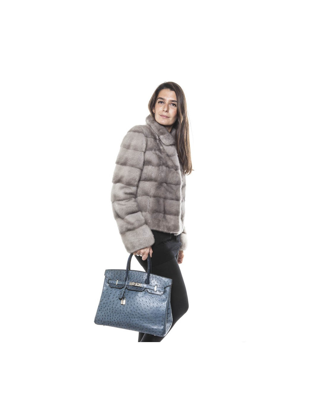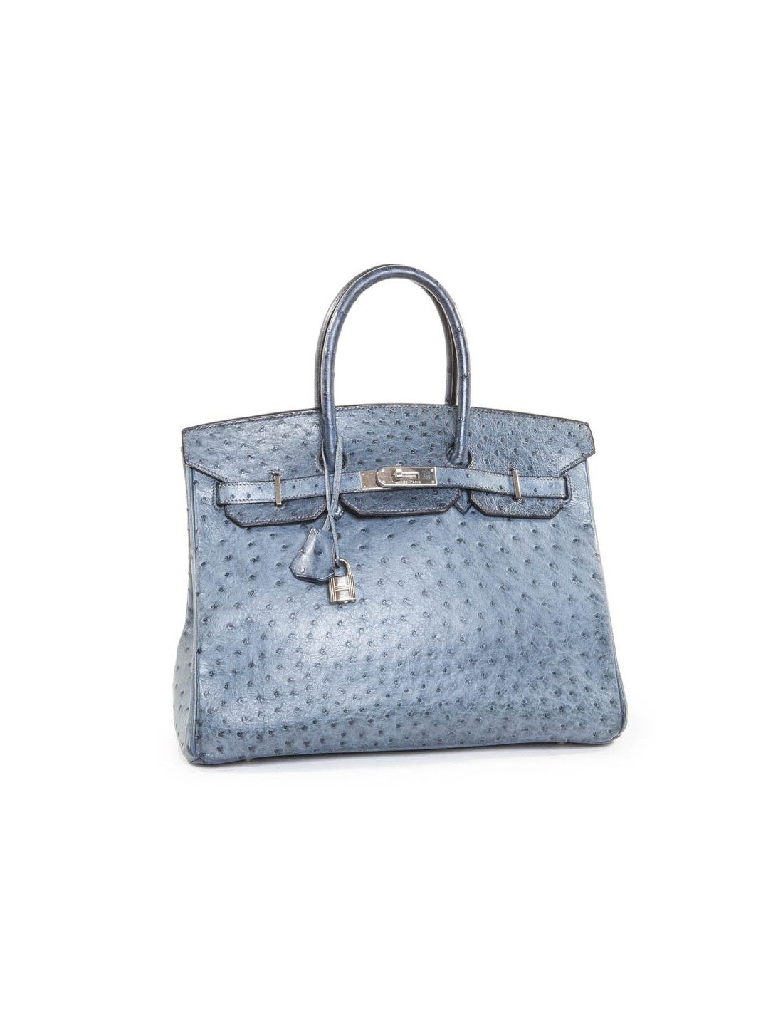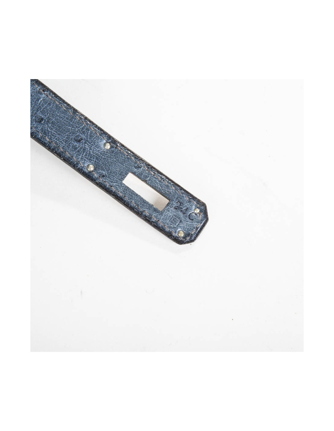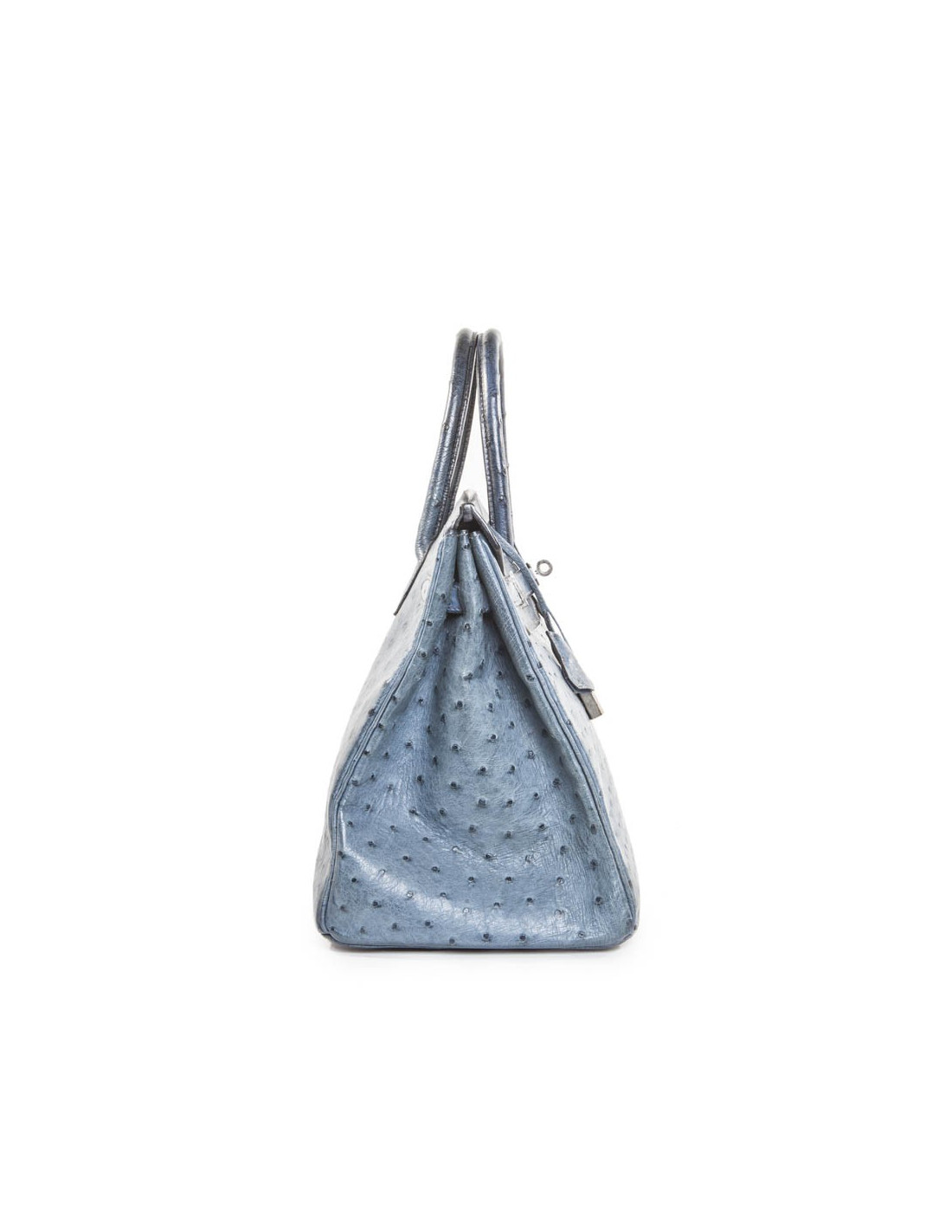 Rare Birkin 35 Hermès en autruche bleu jean et bijouterie argent palladié.