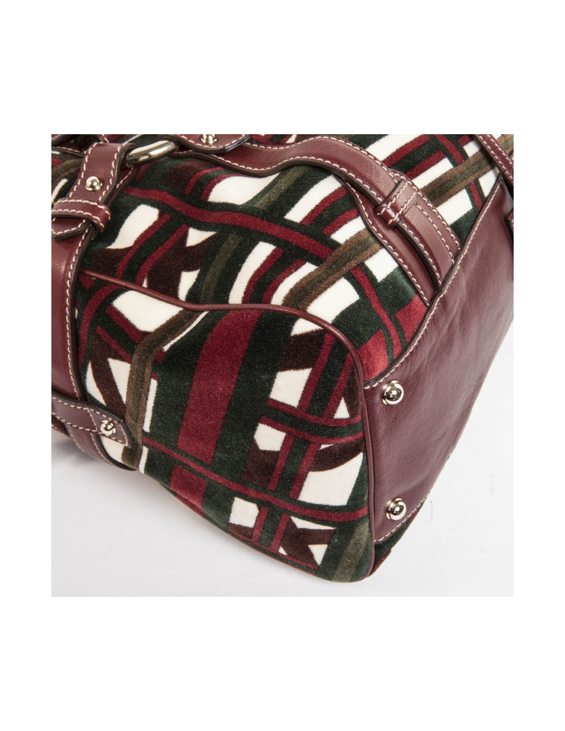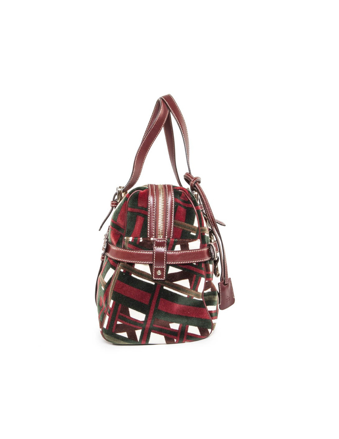 Sac cabas en velours motifs bolduc et cuir bordeaux de la Maison Gucci. Bijouterie dorée pâle. A l'avant, le "mors" emblème de la Maison Gucci. Fermeture zippée. L'intérieur est en tissu marron avec une grande poche zippée et une poche pour smartphone.