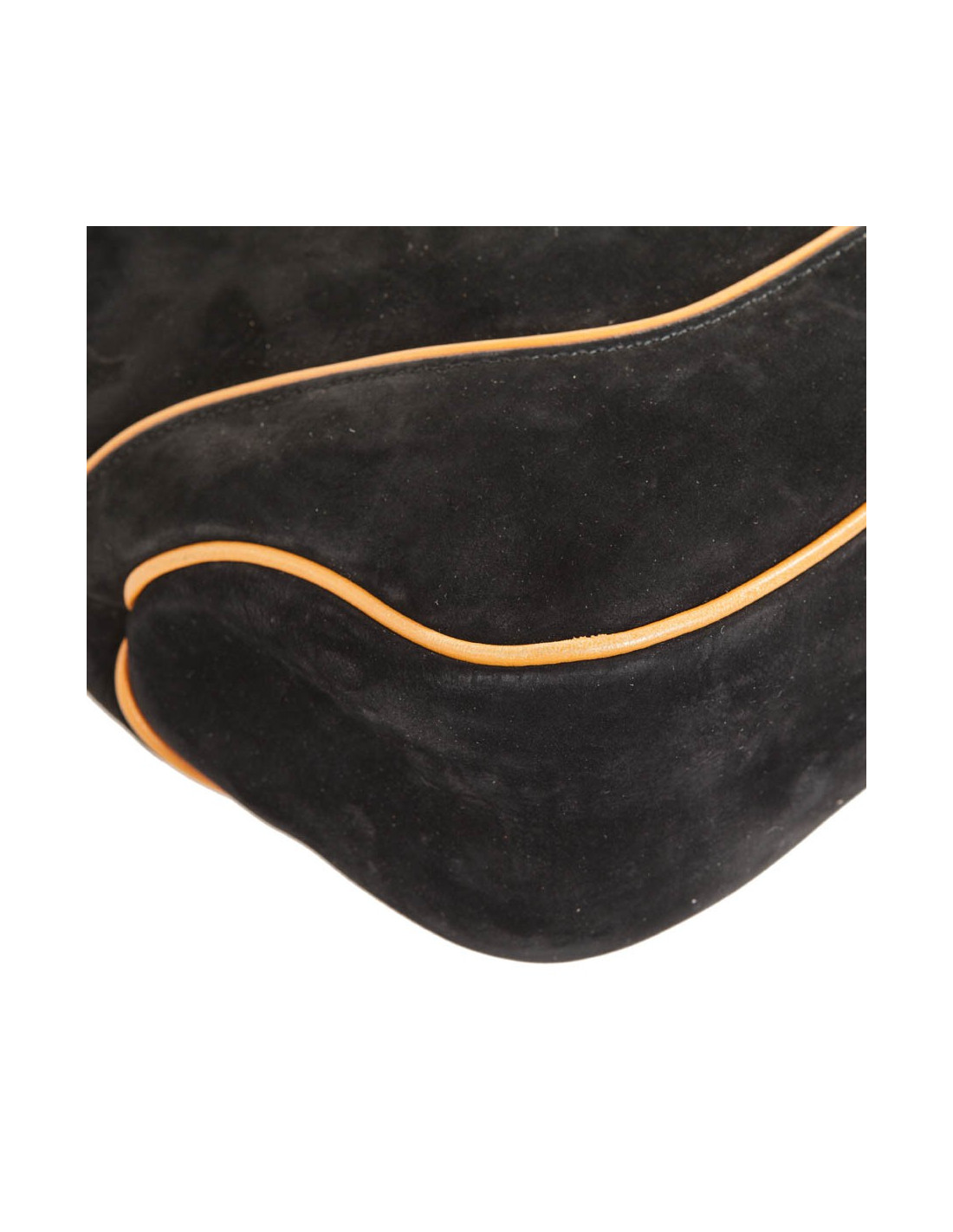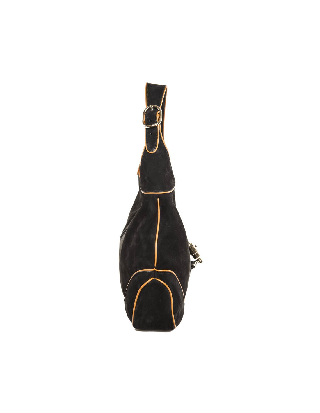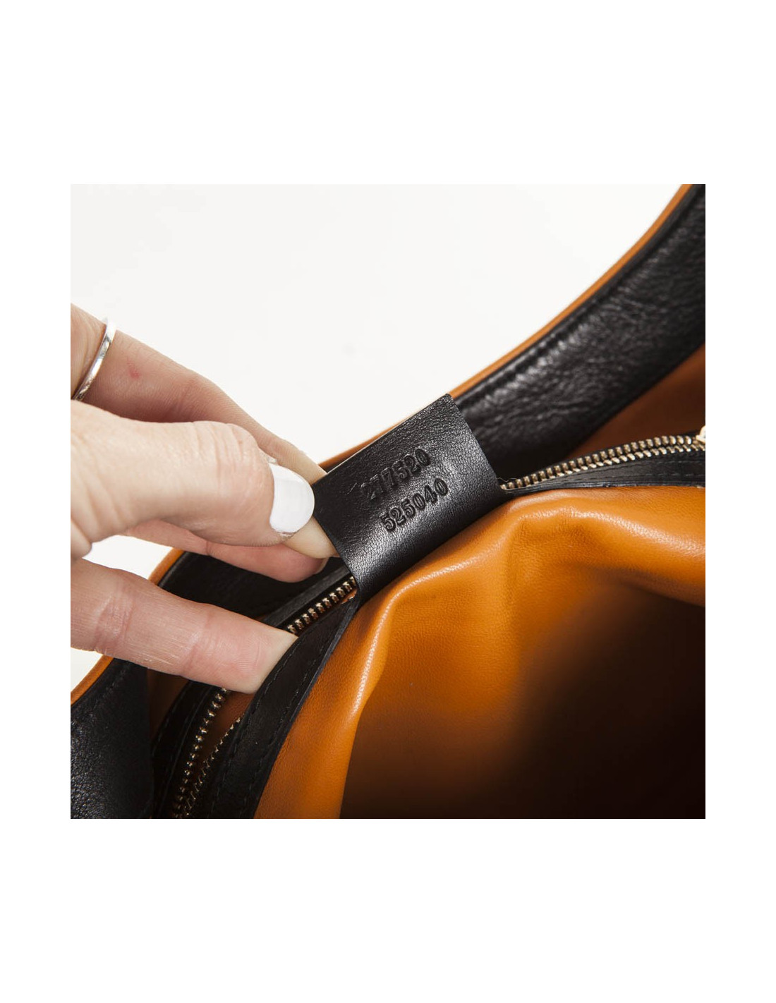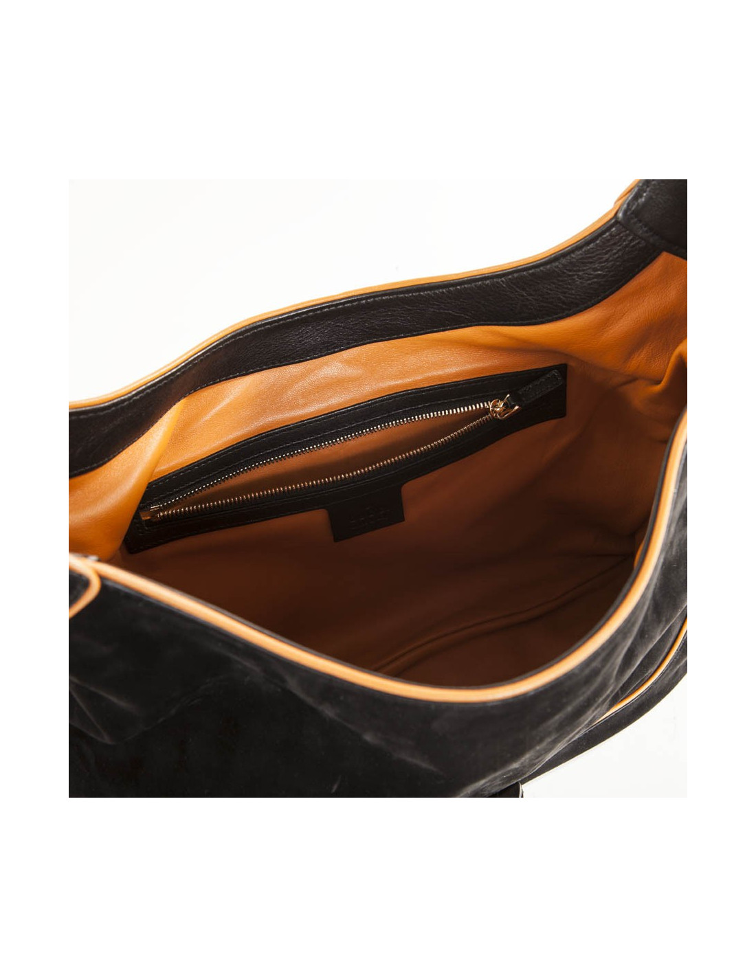 Sac Gucci en veau velours noir gansé de cuir orange foncé. la bijouterie est dorée or pâle. L'intérieur est en cuir d'agneau souple avec 3 poches dont 1 zippée.