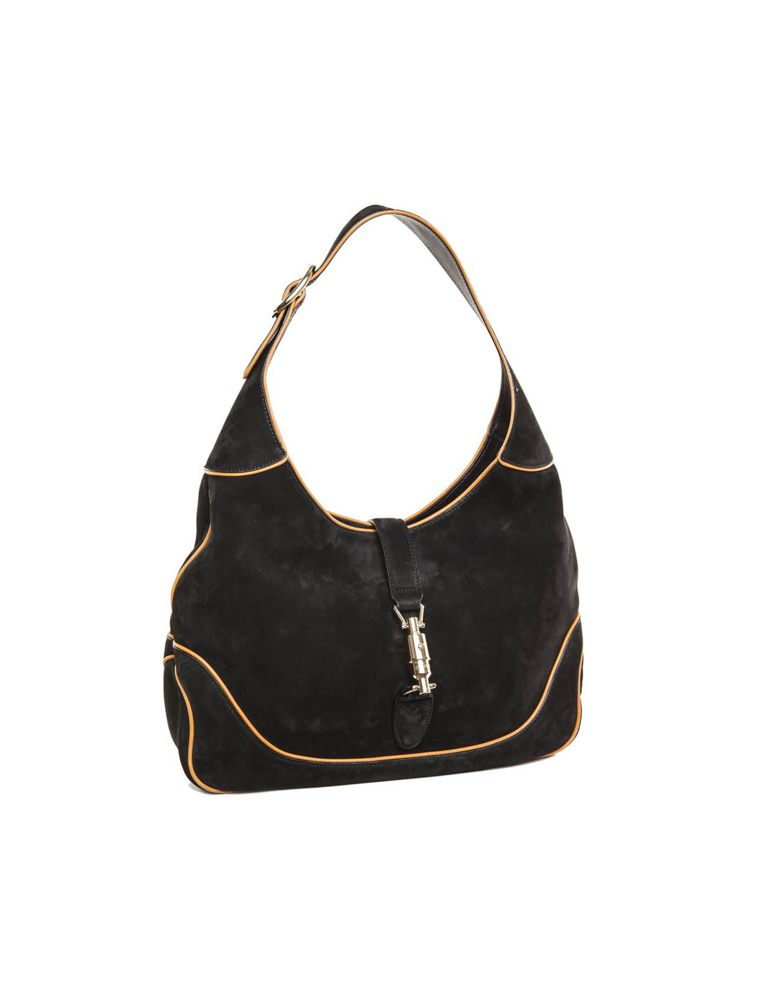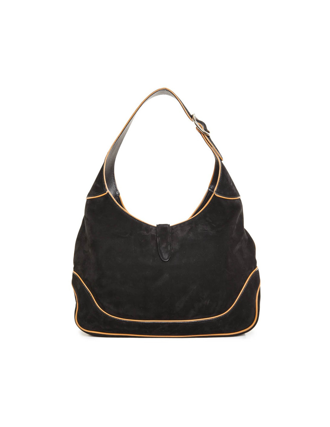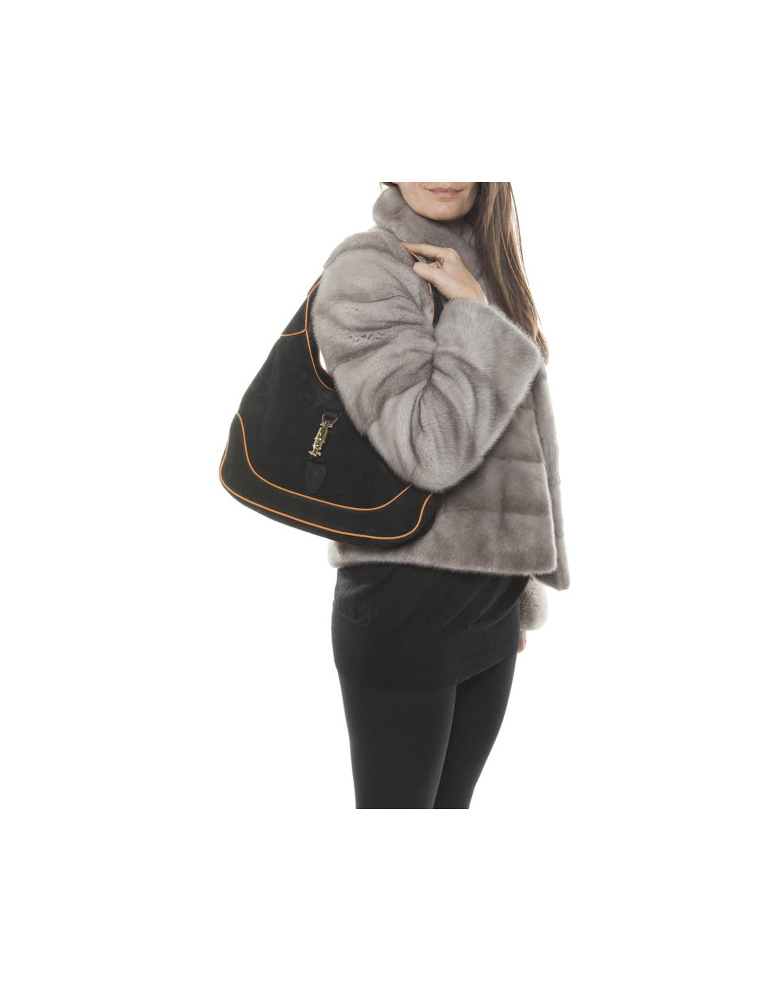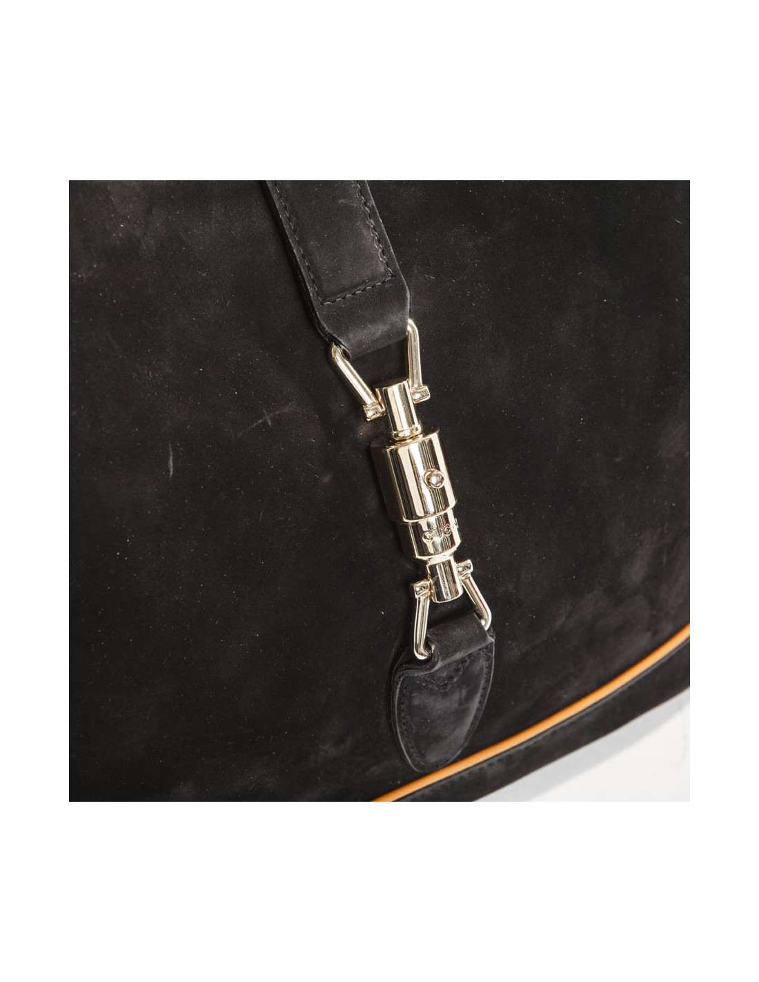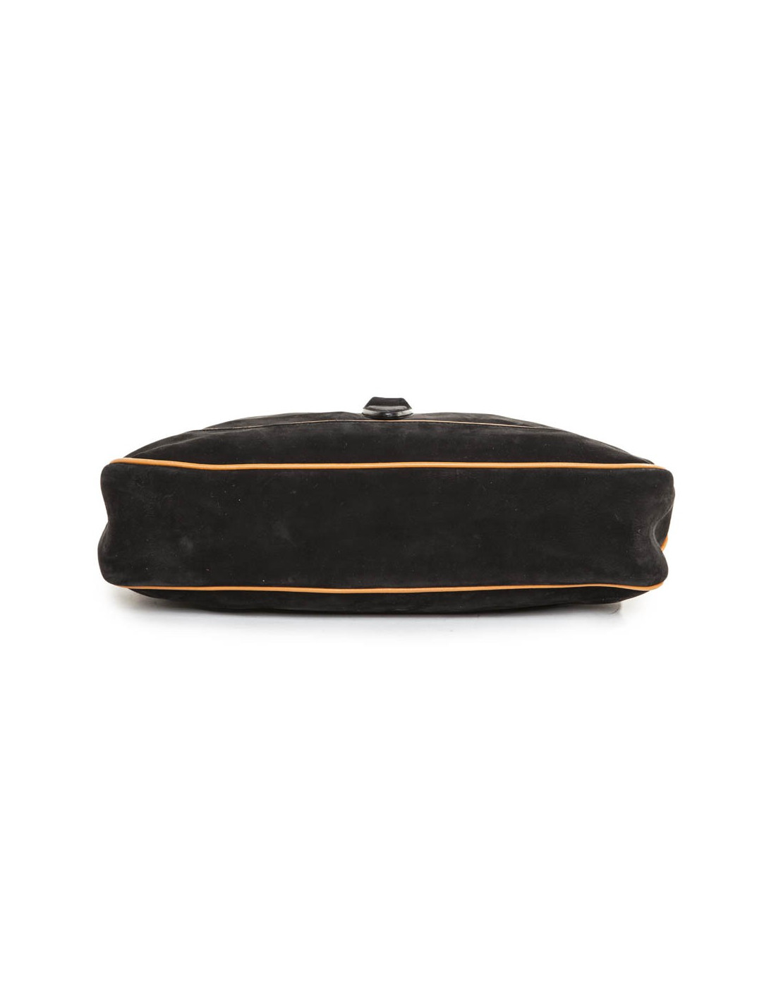 Sac Gucci en veau velours noir gansé de cuir orange foncé. la bijouterie est dorée or pâle. L'intérieur est en cuir d'agneau souple avec 3 poches dont 1 zippée.