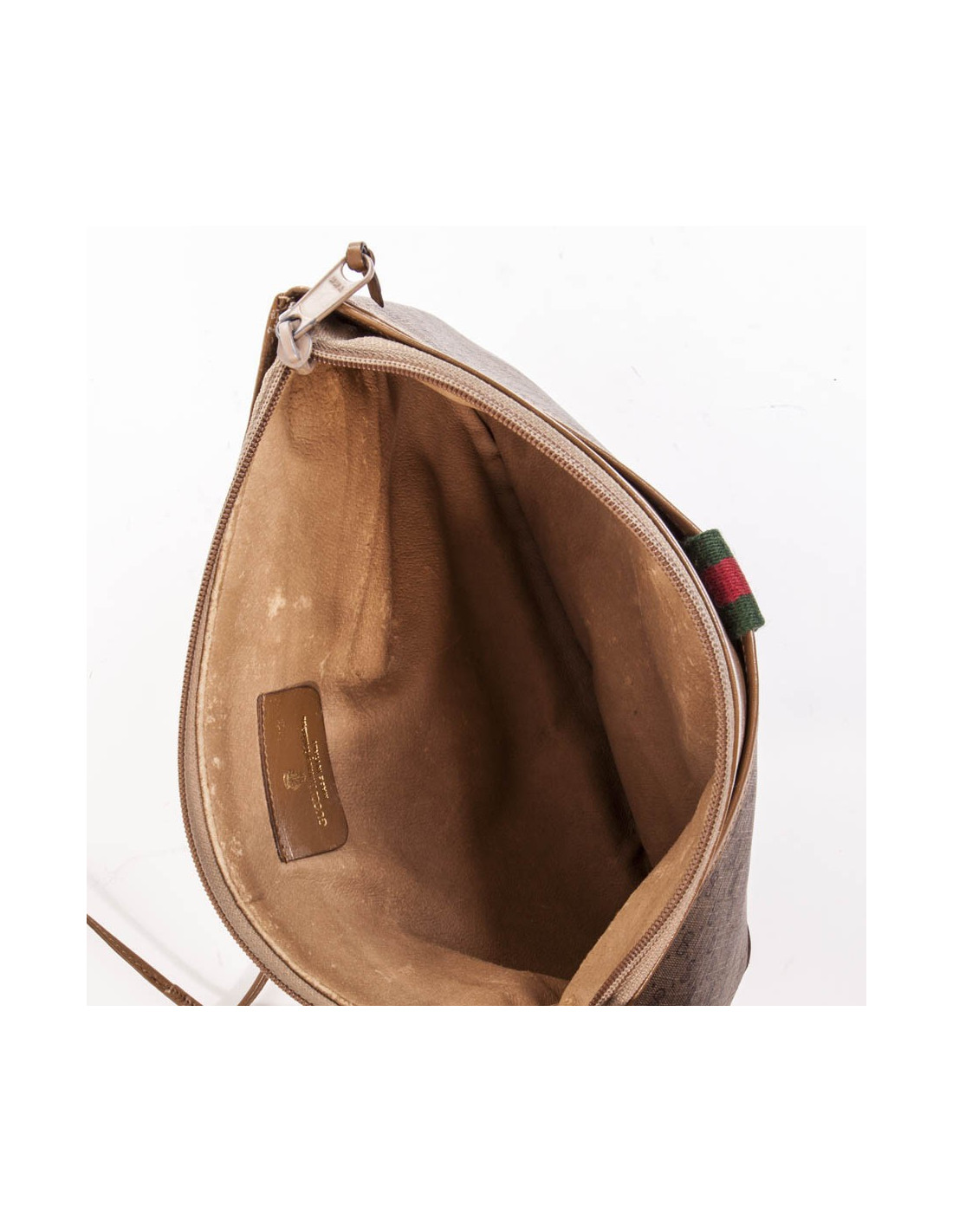 Collector des années 70'. Sac Gucci en toile GG et toile uni couleur beige se ferme à l'aide d'un zip, une grande poche sur le devant se ferme à l'aide d'une pression agrémentée d'une médaille siglée GG et une patte en toile aux rayures emblématiques de la Maison vert et rouge. Une grande poche dans le dos également.