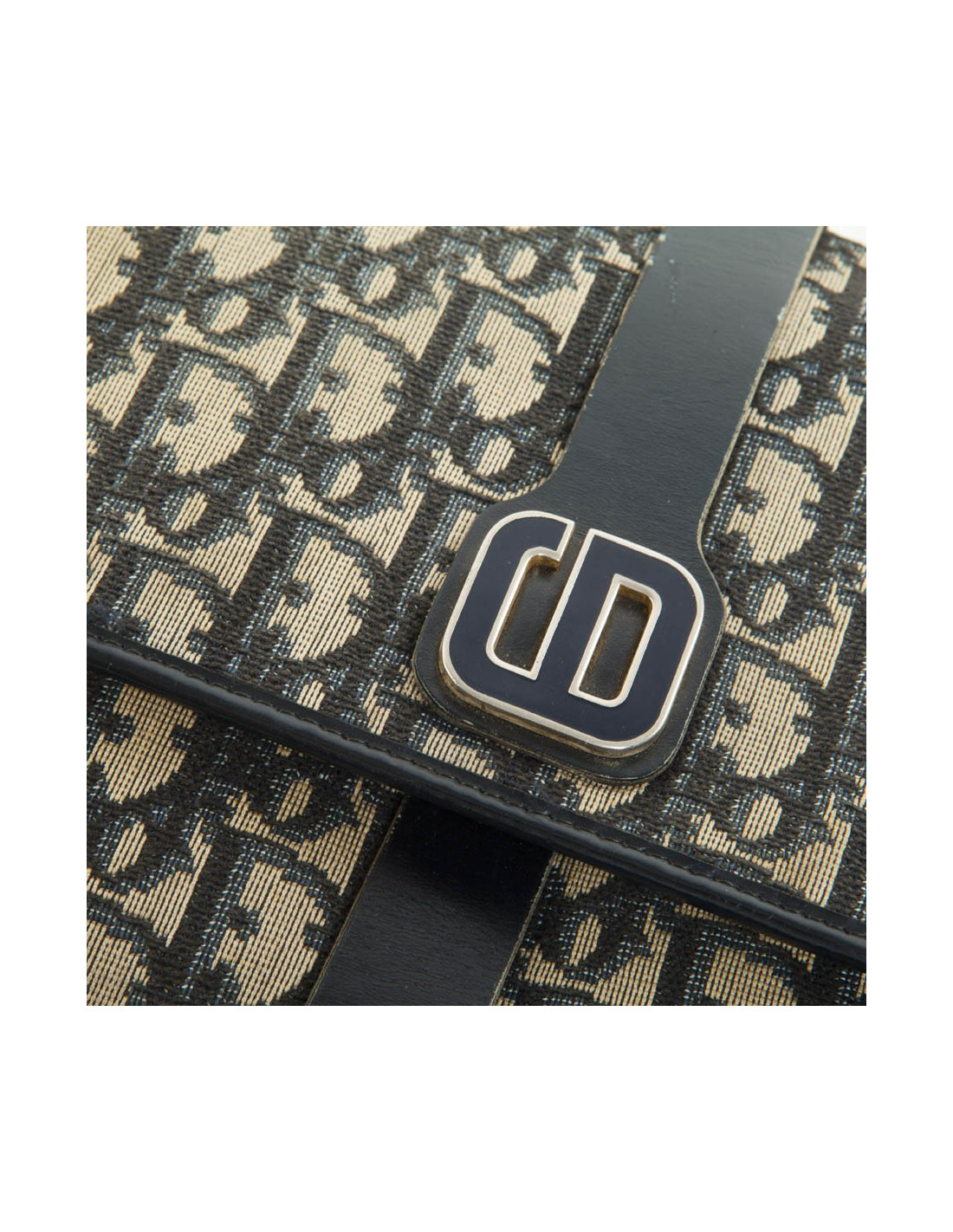 Sac Dior en toile Dior oblique bleu marine et gris, entouré d'une bande de cuir bleu marine agrémentée d'une boucle CD en métal argenté émaillée bleu.