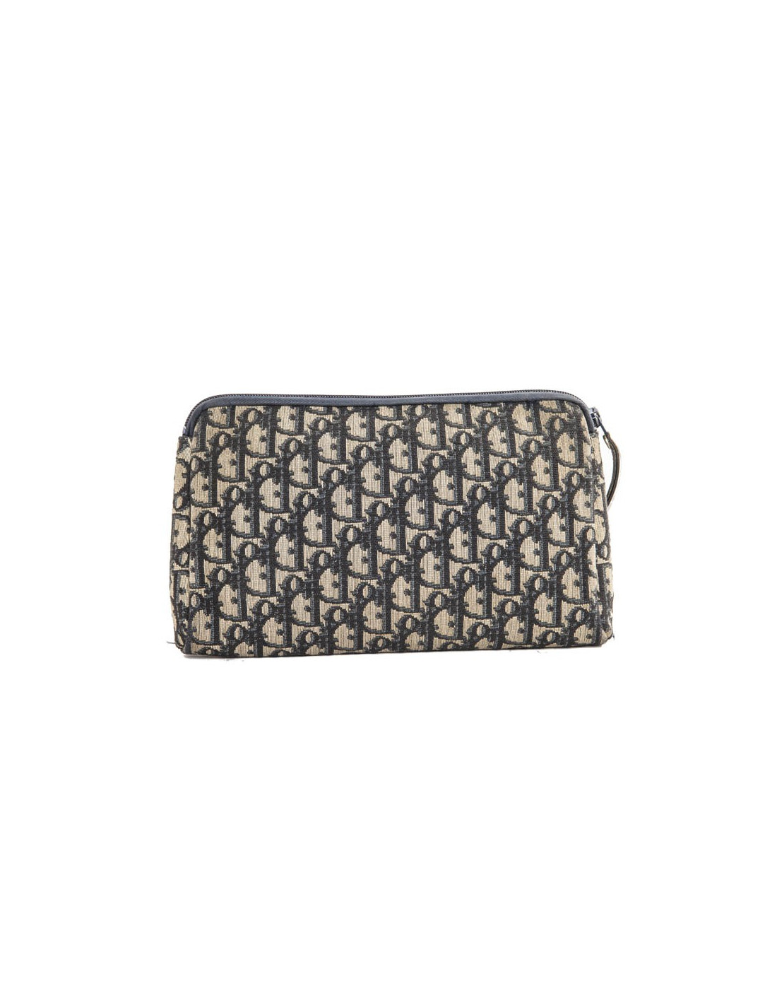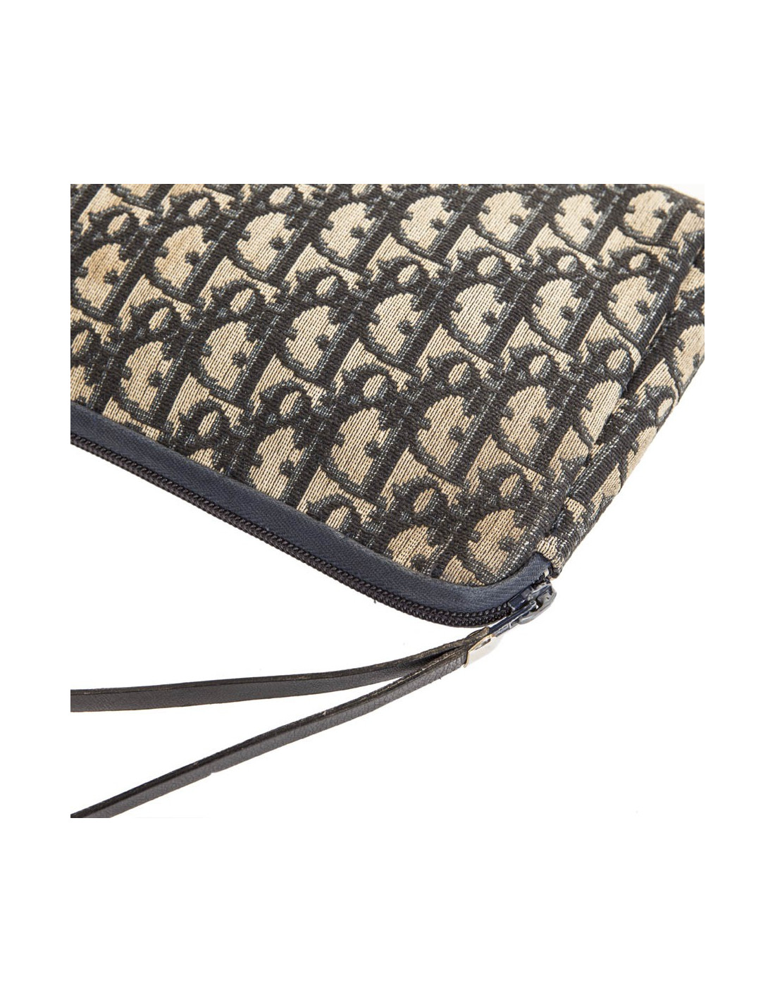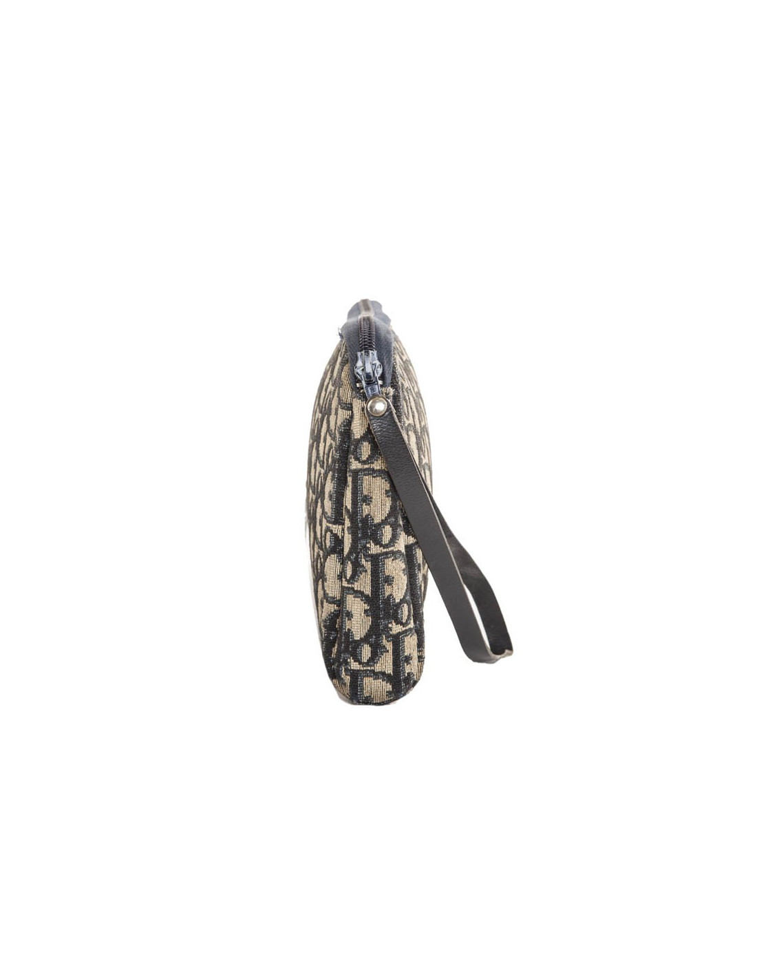 Pochette Dior en toile Dior oblique bleu gris, elle se ferme par un zip et se tient au poignet à l’aide d’une dragonne en cuir bleu. L’intérieur est en toile bleu marine. Usure d’usage dû à son age.