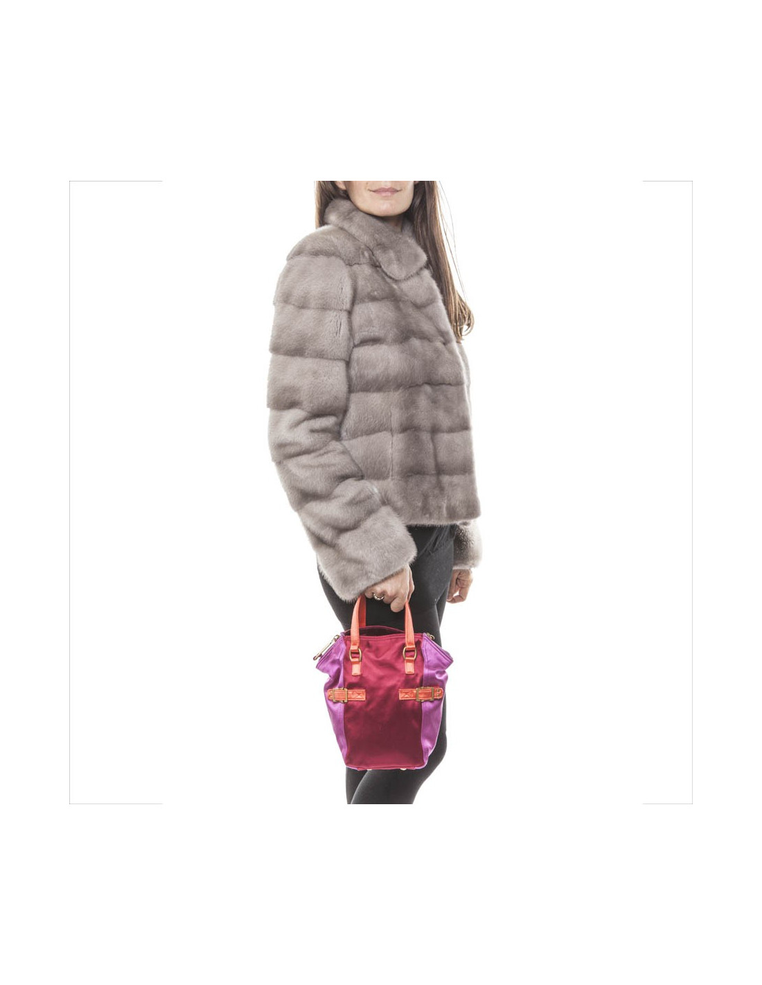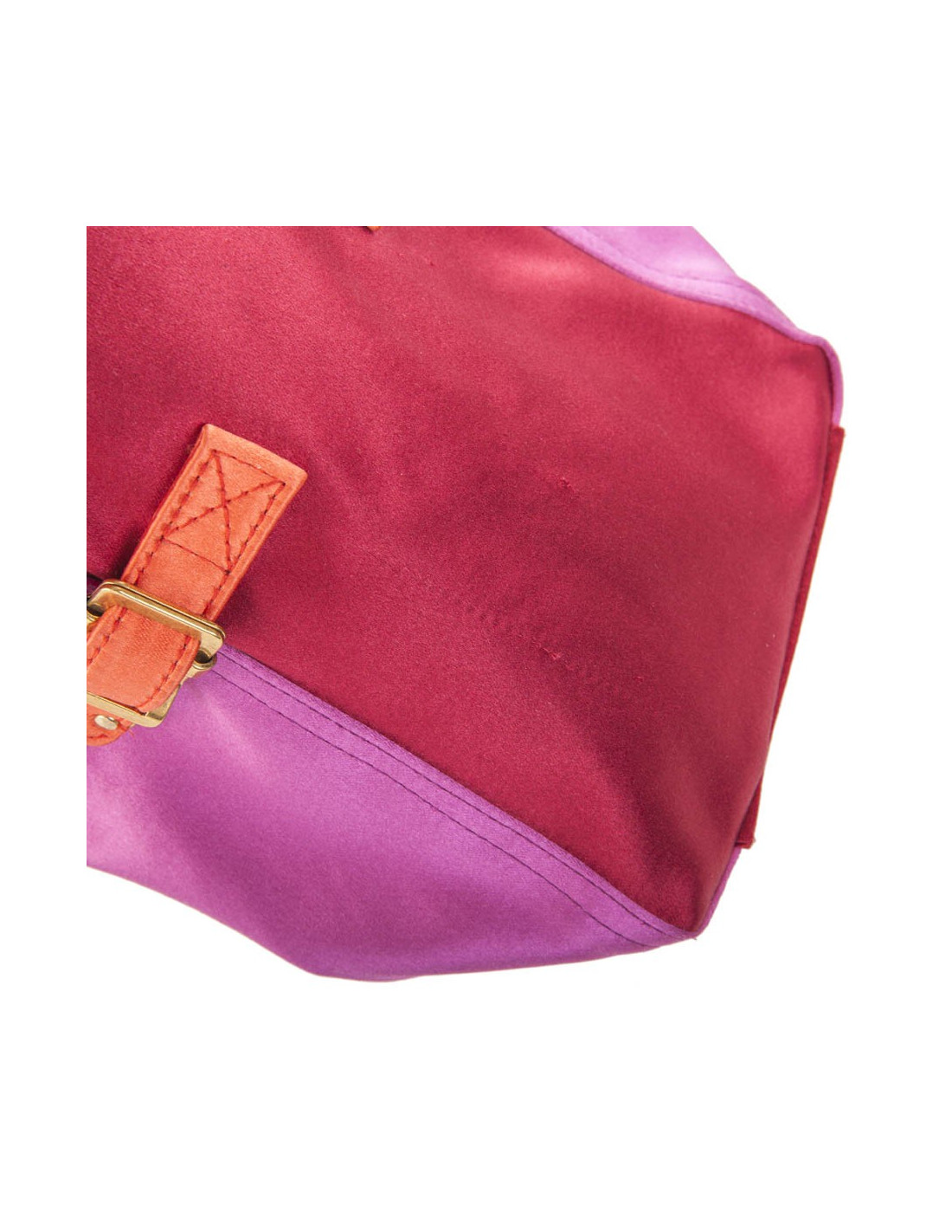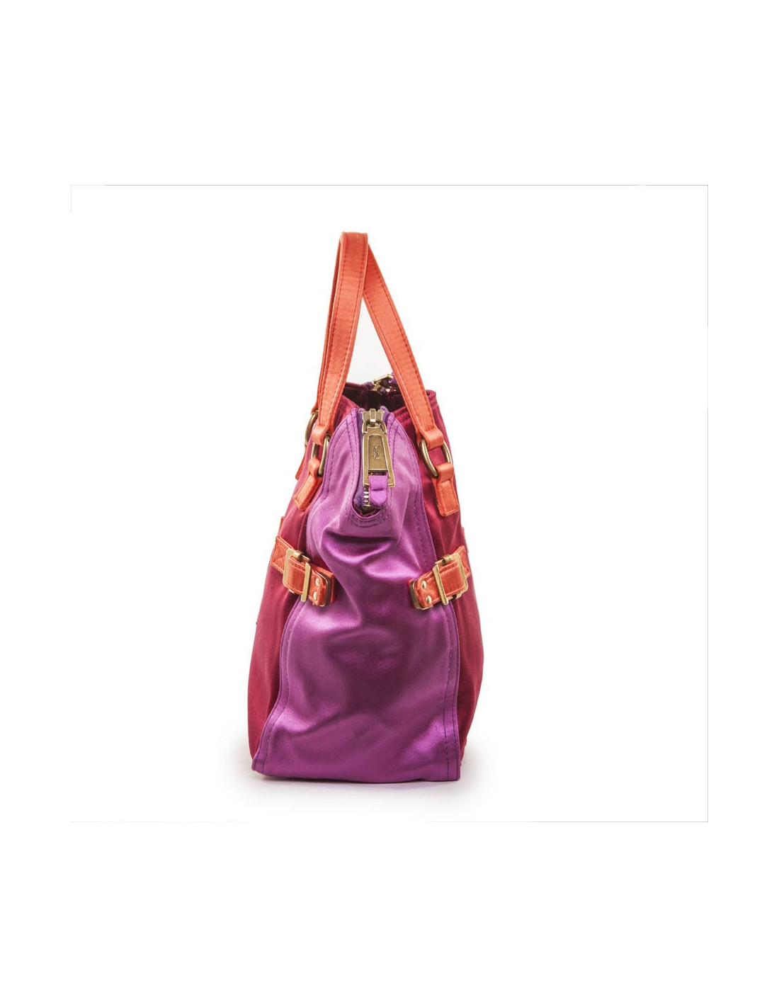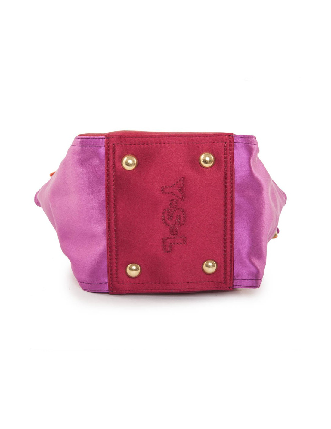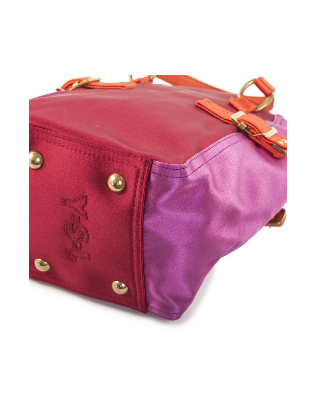Petit sac Down Town YSL Yves Saint Laurent vintage en satin tricolore rouge, orange et fushia. Trois fils tirés sur l'arrière. L'intérieur est impeccable. Très bon état général. S des soldes Saint Laurent.