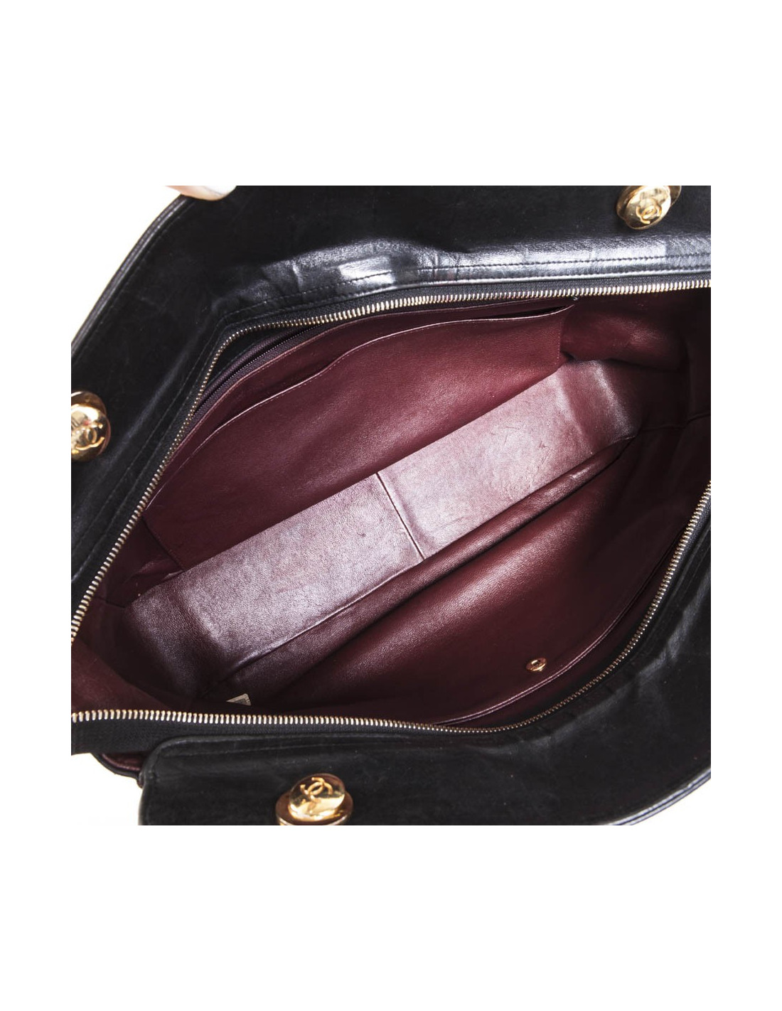 Sac cabas Chanel vintage en cuir noir matelassé. Fermeture par zip. L'intérieur est doublé de cuir bordeaux avec 3 poches plaquées dont 1 zippée. Hologramme: 1380... pas de carte d'authenticité. Porté épaule ou en crossover à l'aide de deux anses. En très bon état. Quelques marques d'usure sous le sac. Ainsi que quelques tâches à l'intérieur d'une des poches intérieures.