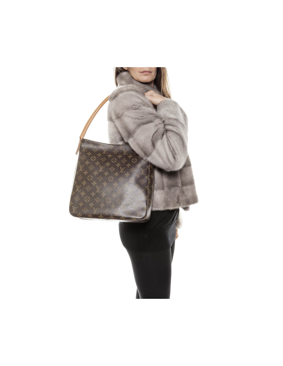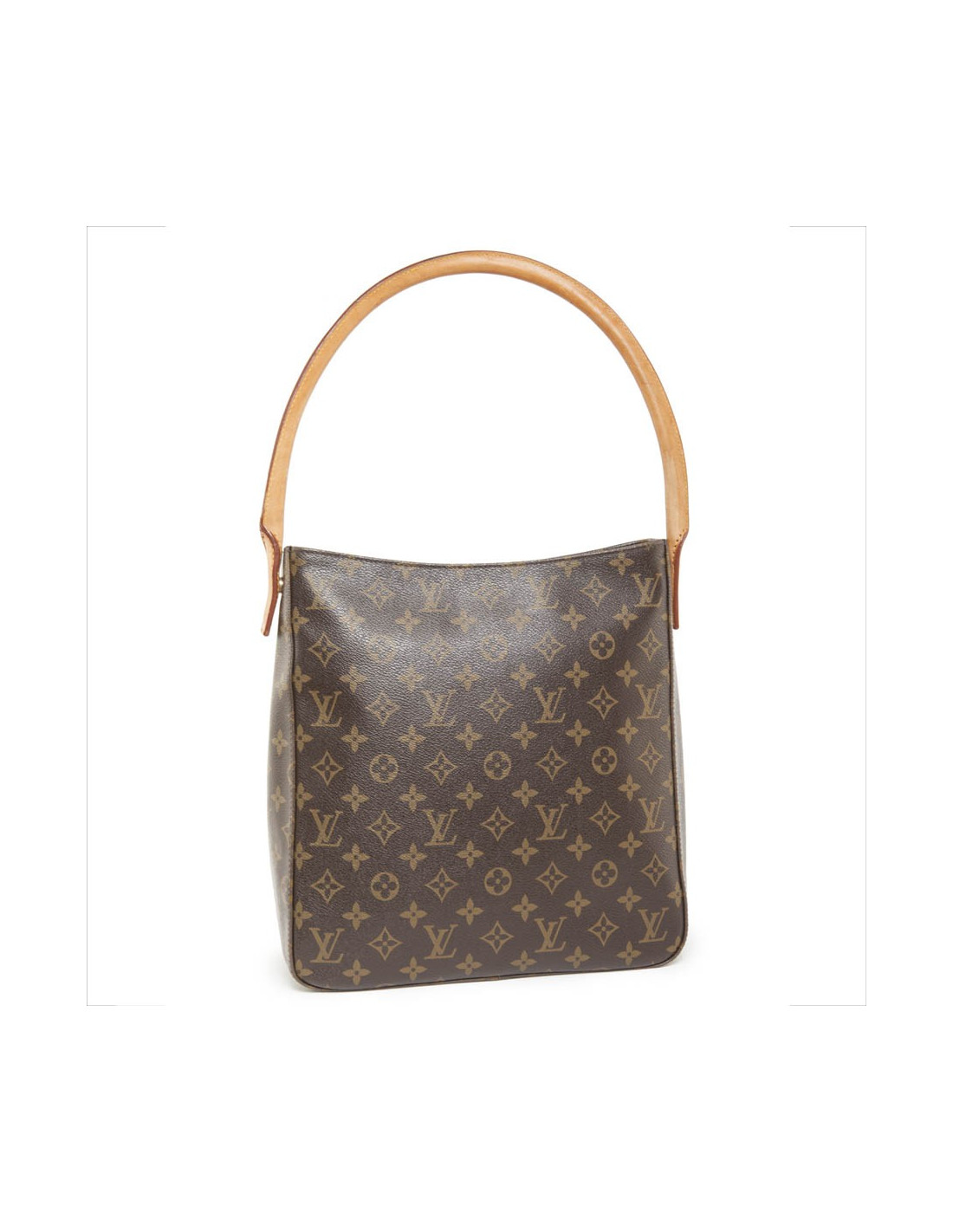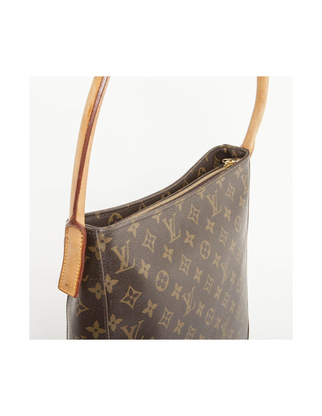 Sac 'looping' de la Maison Louis Vuitton en toile monogram marron. Fermeture zippée. Bijouterie dorée. Finitions en cuir de vache naturel. L'intérieur est en tissu marron avec une poche zippée et une poche pour smartphone. En très bon état. Légère patine de l'anse.