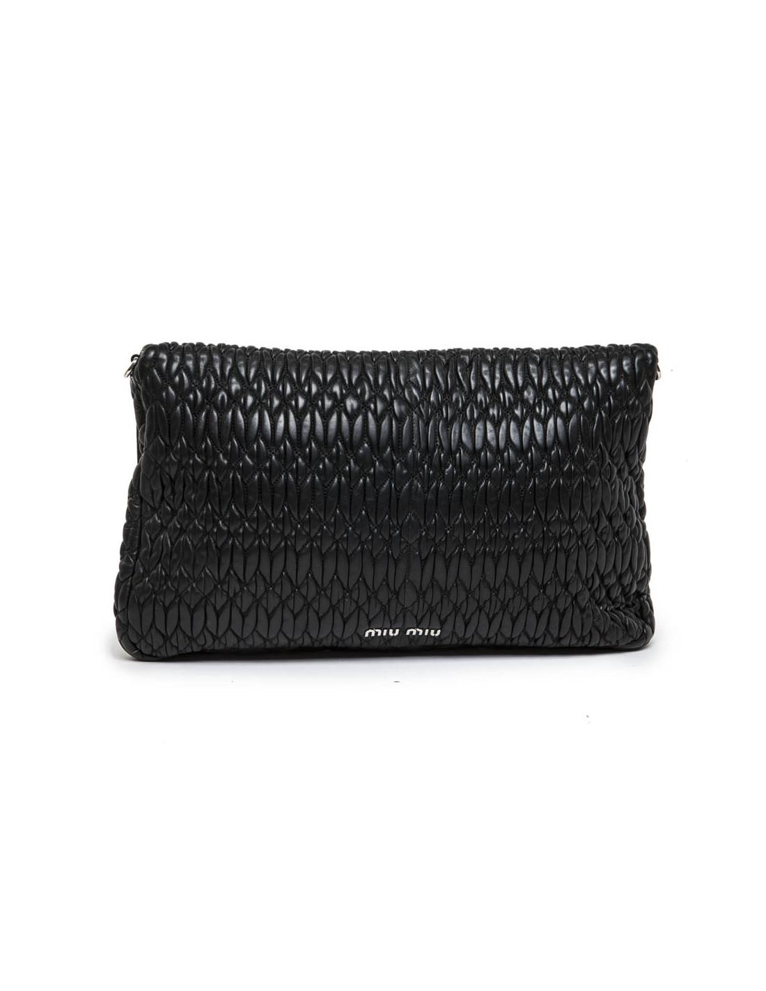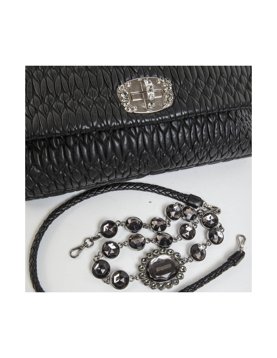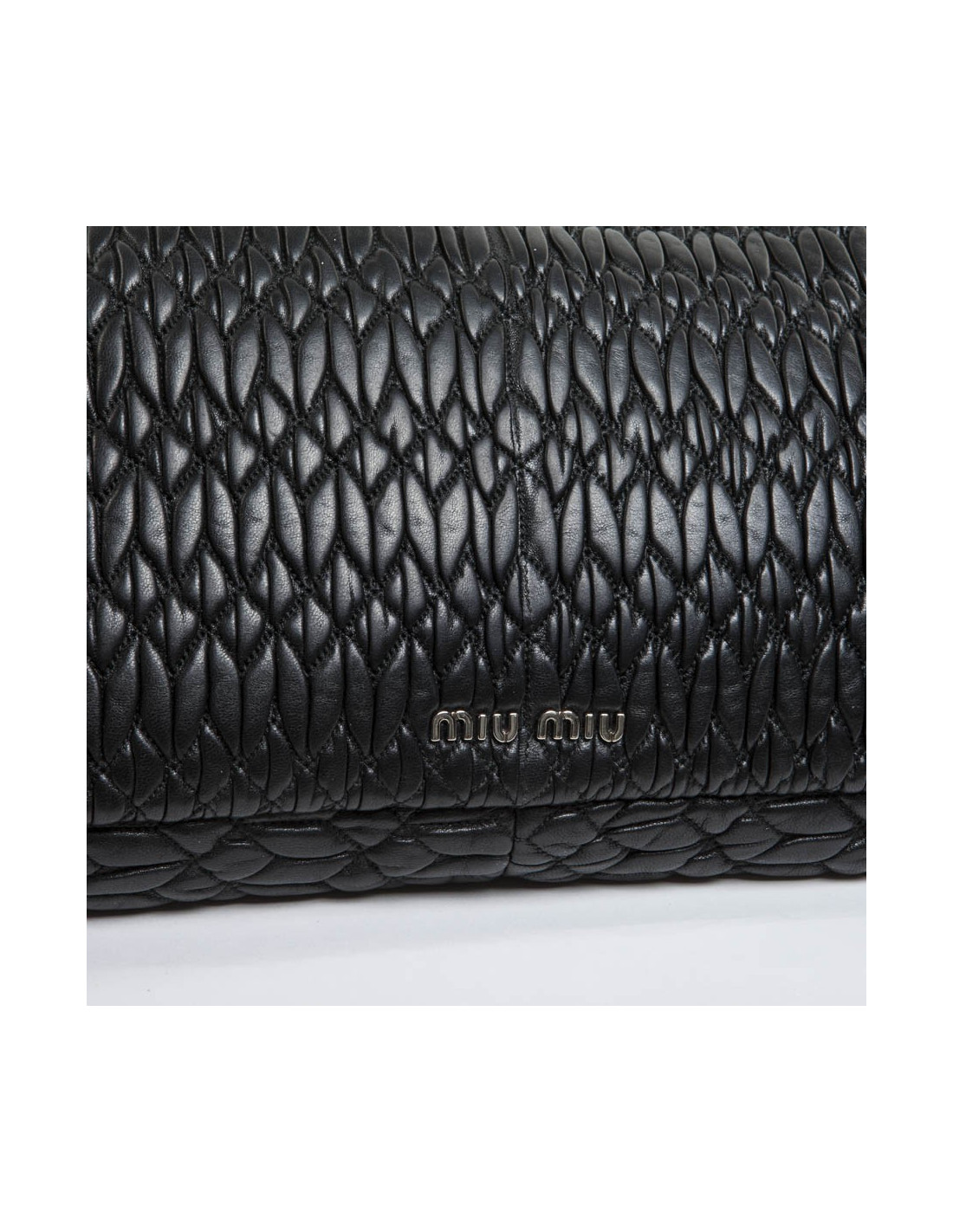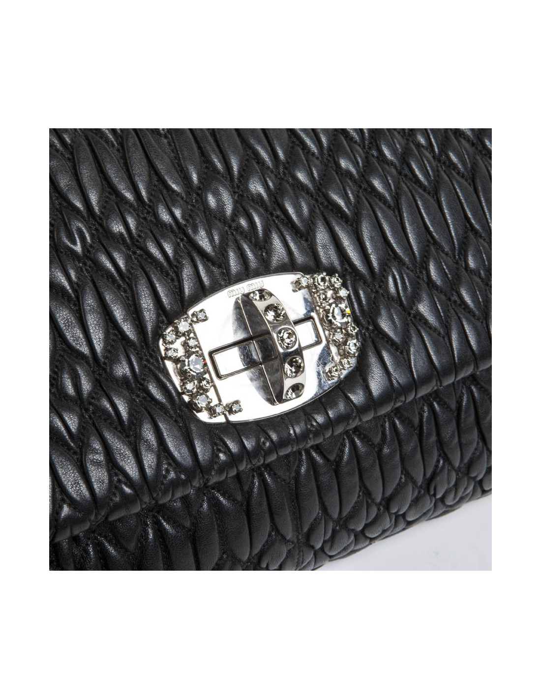 Sac Miu Miu en cuir tressé noir. Bijouterie argentée et strass brillant sur le fermoir. L'intérieur est en tissu noir avec une grande poche zippée. Porté épaule, en crossover ou à la main à l'aide d'une bandoulière amovible. En très bon état.