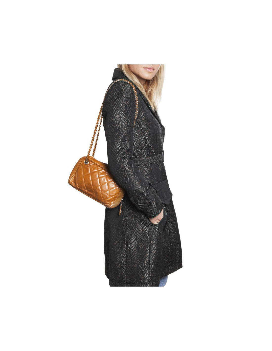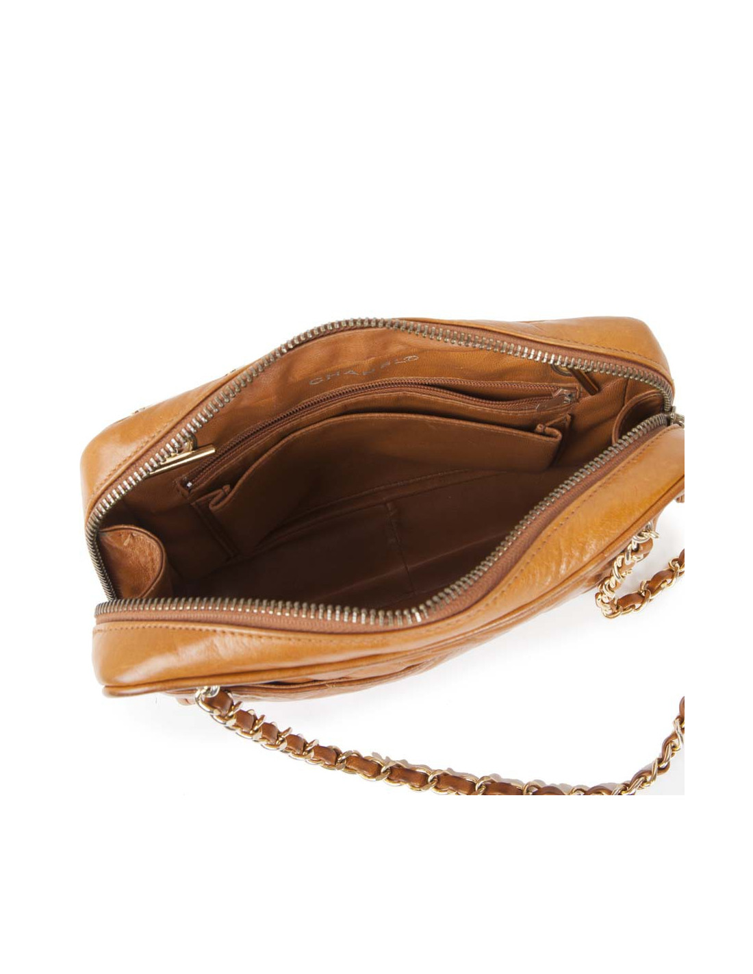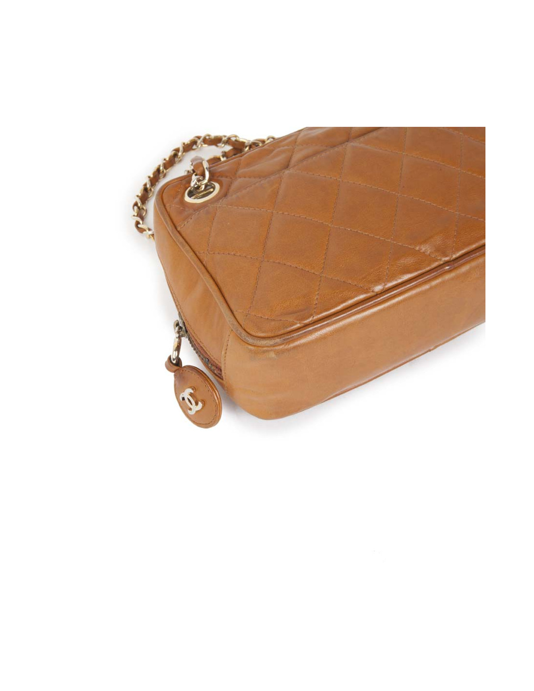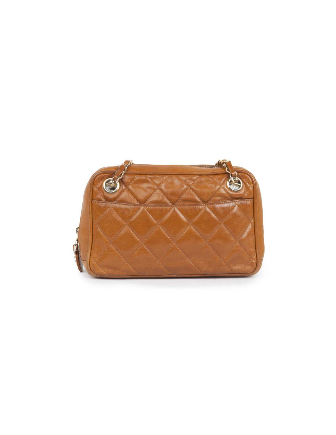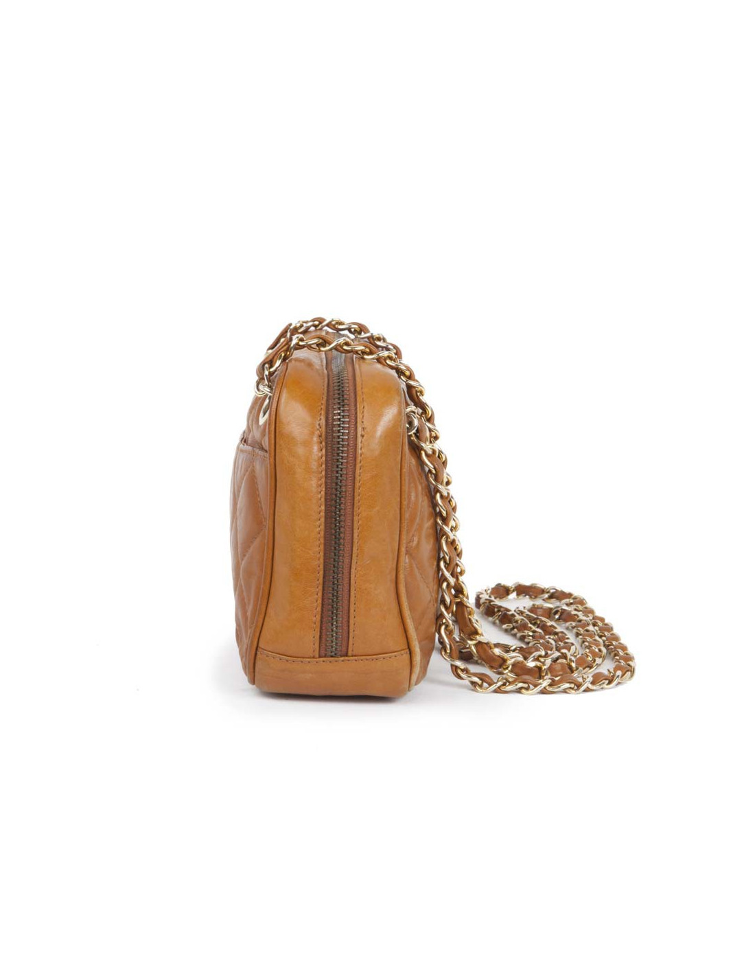 Vintage ! Sac mini caméra de la Maison Chanel en cuir matelassé camel. Bijouterie dorée. Fermeture zippée.
