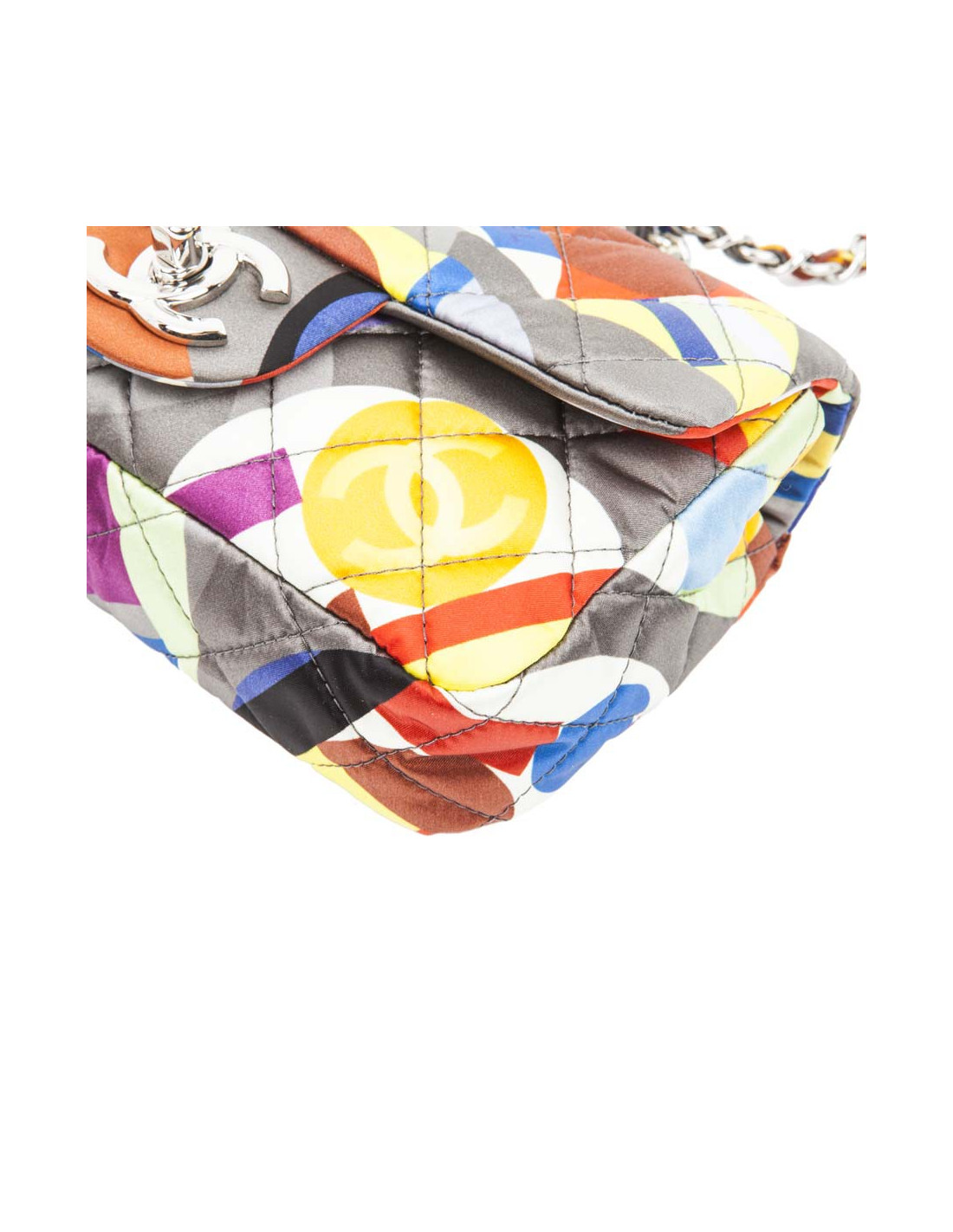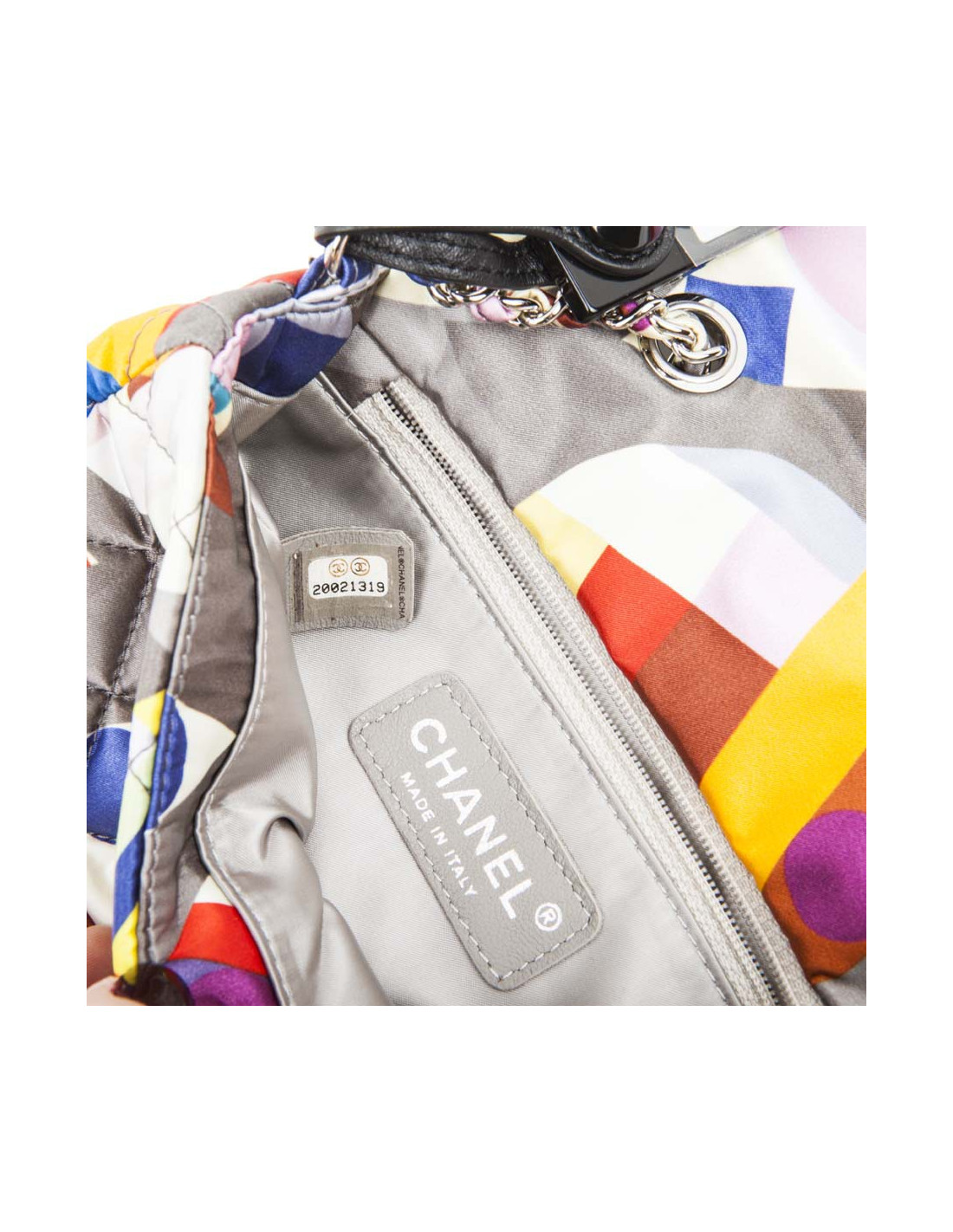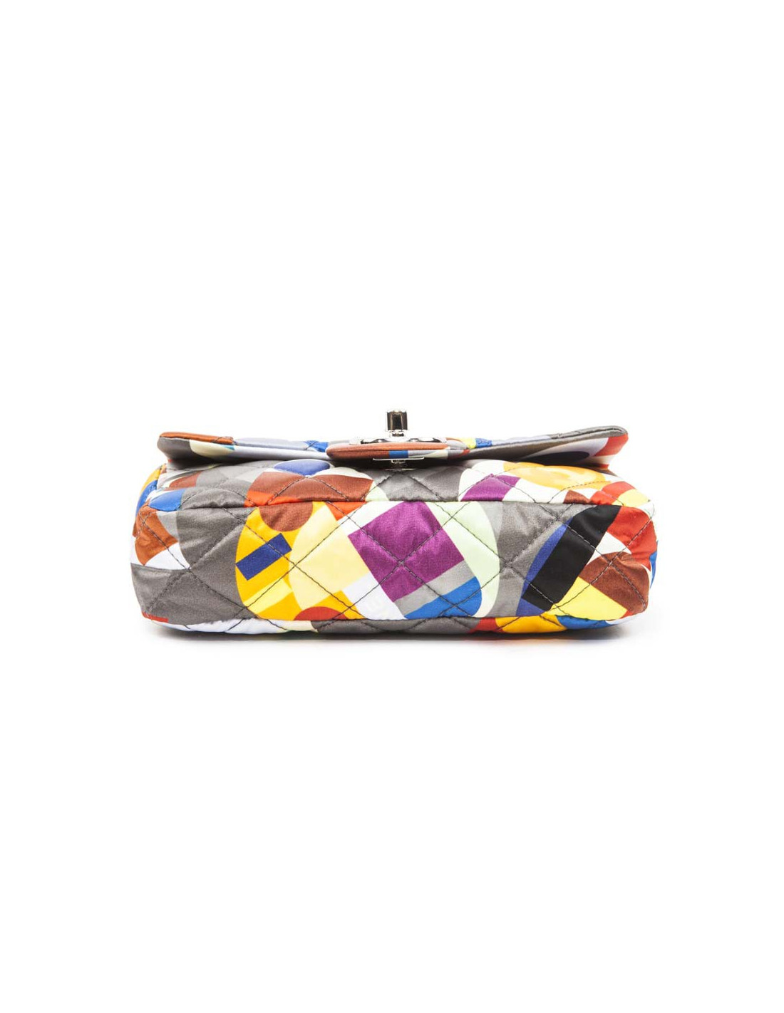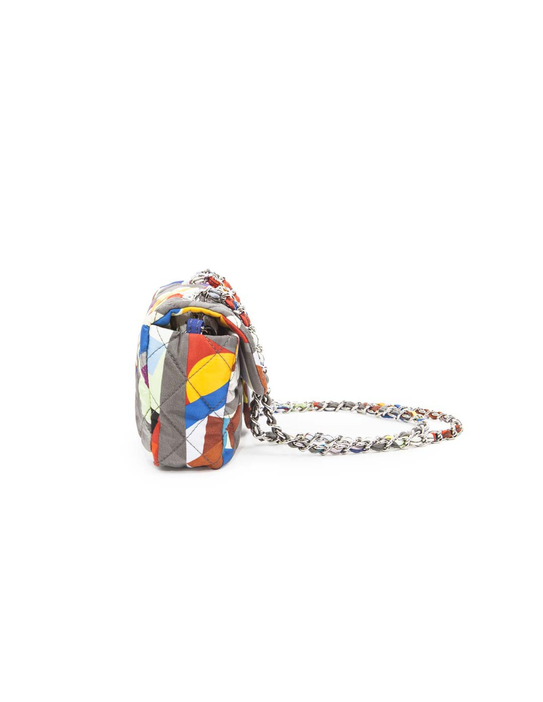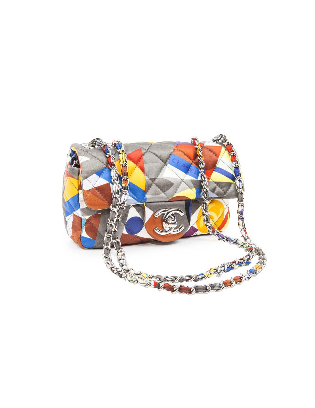Sac de la Maison Chanel en soie géométriques multicolores. Bijouterie argentée. Fermoir CC. Porté crossover ou à l'épaule. Hologramme : 2002.... pas de carte d'authenticité. Etat neuf.