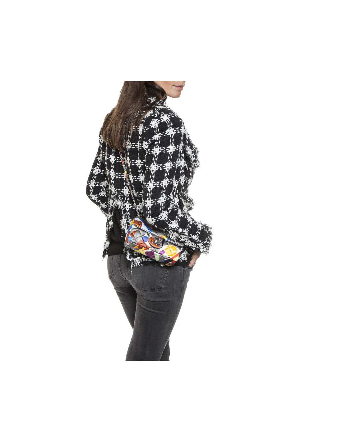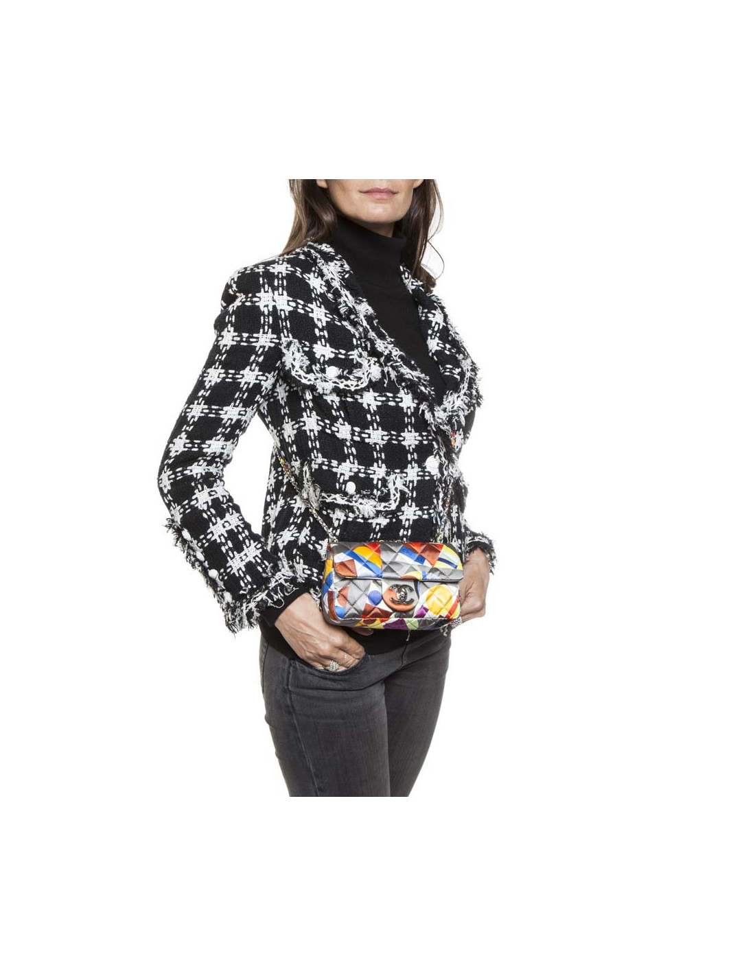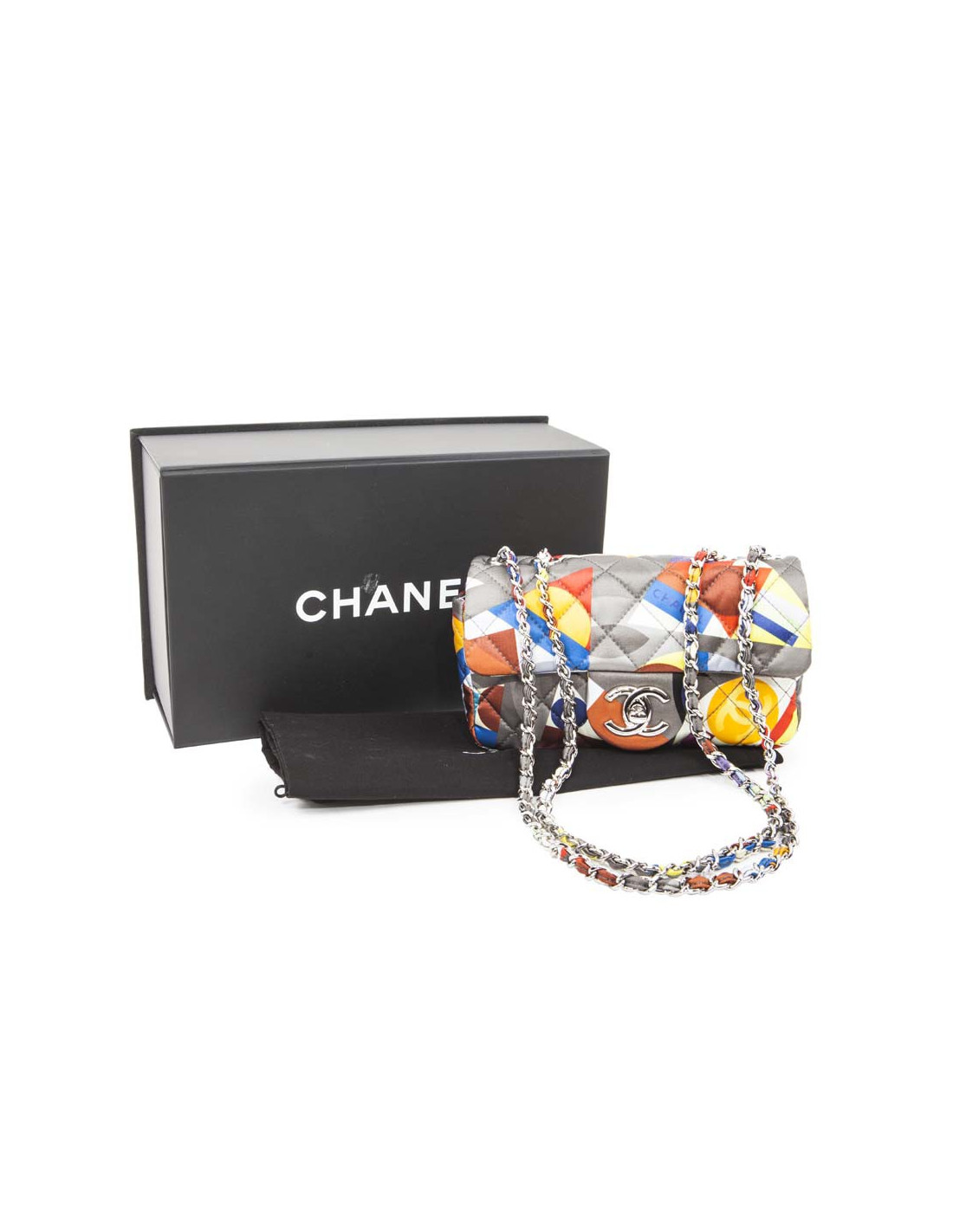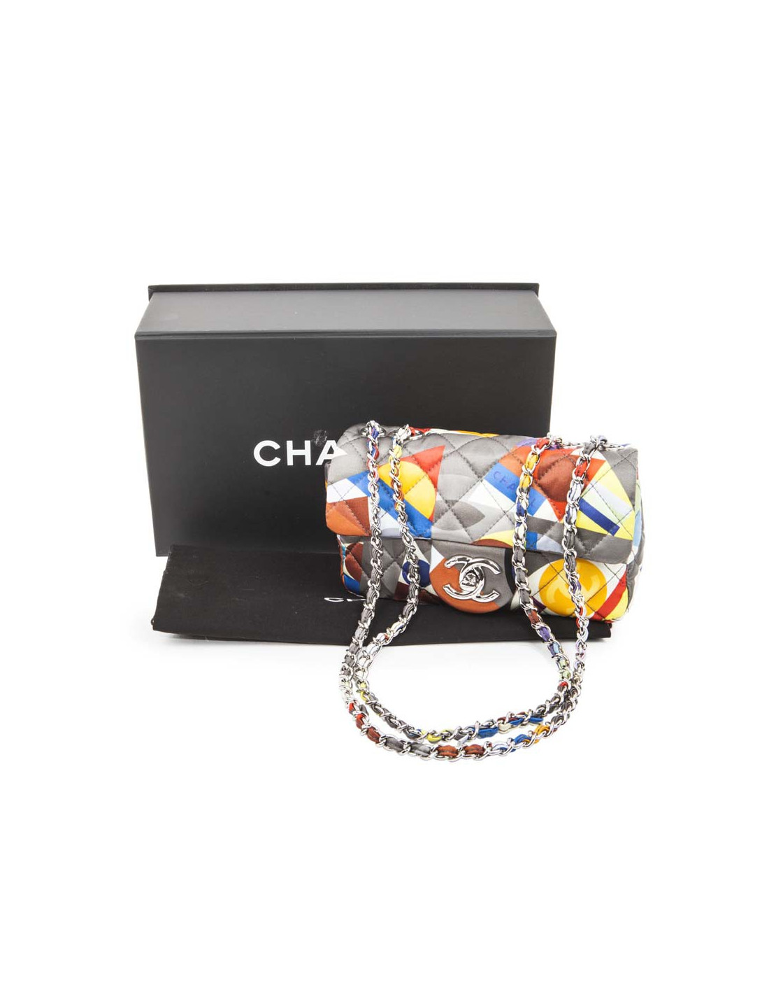 Sac de la Maison Chanel en soie géométriques multicolores. Bijouterie argentée. Fermoir CC. Porté crossover ou à l'épaule. Hologramme : 2002.... pas de carte d'authenticité. Etat neuf.