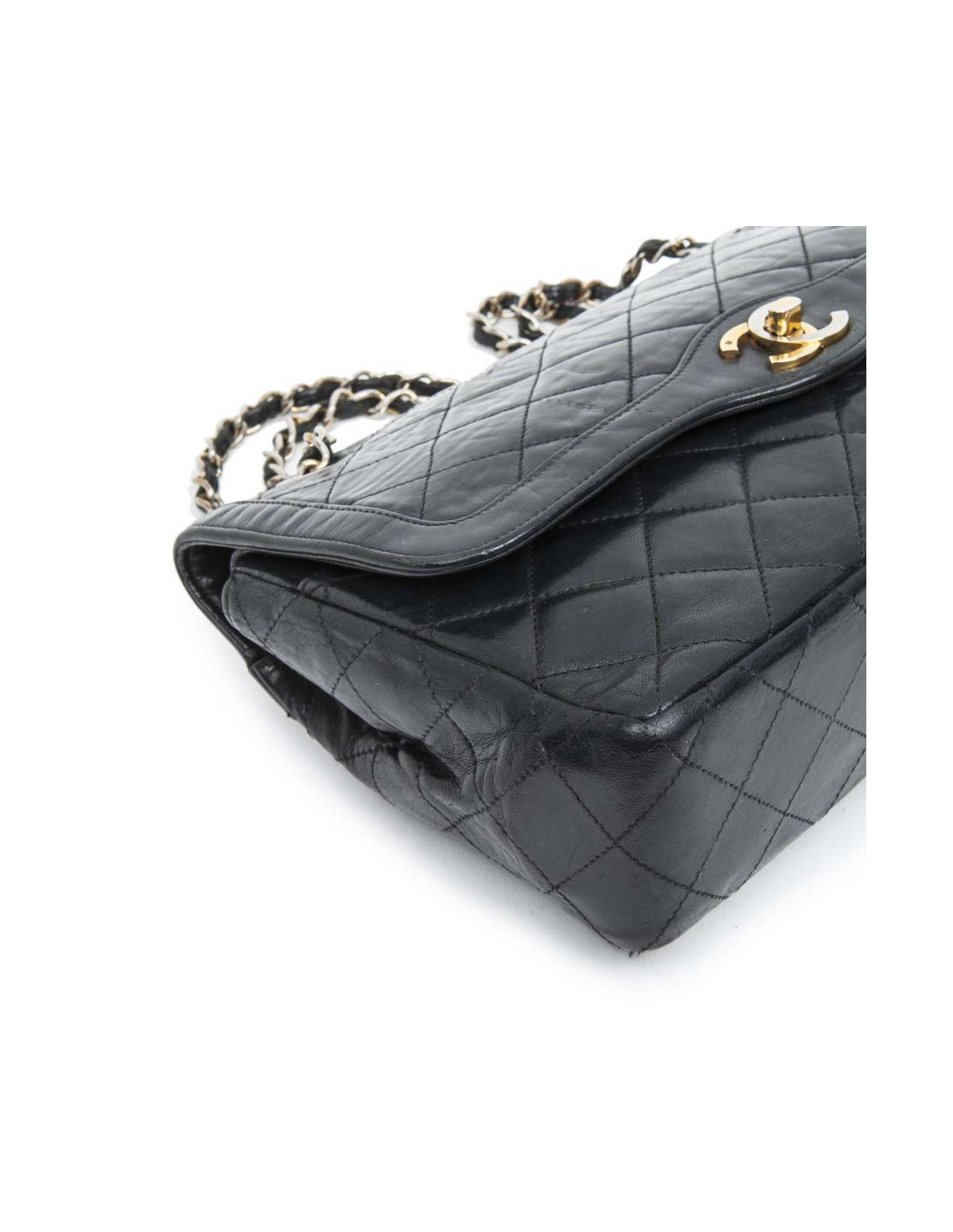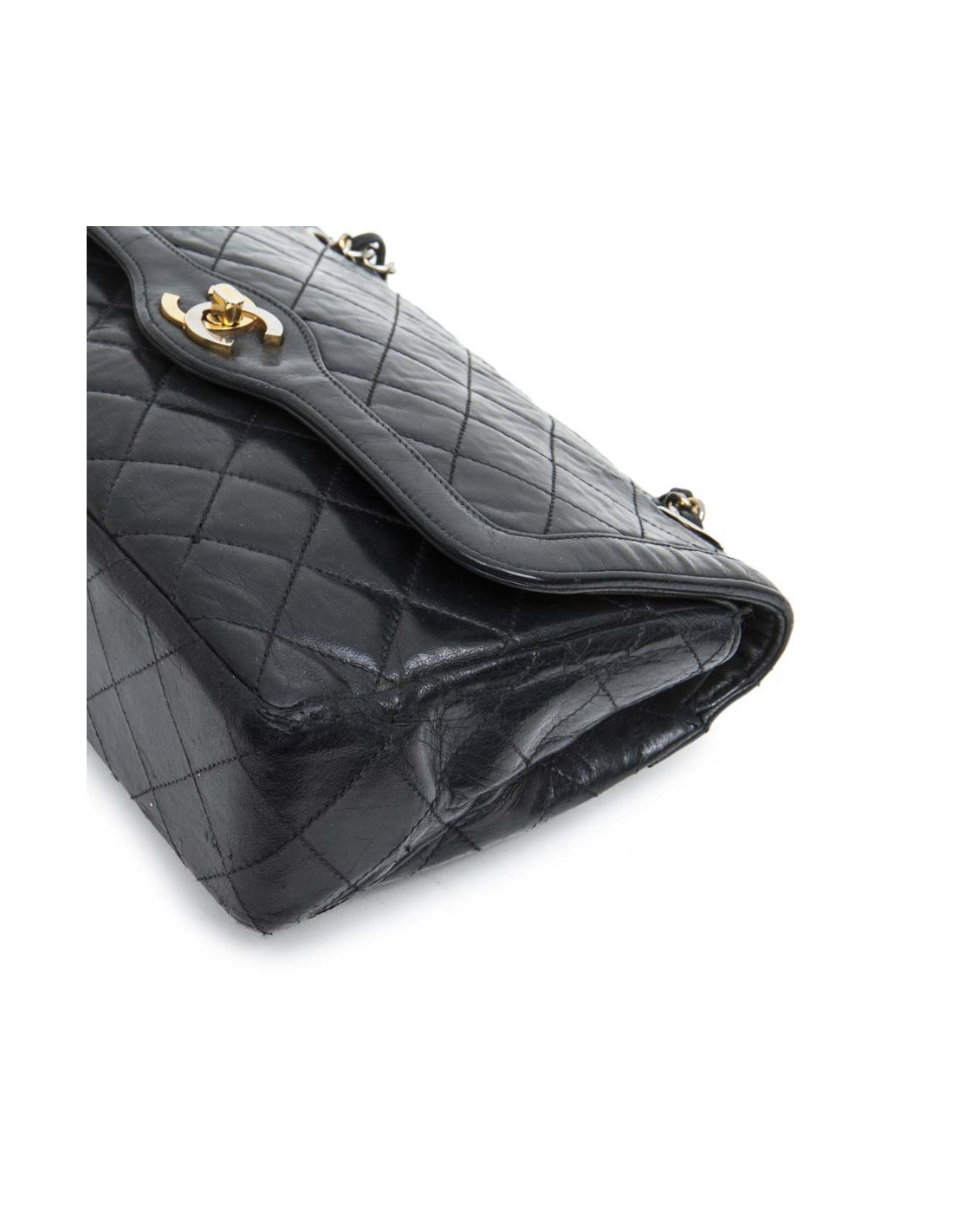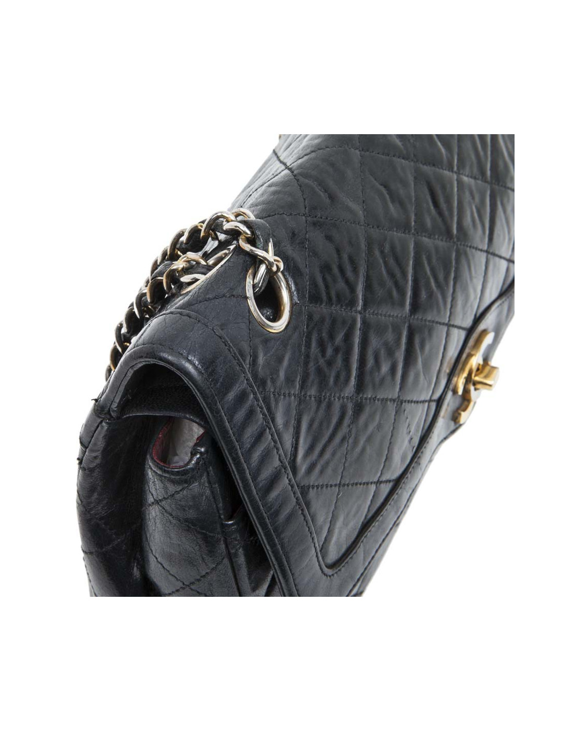Vintage couture ! Sac 'Timeless' en cuir matelassé noir bleu nuit de la Maison Chanel. Double rabat. L'intérieur est en cuir lisse bordeaux. Porté épaule. Etat vintage. Légère usure des coins sous le sac.
