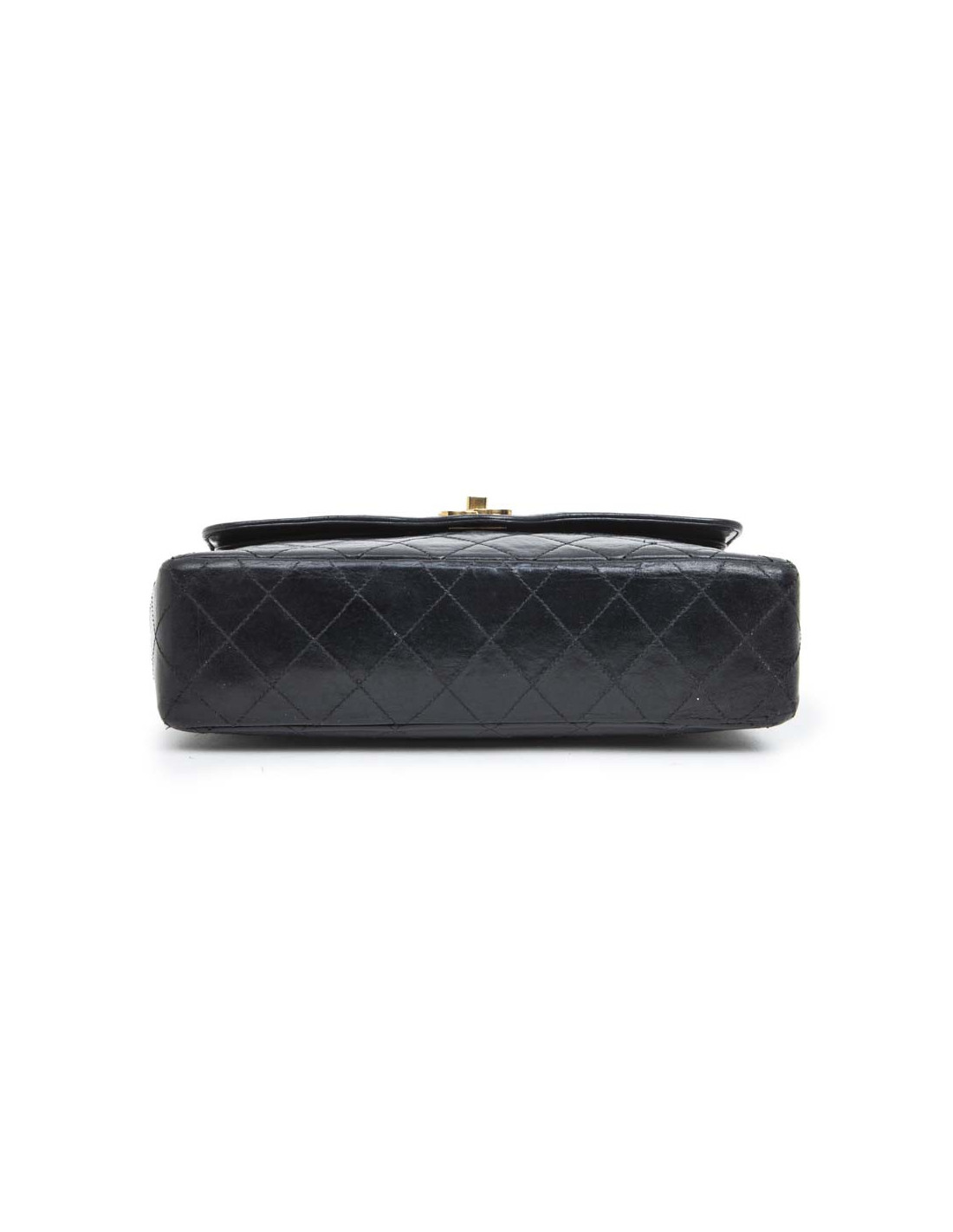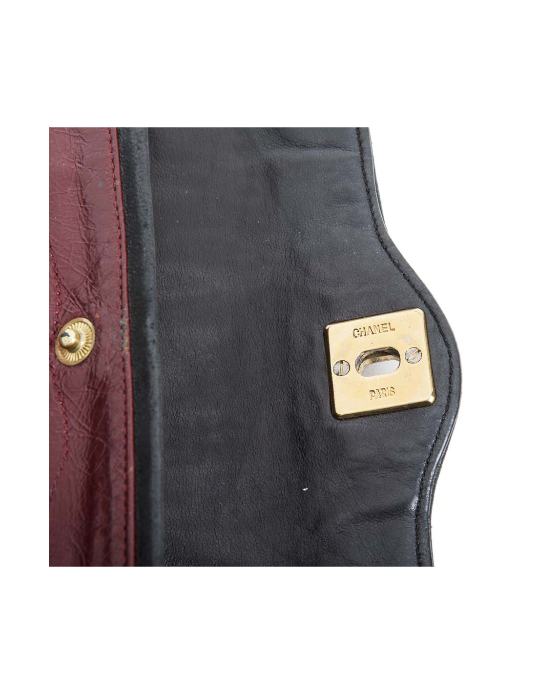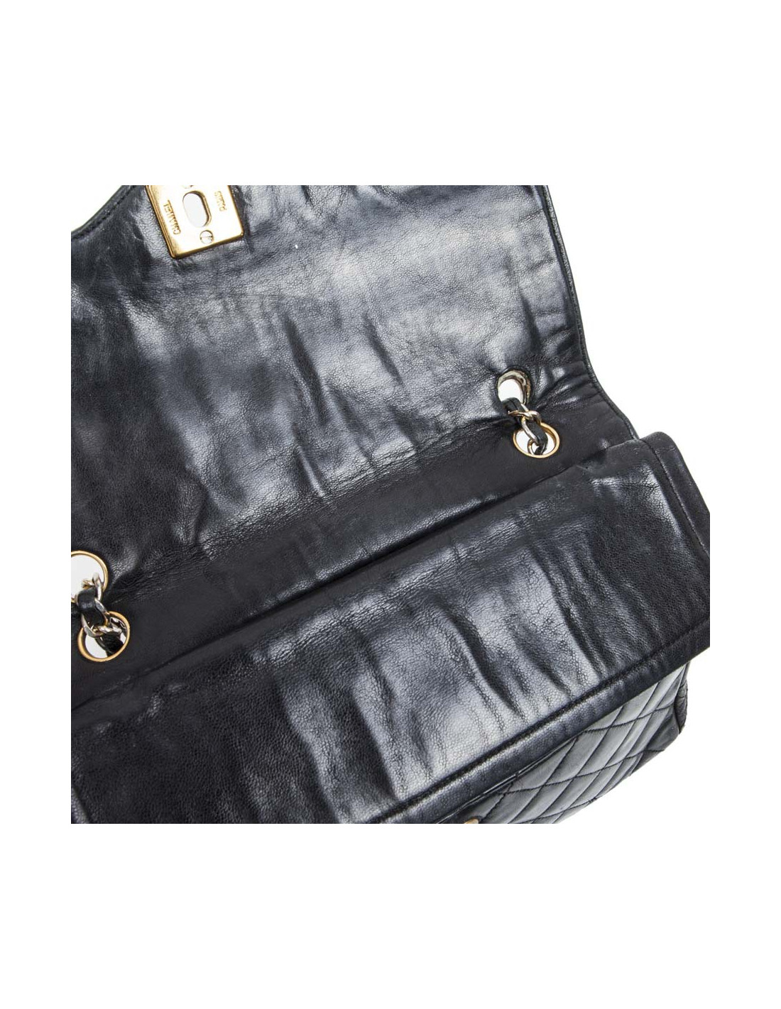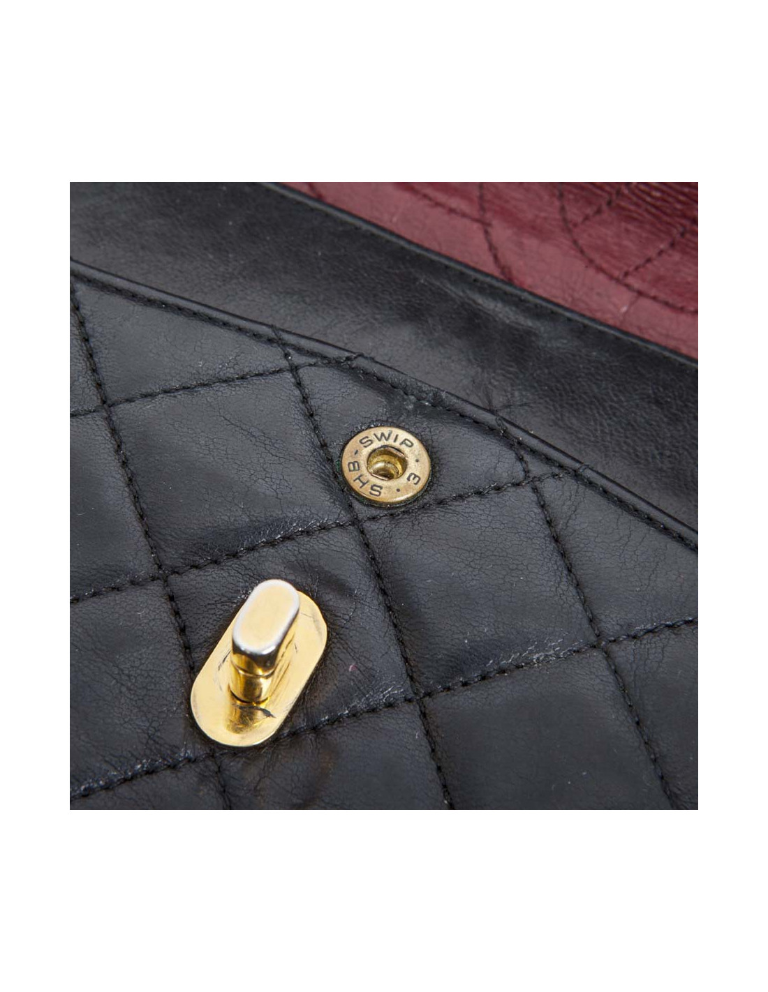 Vintage couture ! Sac 'Timeless' en cuir matelassé noir bleu nuit de la Maison Chanel. Double rabat. L'intérieur est en cuir lisse bordeaux. Porté épaule. Etat vintage. Légère usure des coins sous le sac.