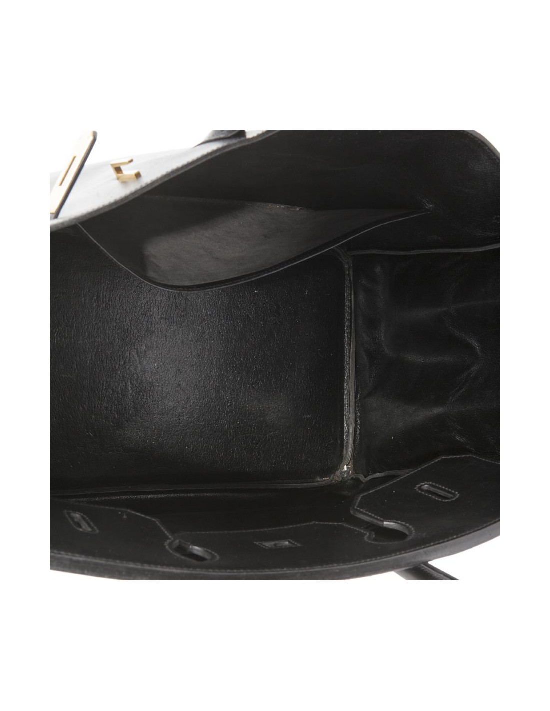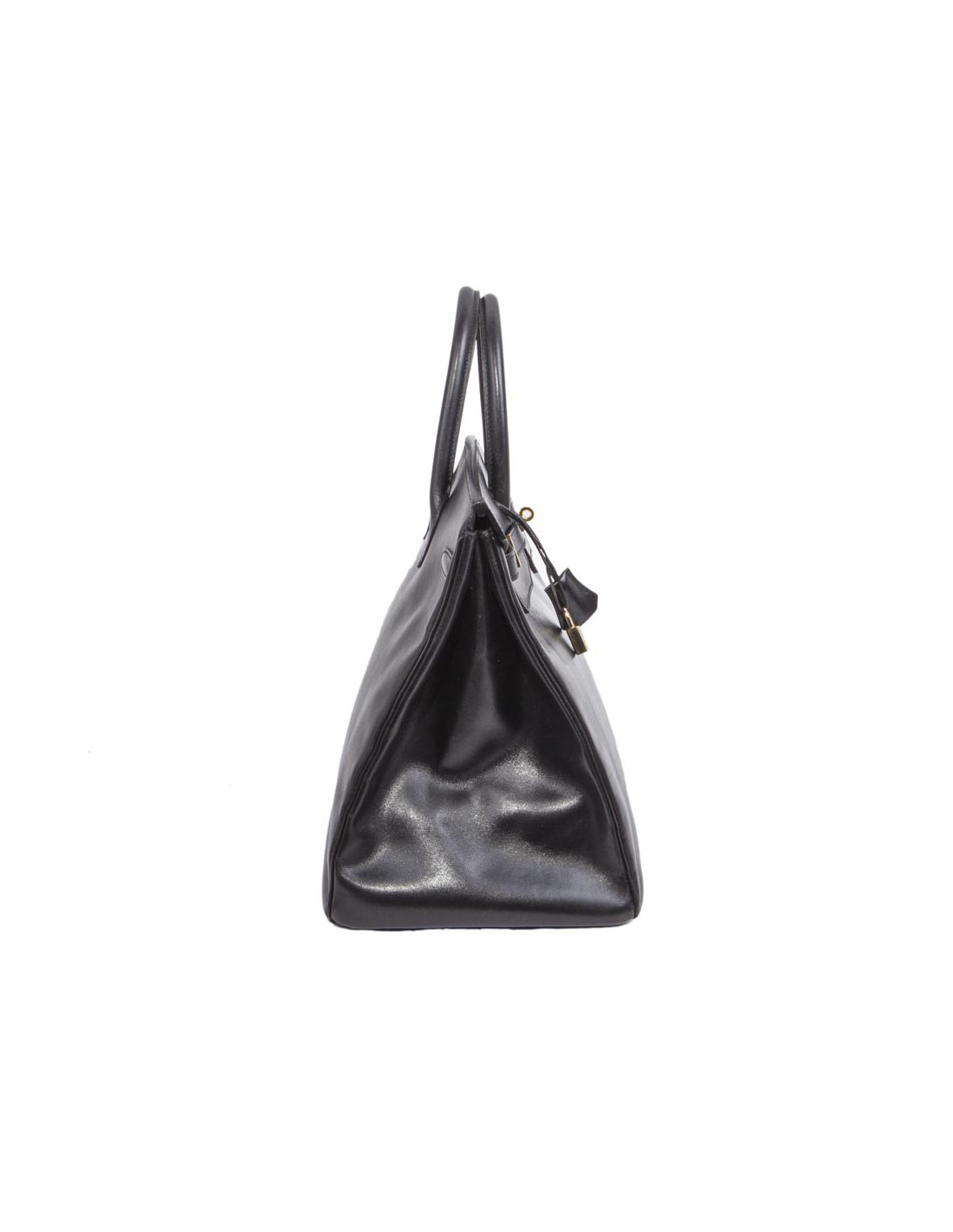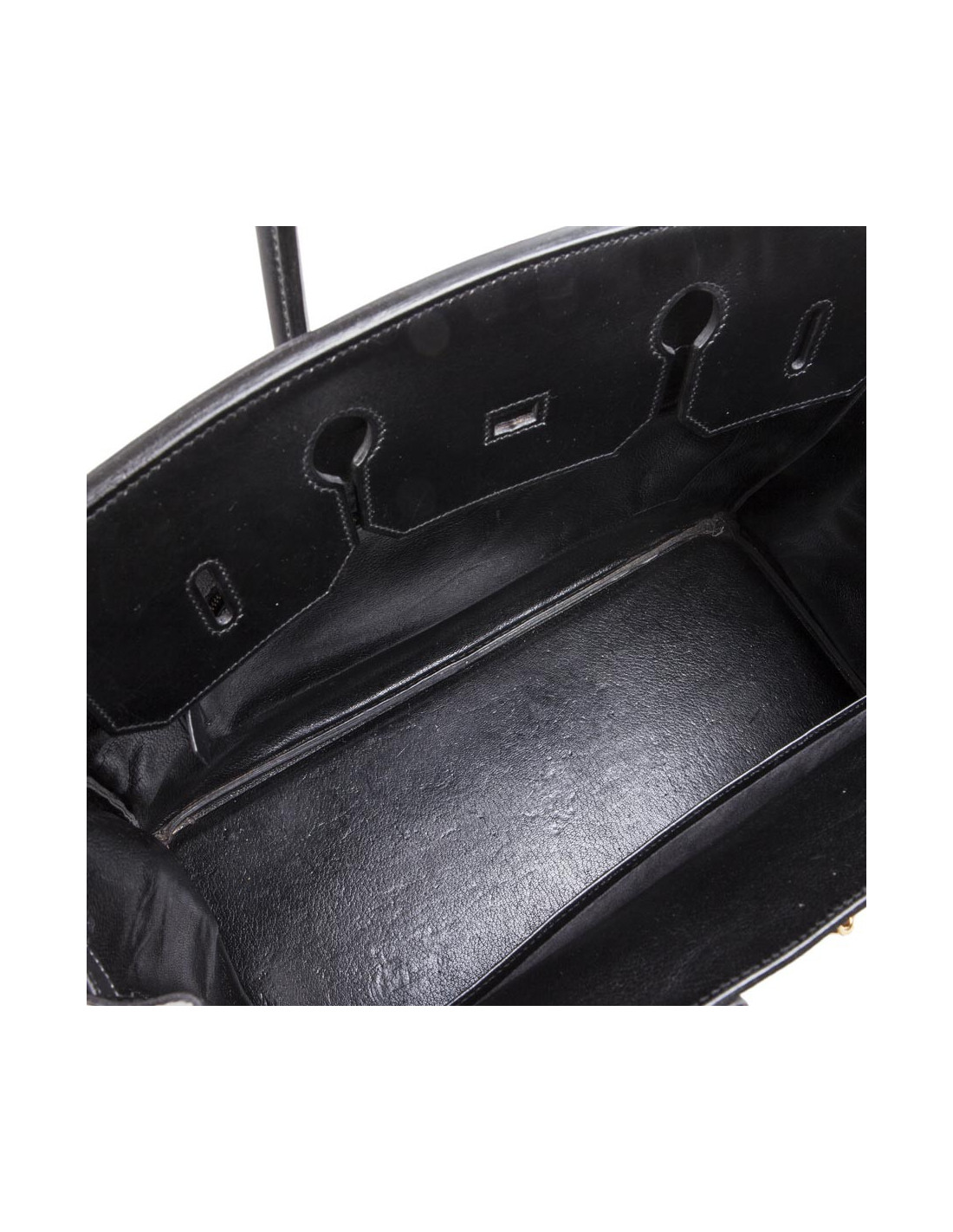 Sac 'Birkin 40' de la Maison Hermès en cuir box noir. Garniture en métal doré. Double poignée permettant un porté main. Fermeture par rabat. Doublure intérieure en cuir noir avec une poche zippée et une poche plaquée. Lettre F dans un carré (2002). Tirette, clochette, cadenas et clefs. En très bon état. Quelques marques sur le sac.