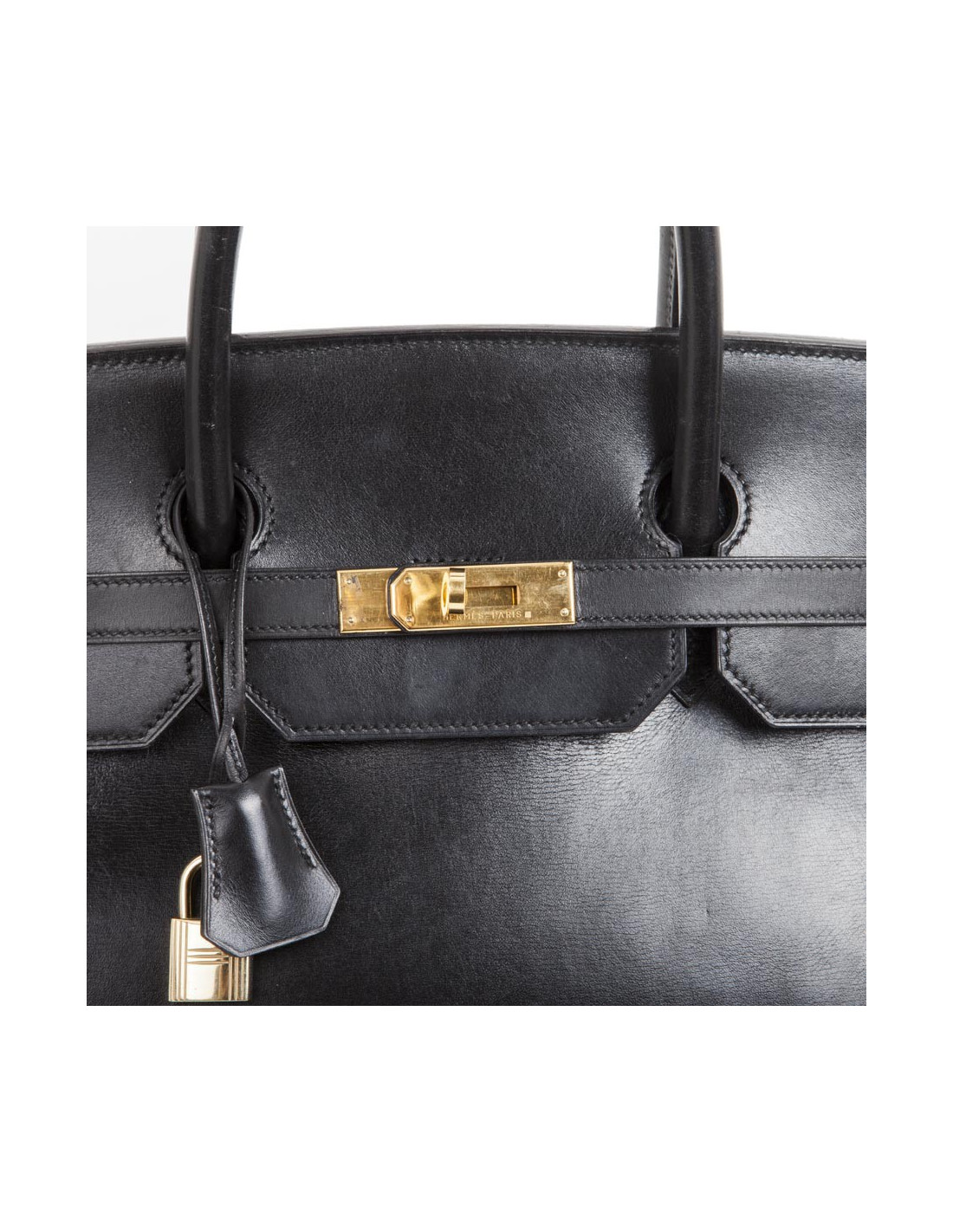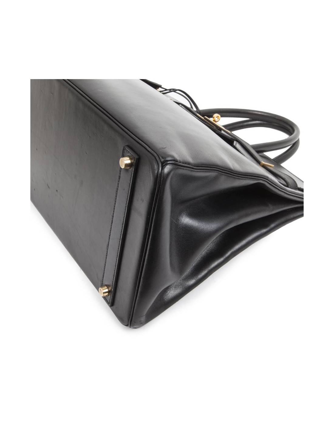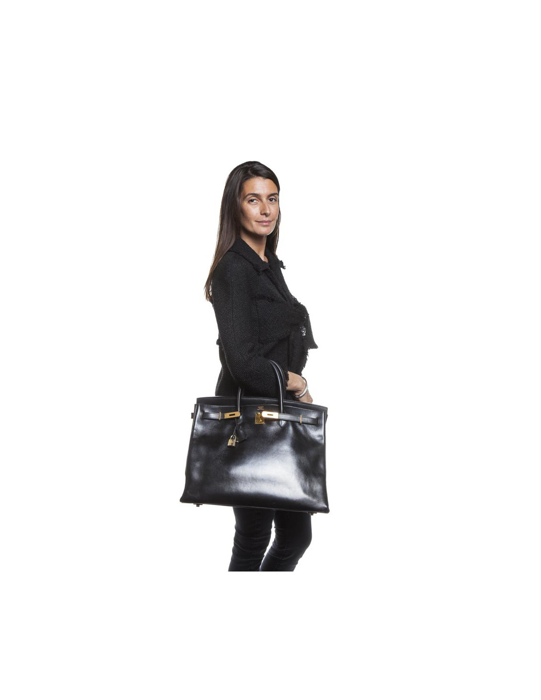 Sac 'Birkin 40' de la Maison Hermès en cuir box noir. Garniture en métal doré. Double poignée permettant un porté main. Fermeture par rabat. Doublure intérieure en cuir noir avec une poche zippée et une poche plaquée. Lettre F dans un carré (2002). Tirette, clochette, cadenas et clefs. En très bon état. Quelques marques sur le sac.