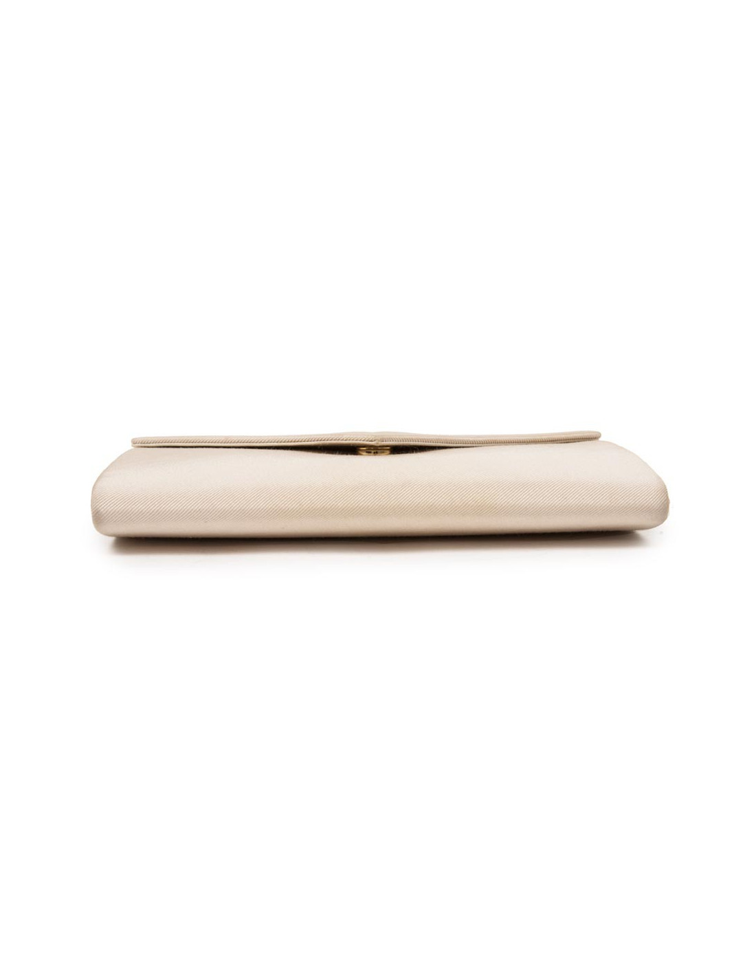 Pochette en satin ivoire de la maison Christian Dior. Garniture dorée. Fermeture par bouton pression. Porté à la main et possibilité de rajouter une chaine pour un porté épaule ou crossover. Intérieur en satin ivoire avec une fente plaquée.