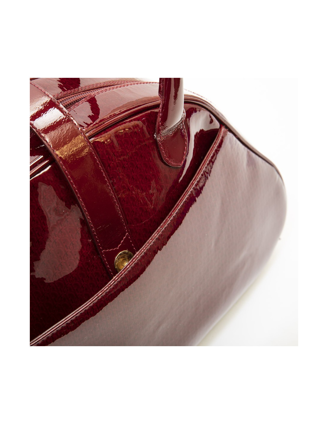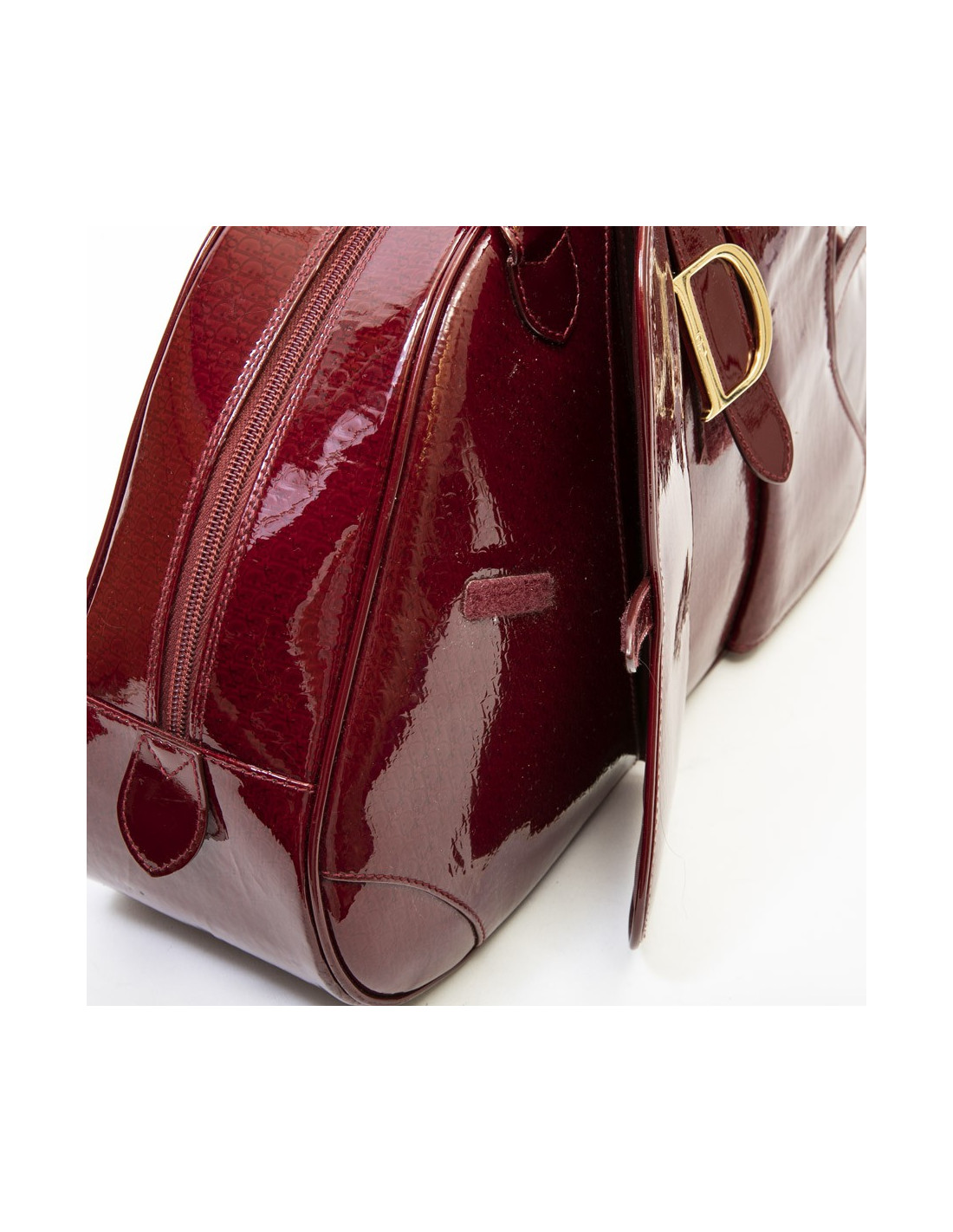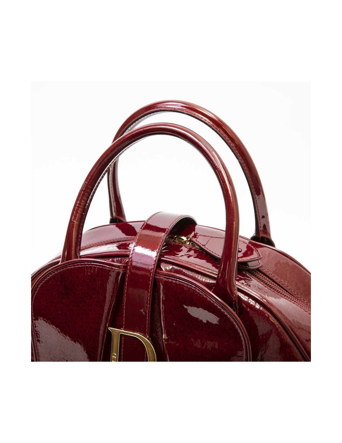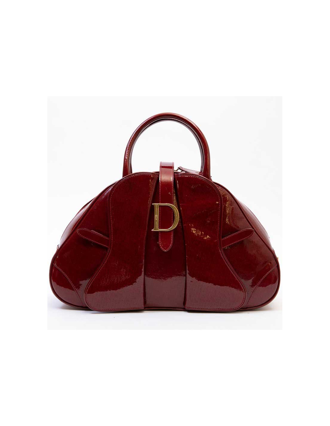 Sac Christian Dior modèle Saddle bowling en cuir verni rouge monogram. Modèle iconique de la Maison Dior. Fermeture par double zip dont une avec cadenas (plus de clés). Boucle D à scratch en métal doré. Trois poches plates extérieures dont deux à scratch à l'avant, et cinq poches plates intérieures dont une zippée et une pour le téléphone portable. Doublure intérieure en tissu rouge avec de nombreuses poches dont une à fermeture éclair.
