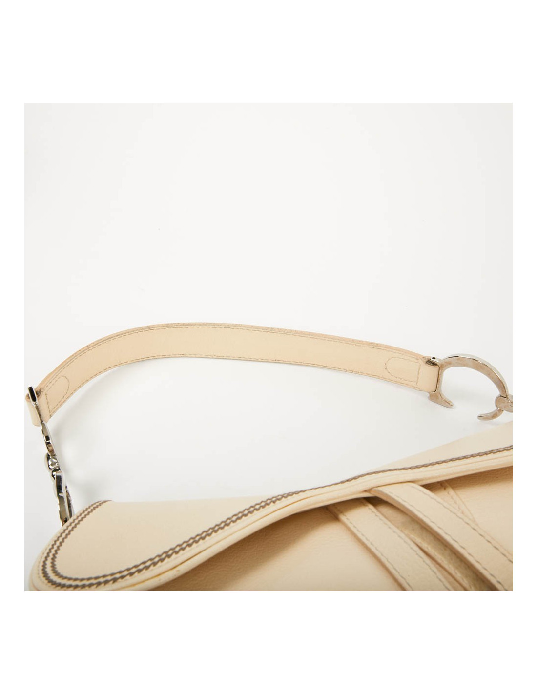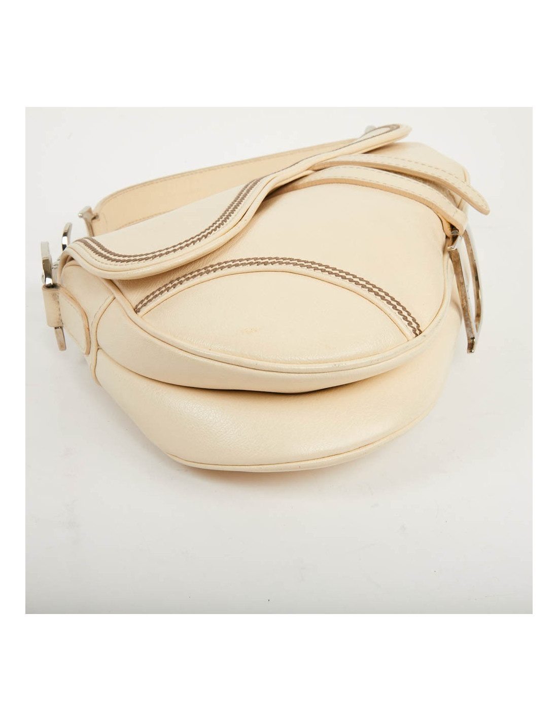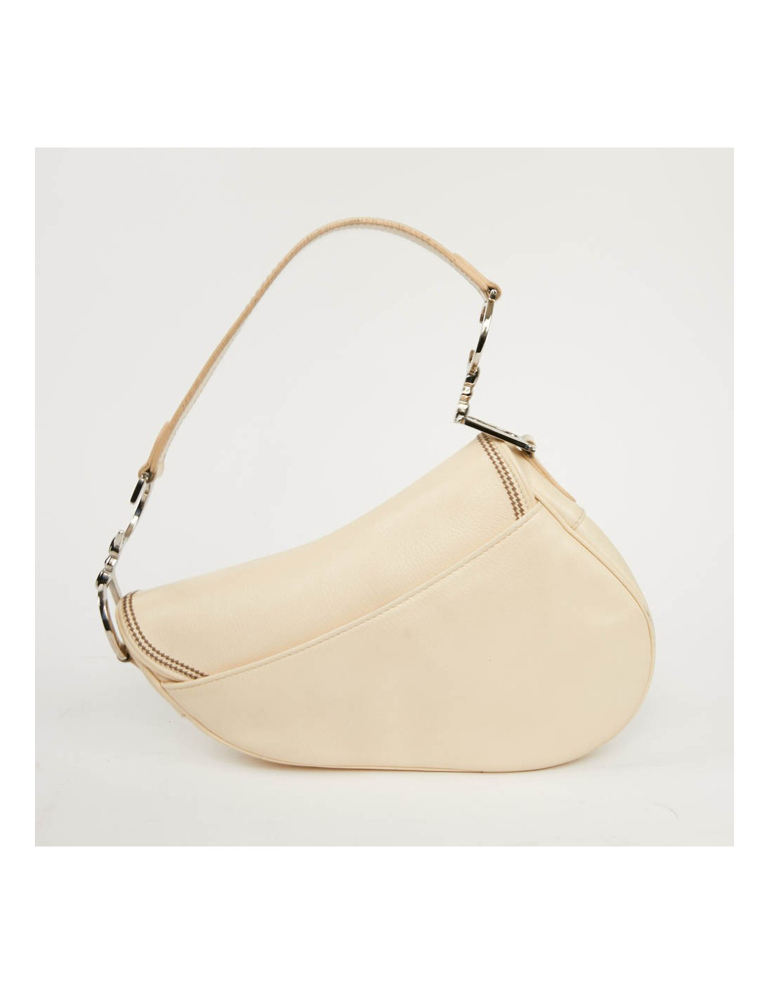 Saddle en cuir biege, légèrement grainé. Il a des coutures tout le tour du sac. Il se porte à l'épaule. En très bon état.