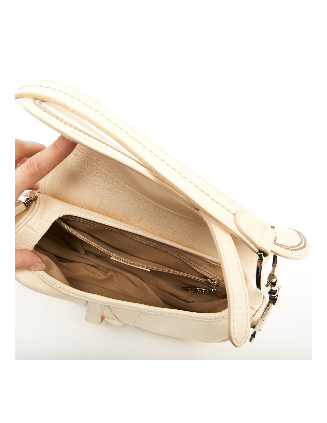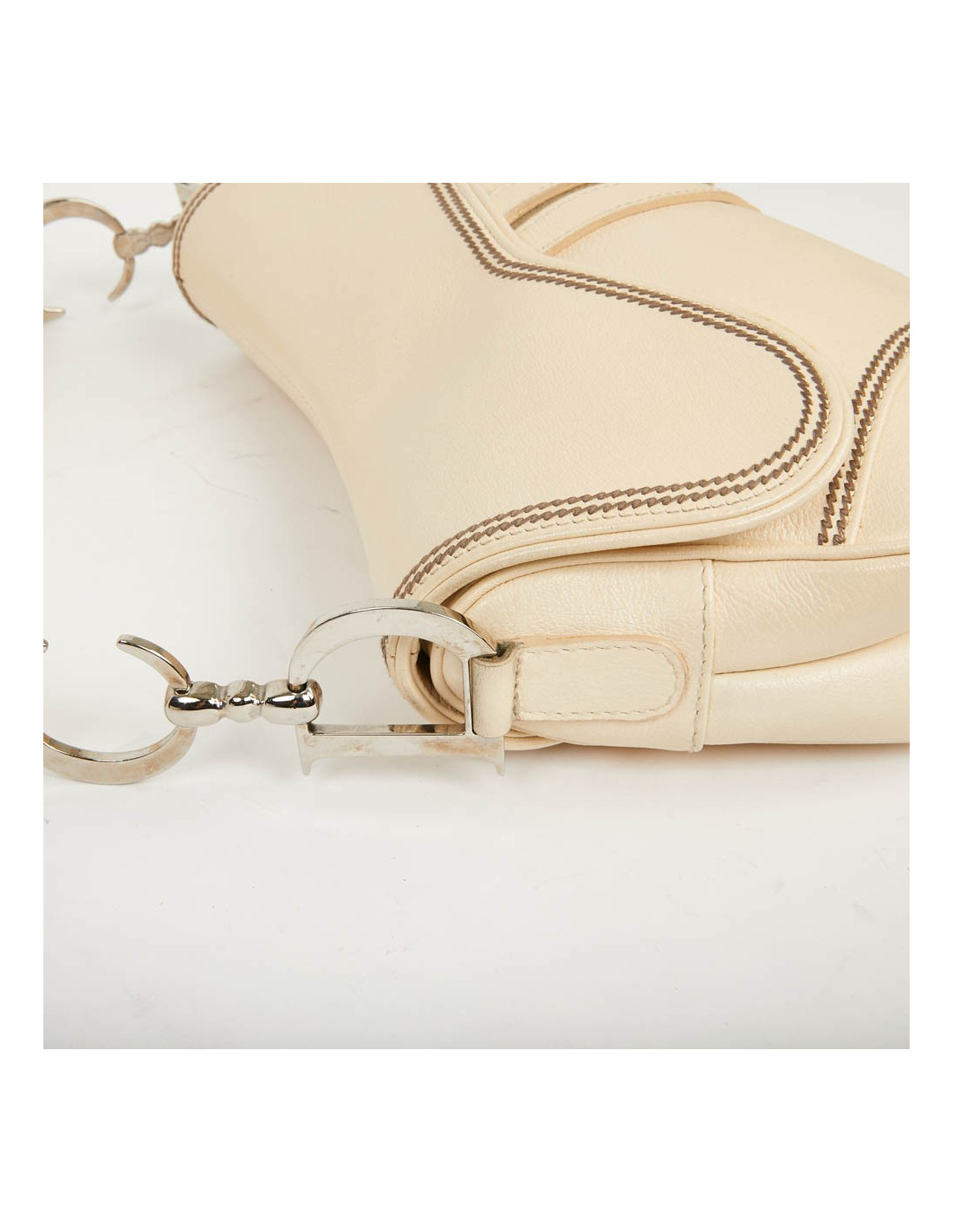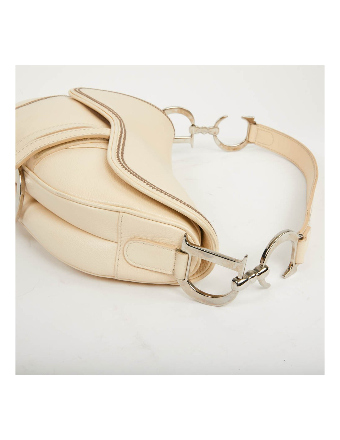 Saddle en cuir biege, légèrement grainé. Il a des coutures tout le tour du sac. Il se porte à l'épaule. En très bon état.