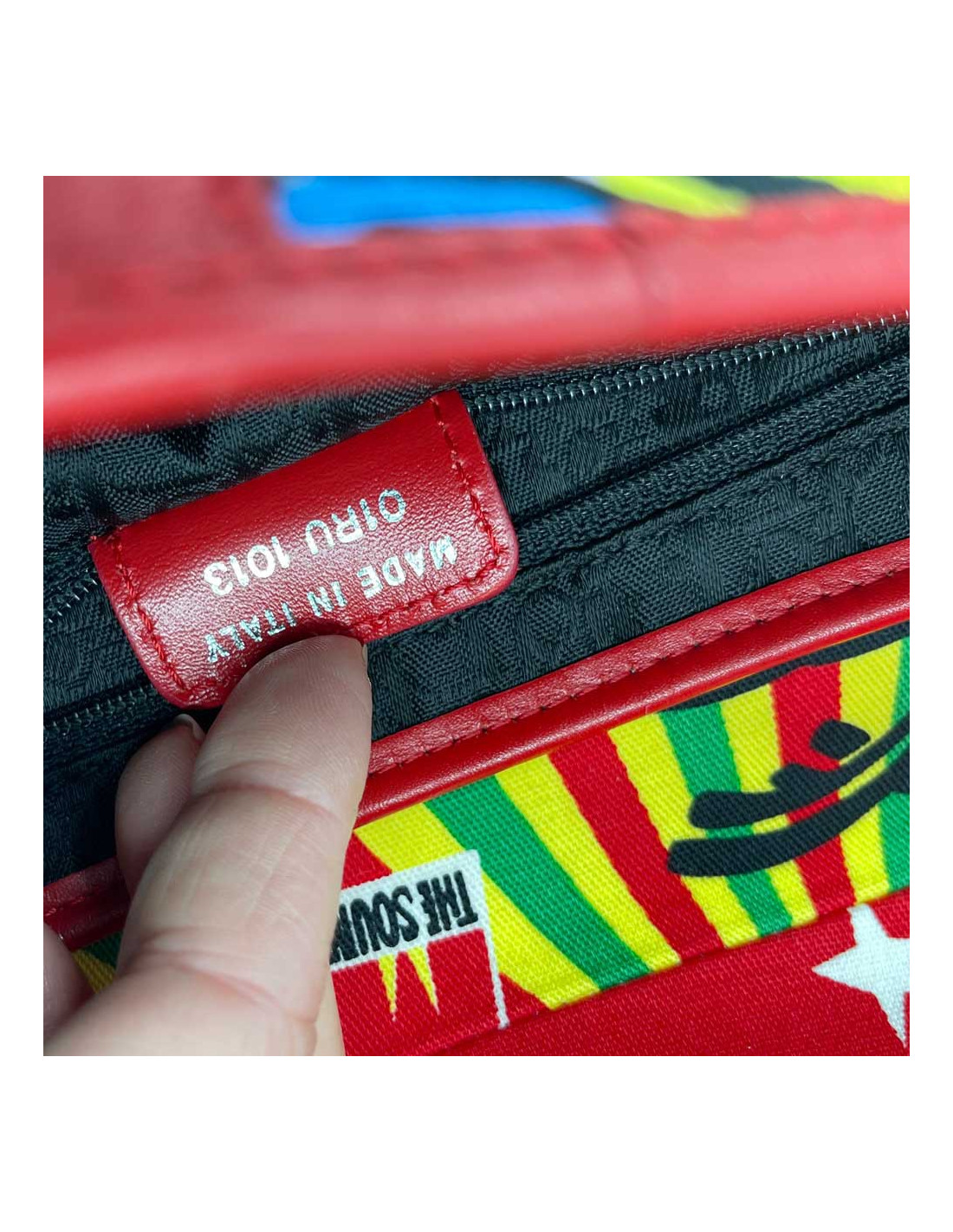Edition Collector sorti en 2003, ce sac de fabrication italienne est en très bon état. La toile de coton est de couleur rouge, bleu, jaune, vert, noir avec en fond des représentations de Bob Marley. Fermeture par un rabat a scratch. Aucune usure sur le cuir mais de micro-rayures sur la bijouterie.