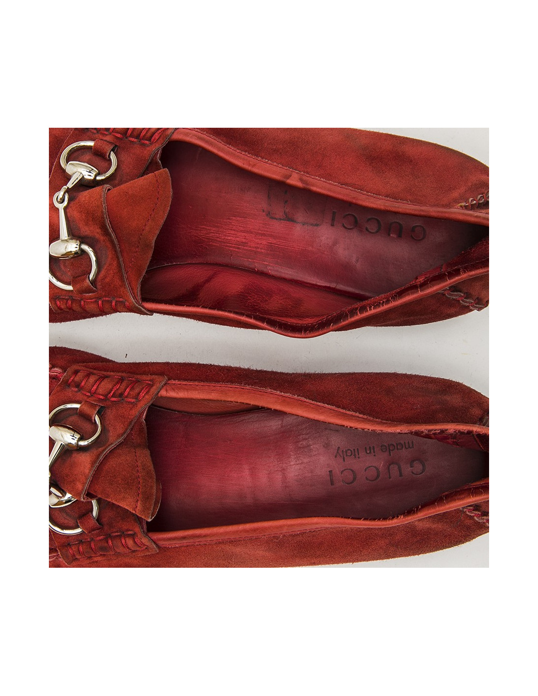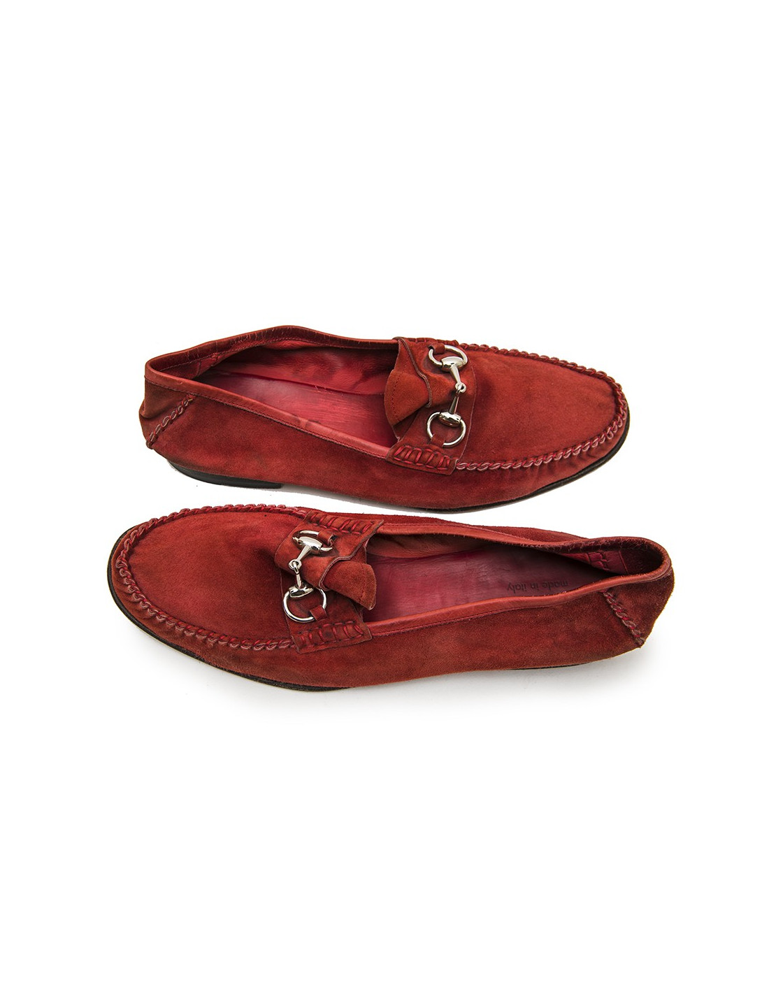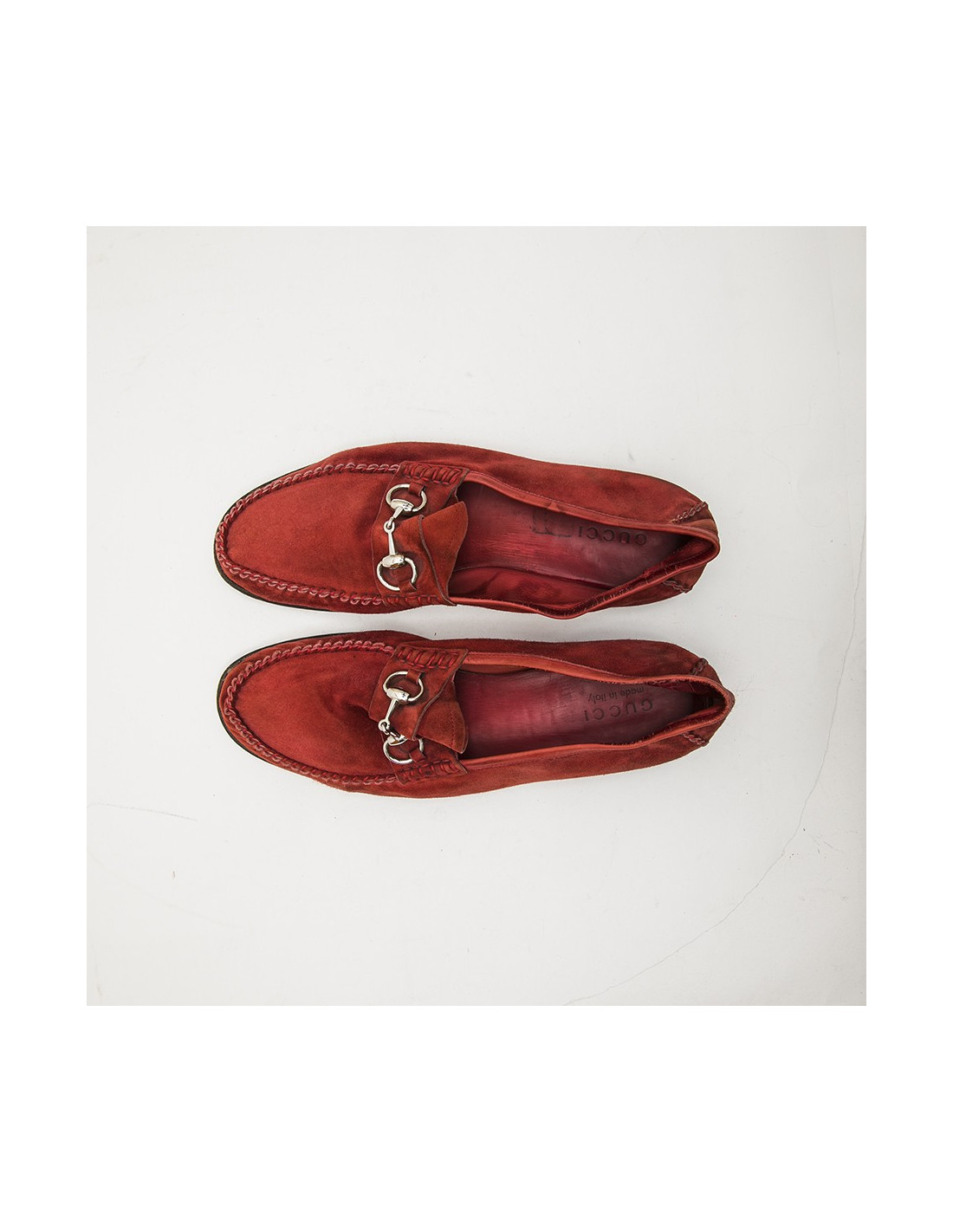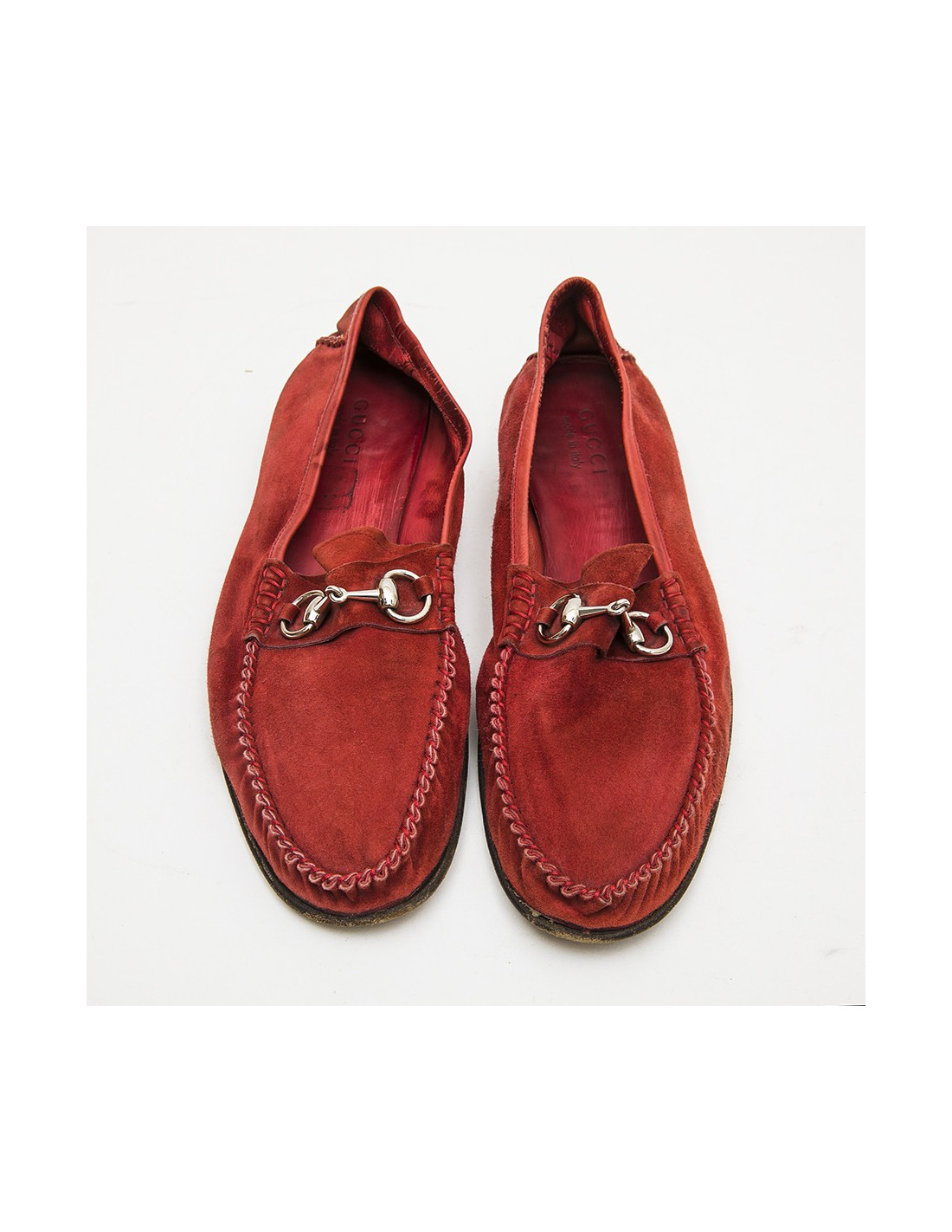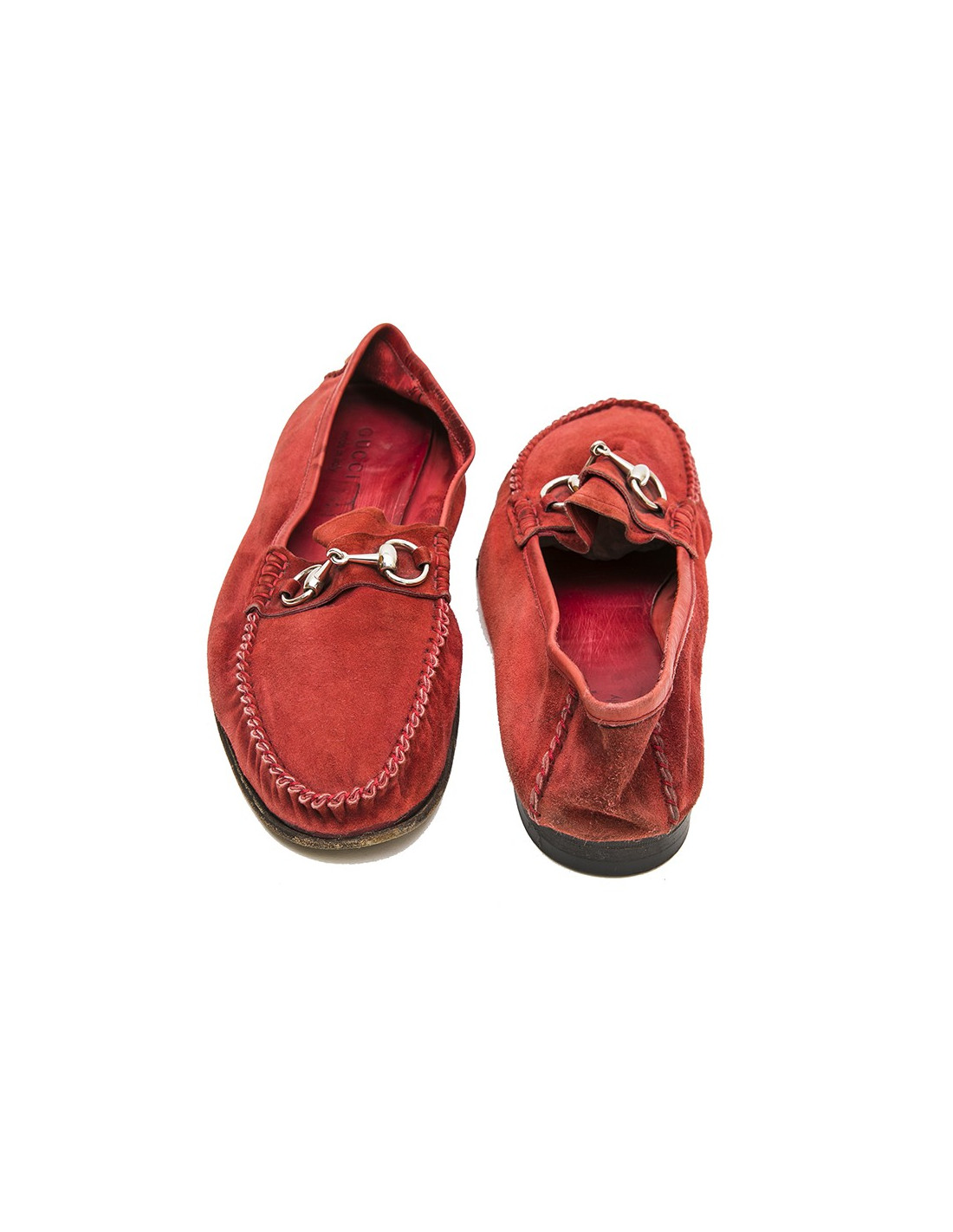 Traditionnels mocassins en daim rouge de la Maison Gucci.