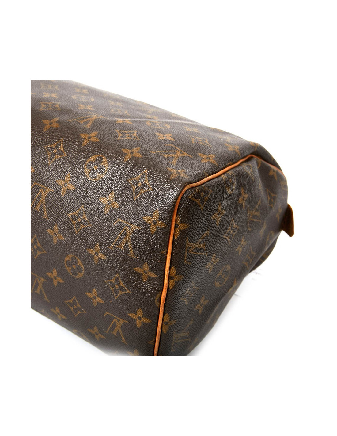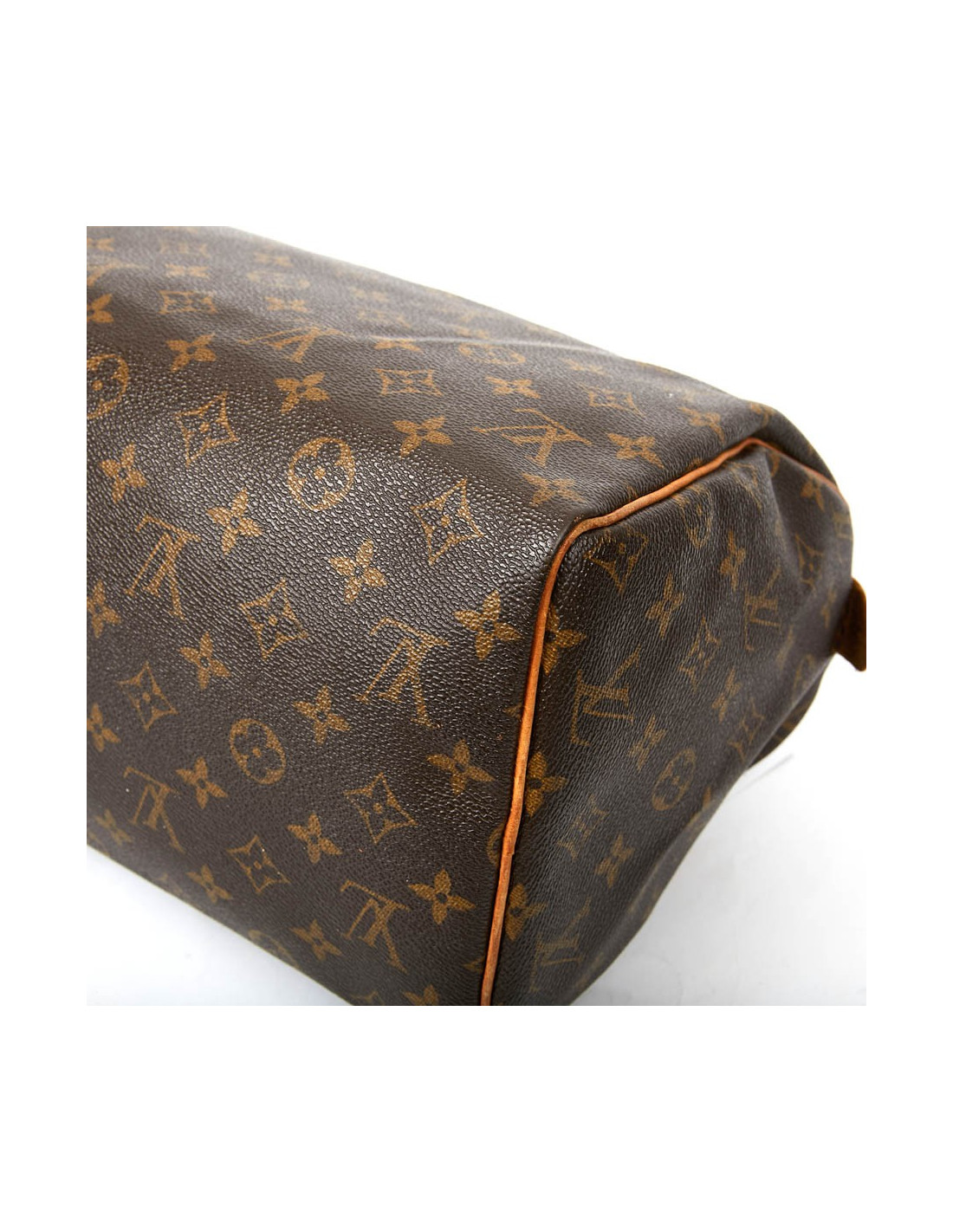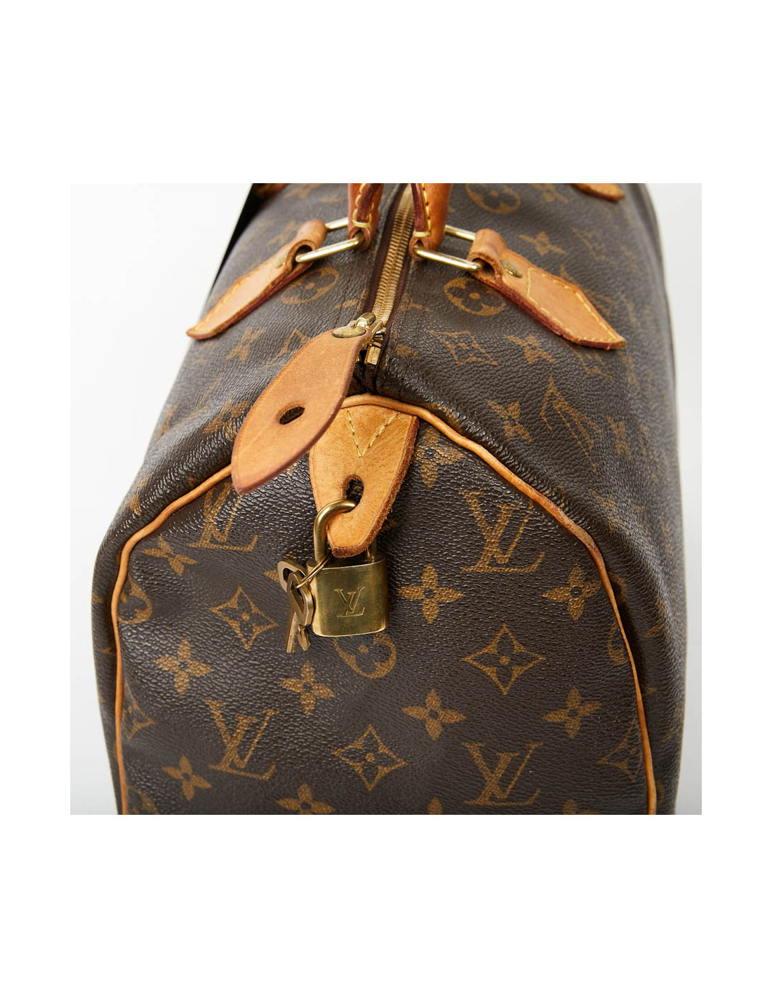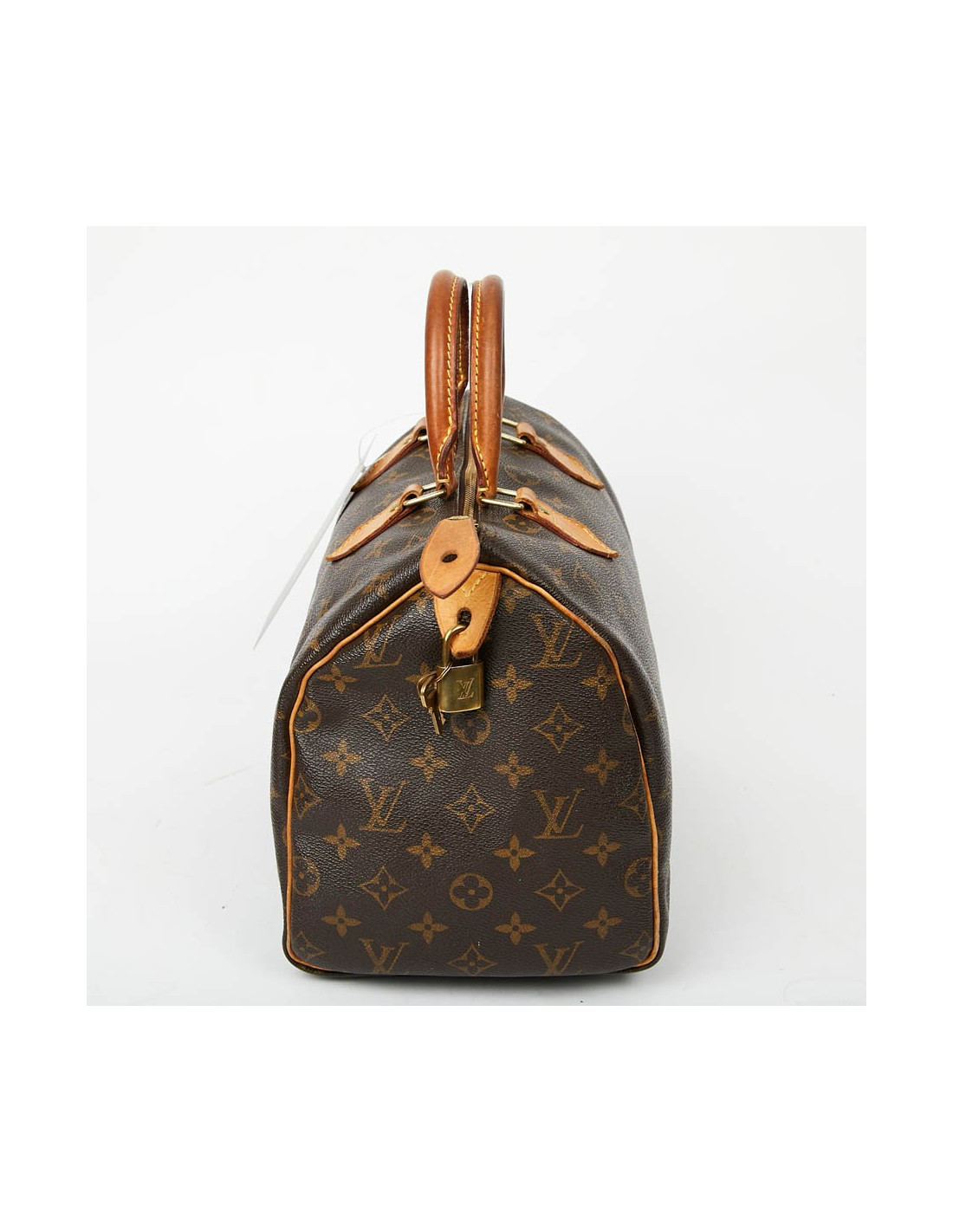 Ce sac intemporel Speedy de la Maison Louis Vuitton est taille 30 avec des finitions en métal doré. Il est en bon état, les garnitures en cuir de vache naturel sont légèrement patinées avec le temps. De petites usures sont à peine visibles sur les coins; de petites tâches sur la doublure intérieure. Il a son cadenas et ses 2 clefs.