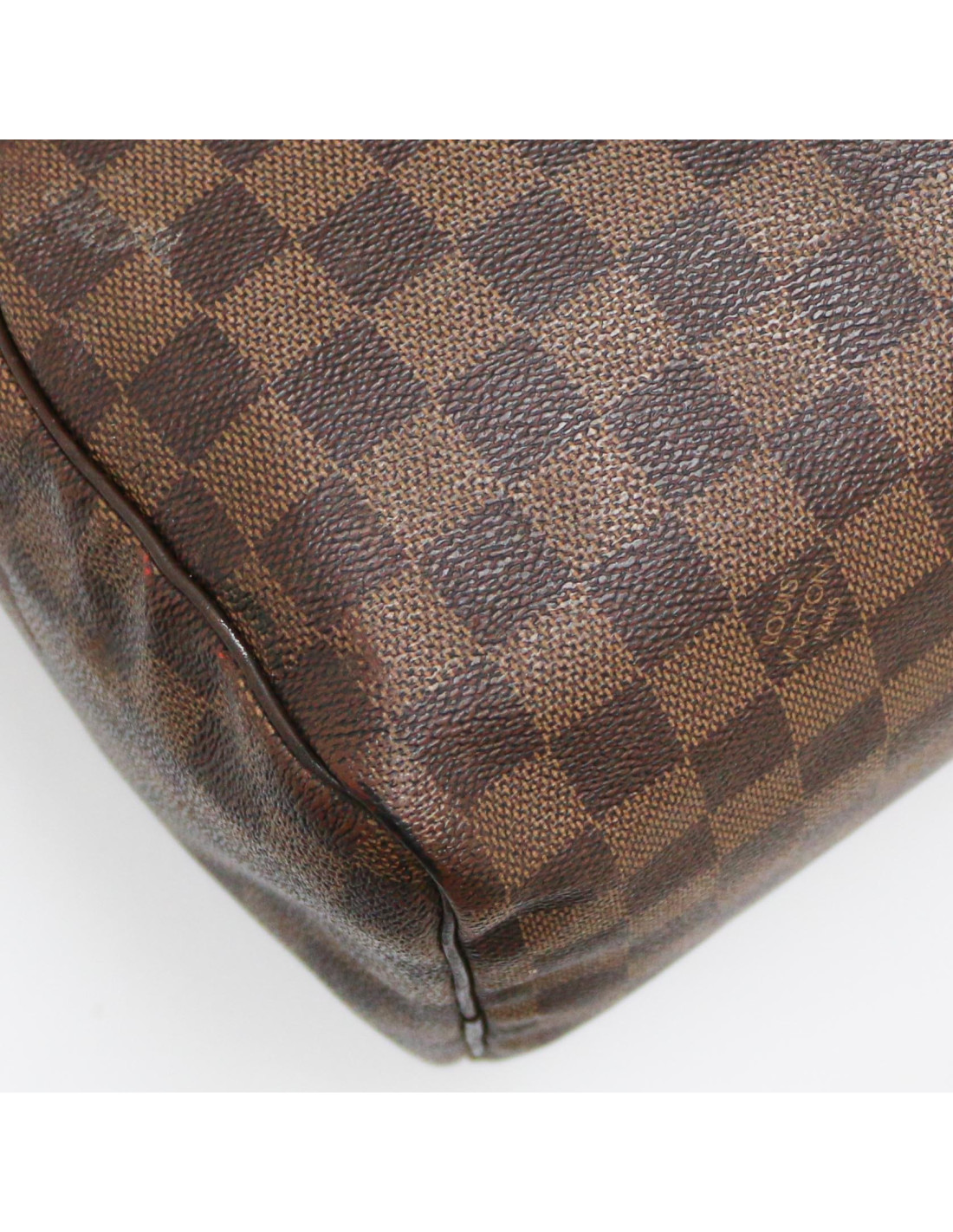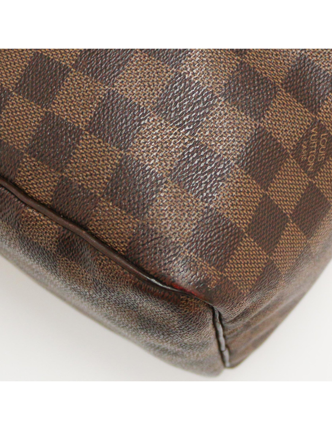 Détails : damier ébène, petites traces d'usure sur les empiècements en cuir du sac.