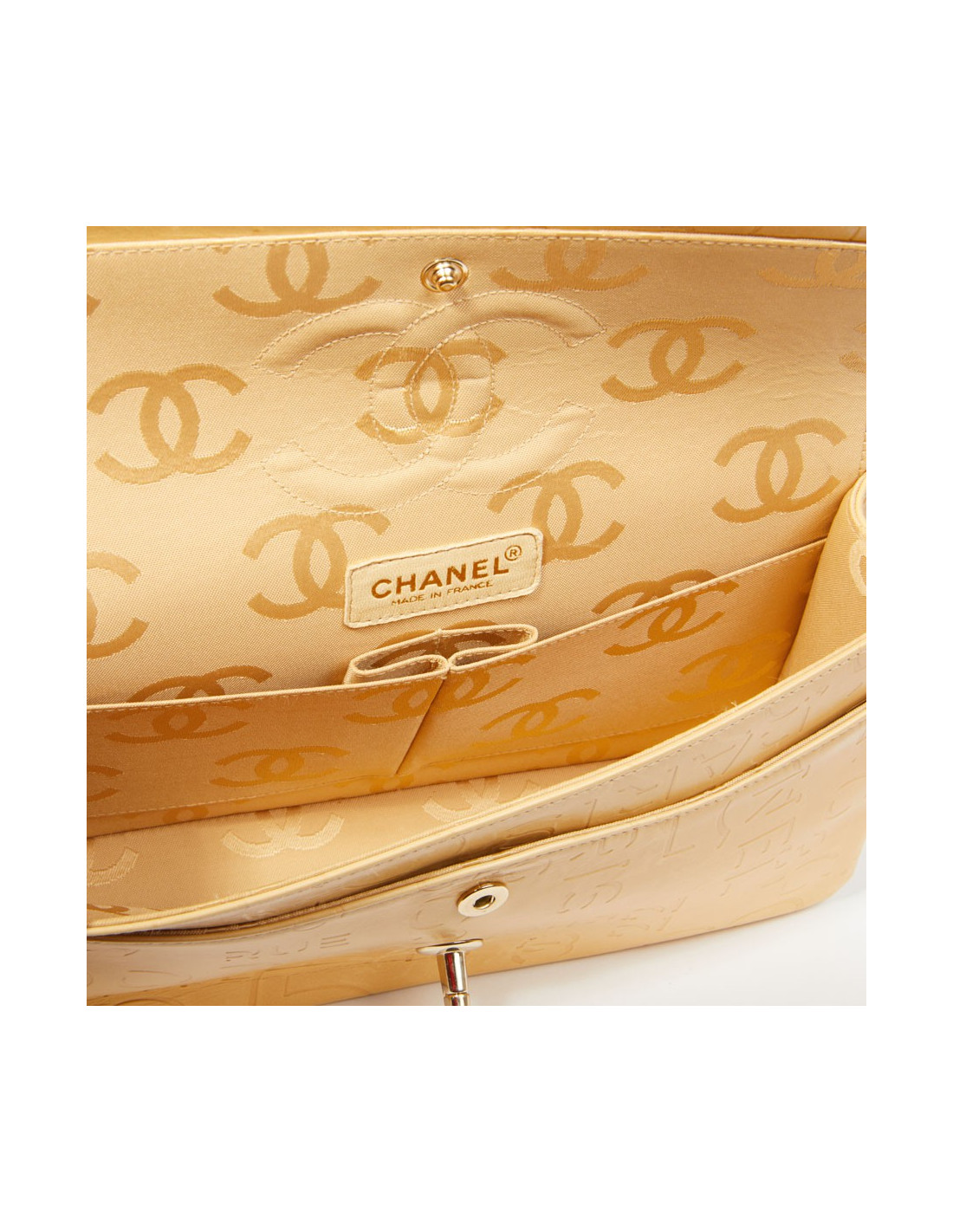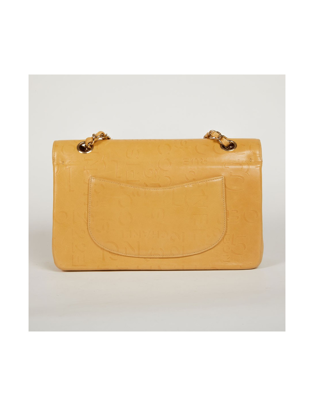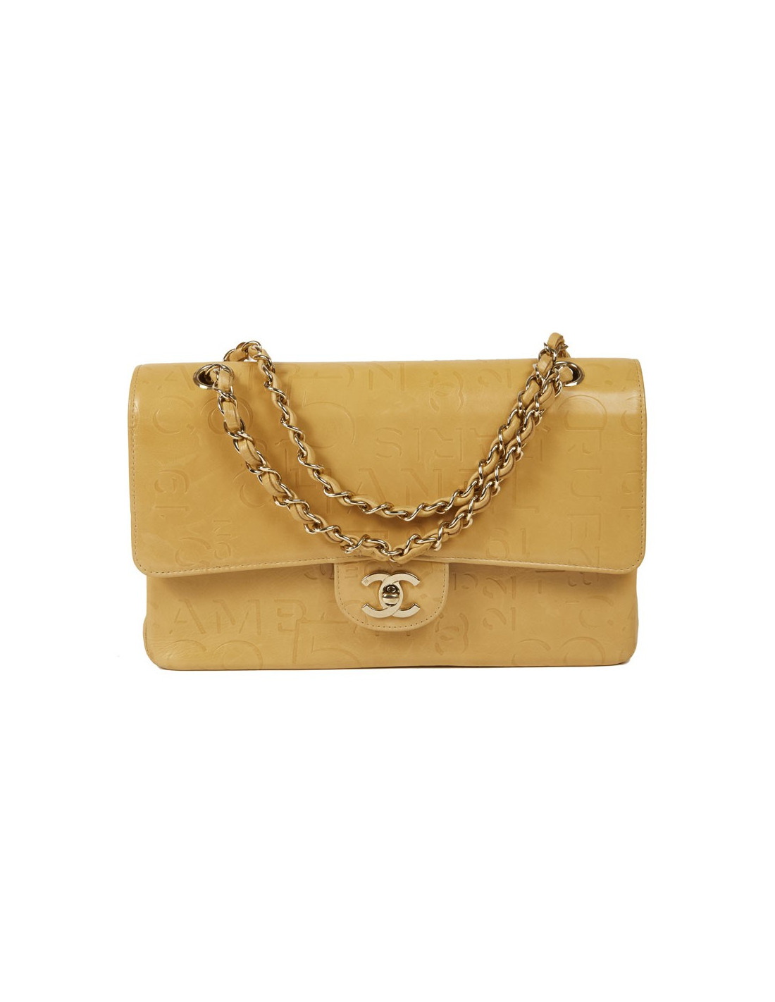 Ce sac Chanel siglé en cuir beige embossé d’inscriptions Chanel, de logo CC, rue Cambon et 5 qui représentent les signes iconiques de la célèbre Marque aux double C. L'accastillage est en métal couleur champagne. Ce sac Chanel possède un double-rabat avec bouton pression, une grande poche zippée dans le rabat. La doublure intérieure de ce sac est en tissu monogrammé.