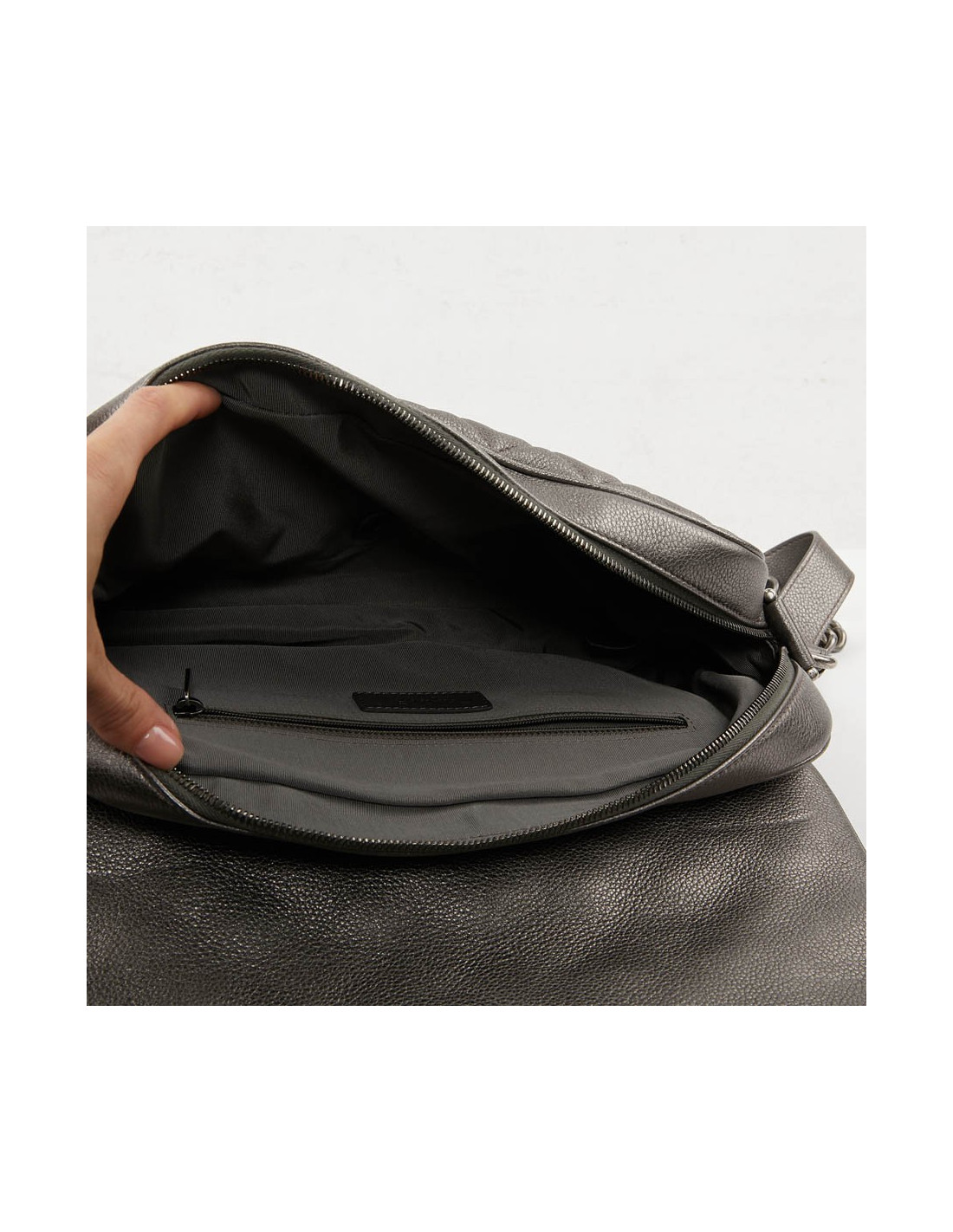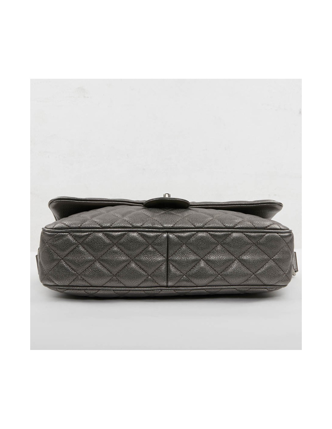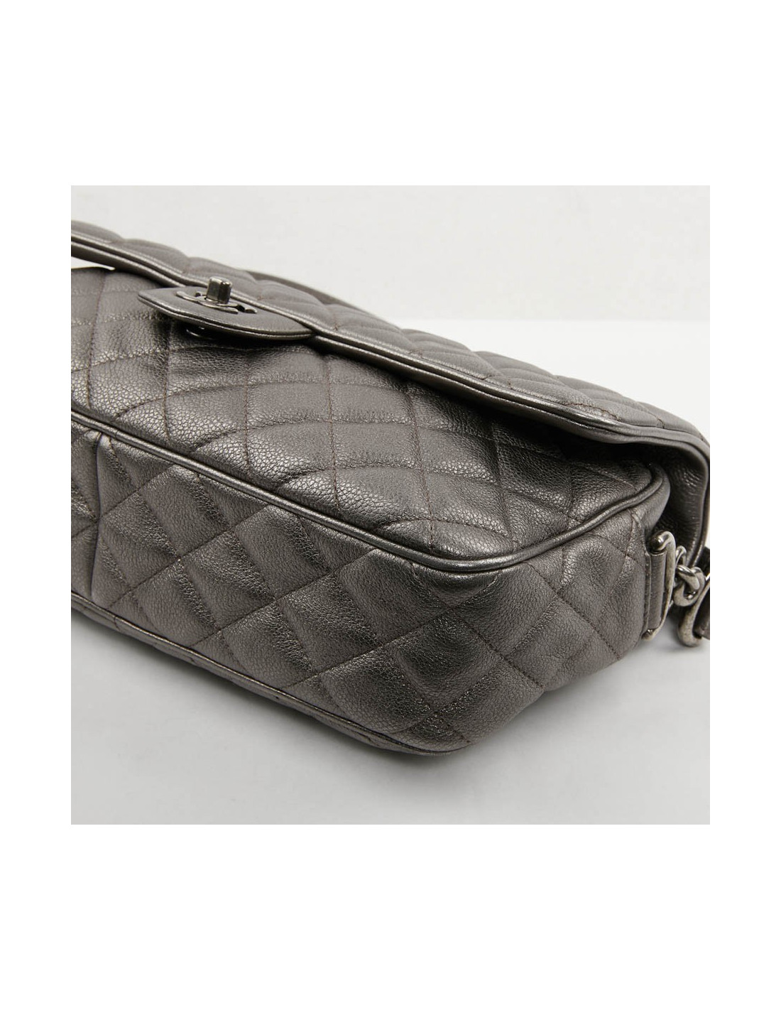 Ce sac CHANEL s'apparente au modèle Timeless avec quelques déclinaisons. Il est en cuir grainé métallisé et sa bijouterie est en métal argenté vieilli, ce qui lui donne un aspect rock. L'intérieur est en toile avec une poche zippée. Sa bandoulière est faite d'un mélange de cuir et de larges maillons. Il se porte à l'épaule.