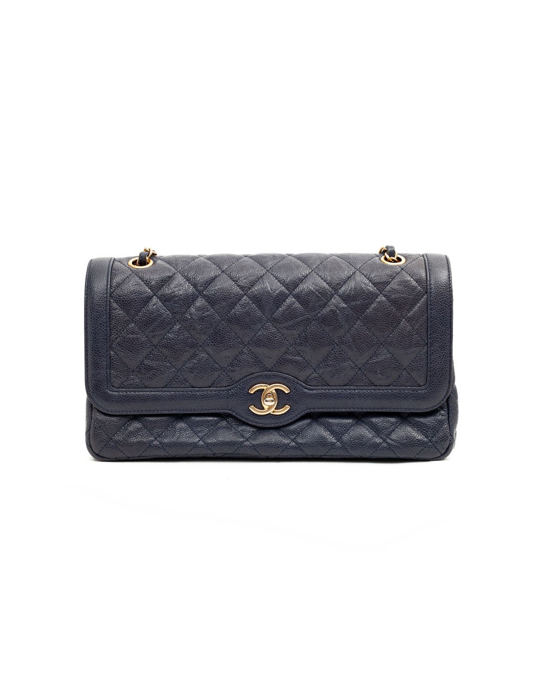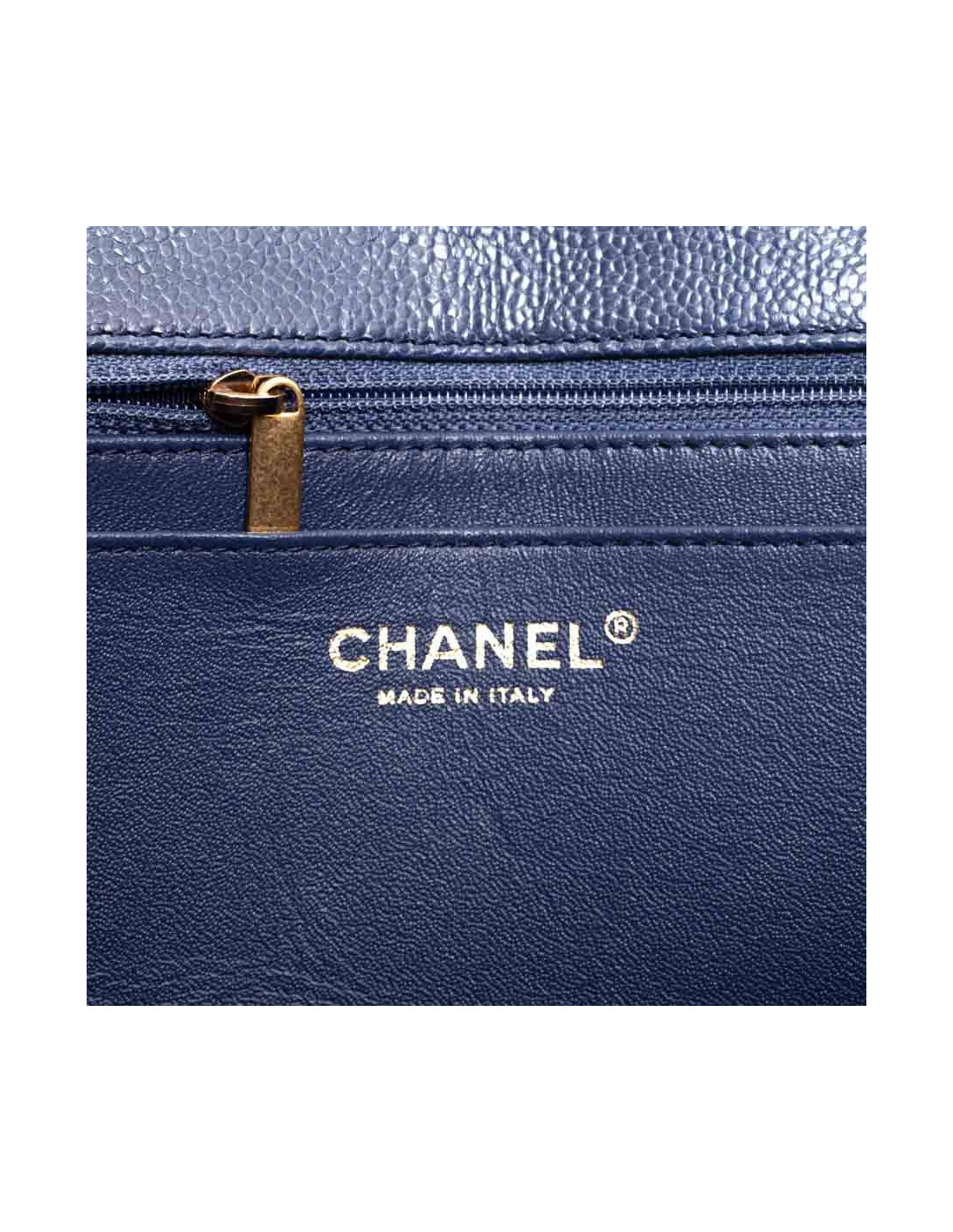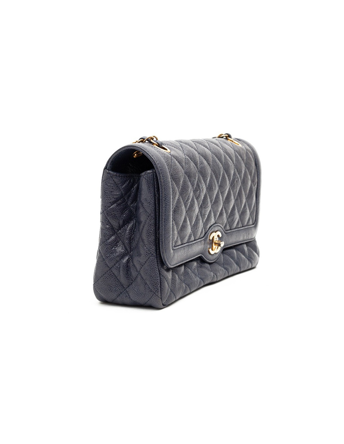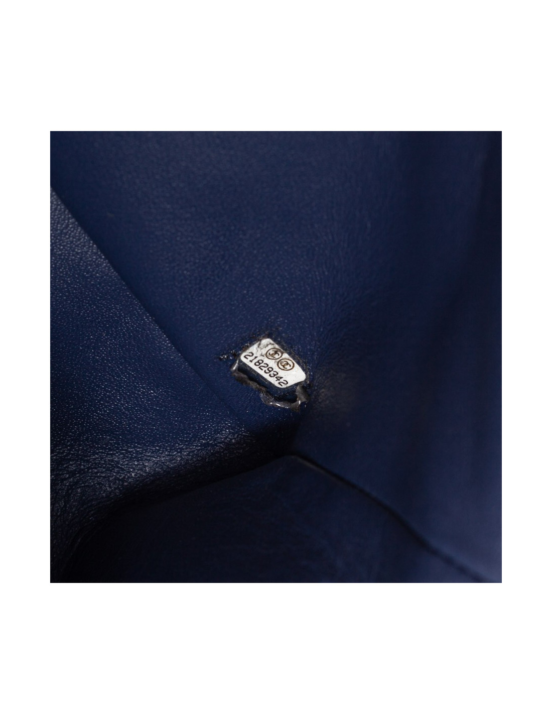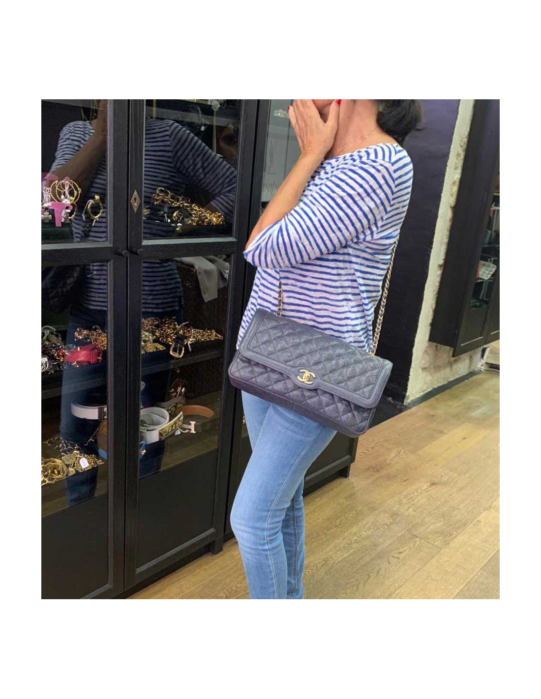 Sac à la taille idéale pour tous les jours. Il pourra contenir tous vos accessoires du quotidien. Il se porte à l'épaule ou crossbody à l'aide d'une bandoulière en chaine dorée mat et cuir. Fermoir CC, emblématique de la marque. Il est de couleur bleu en cuir matelassé grainé froissé.
