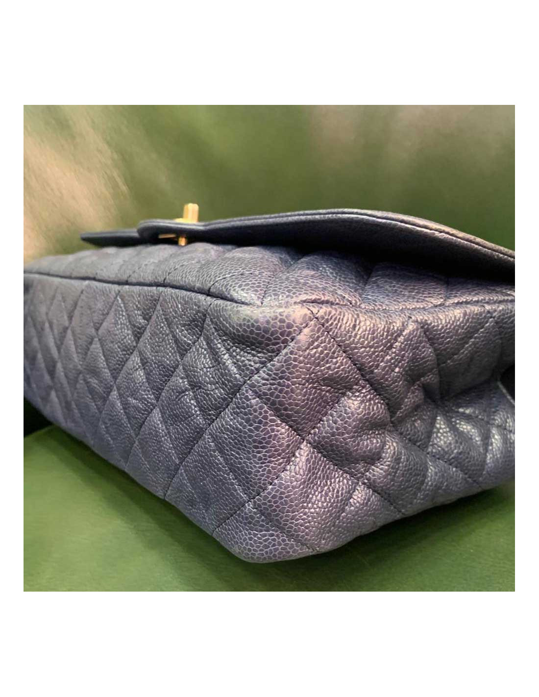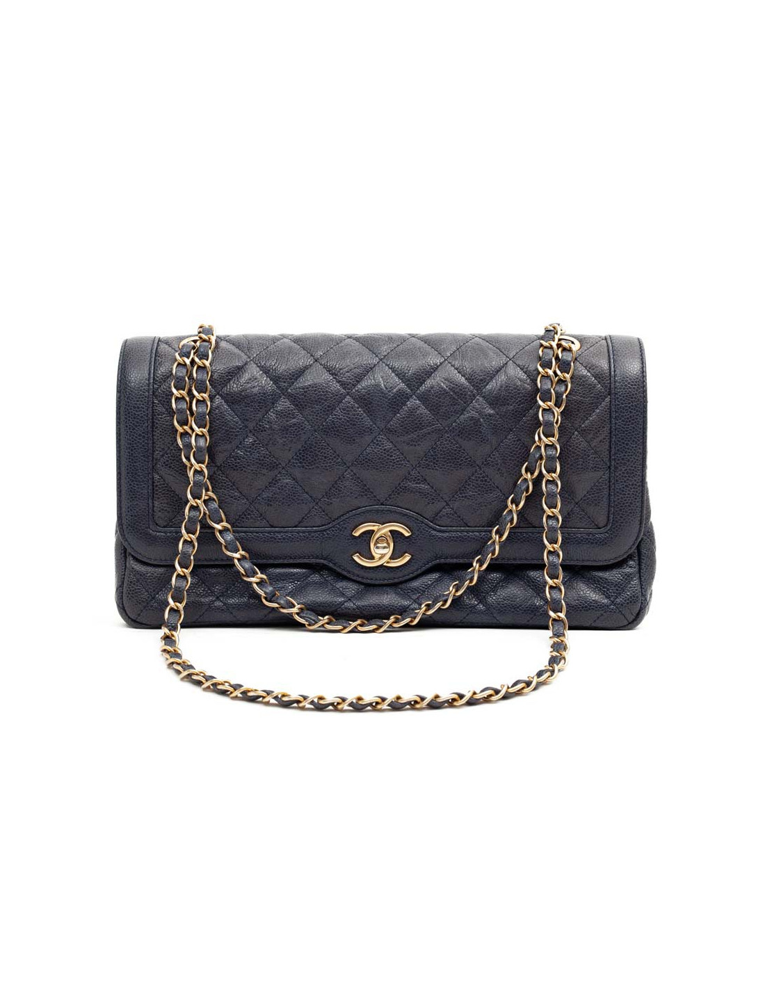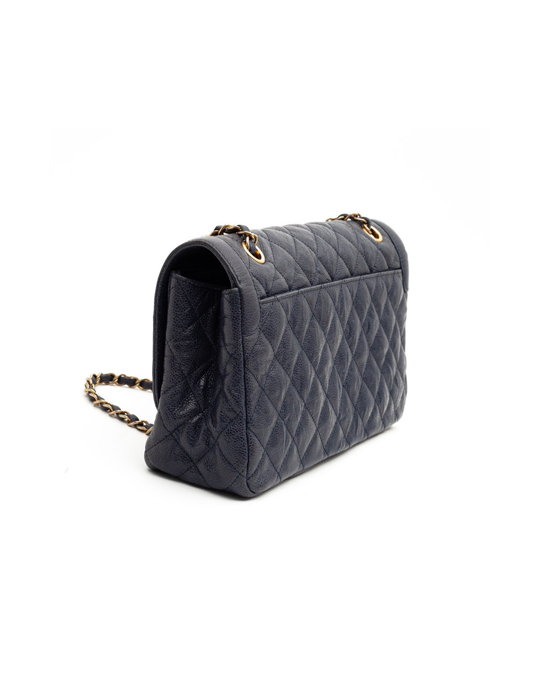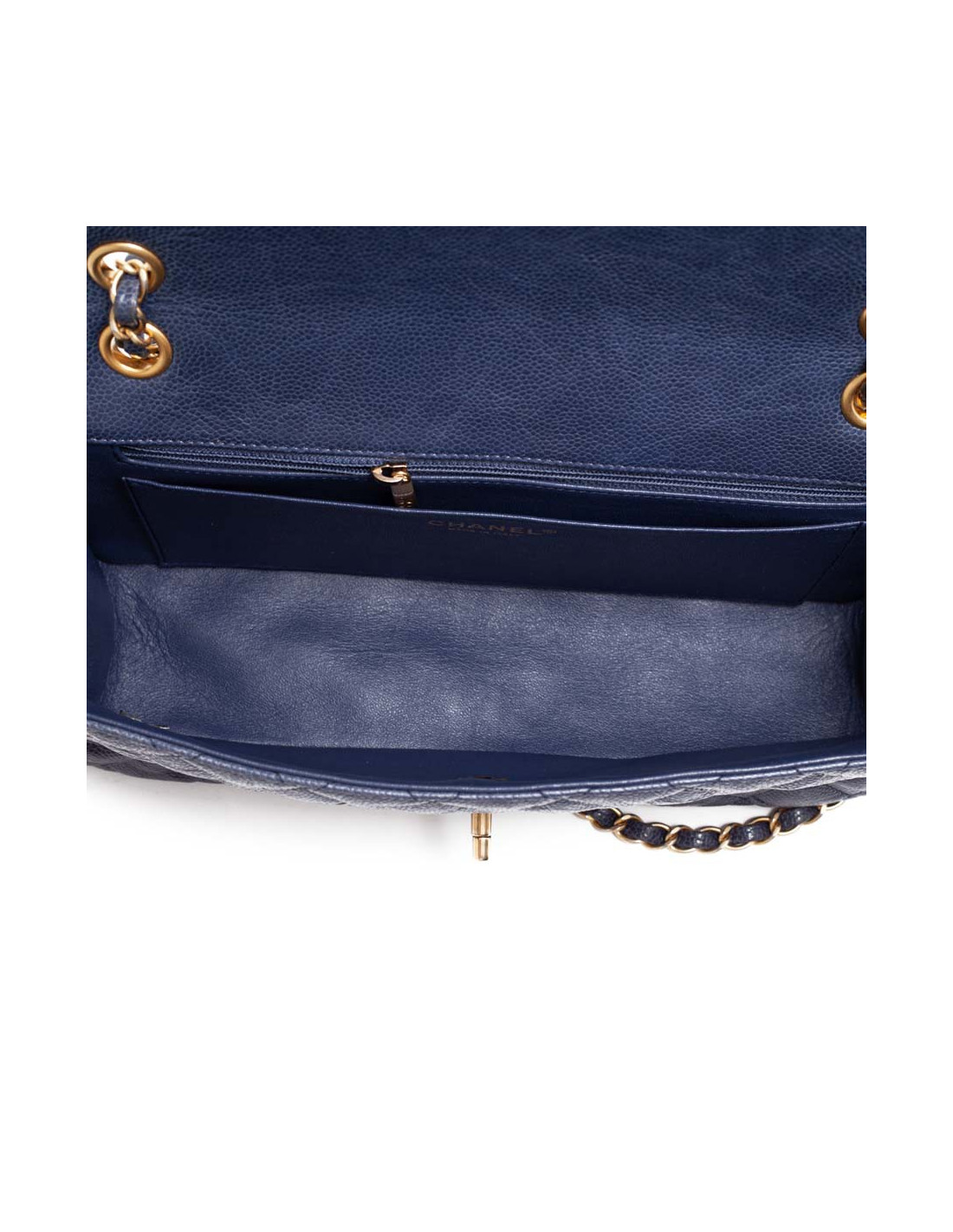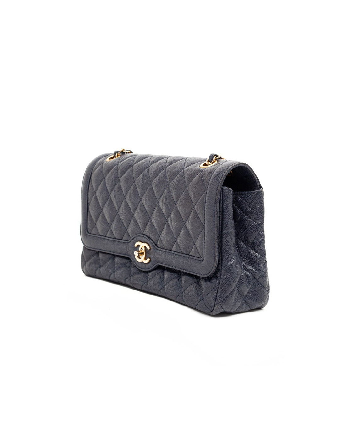 Sac à la taille idéale pour tous les jours. Il pourra contenir tous vos accessoires du quotidien. Il se porte à l'épaule ou crossbody à l'aide d'une bandoulière en chaine dorée mat et cuir. Fermoir CC, emblématique de la marque. Il est de couleur bleu en cuir matelassé grainé froissé.