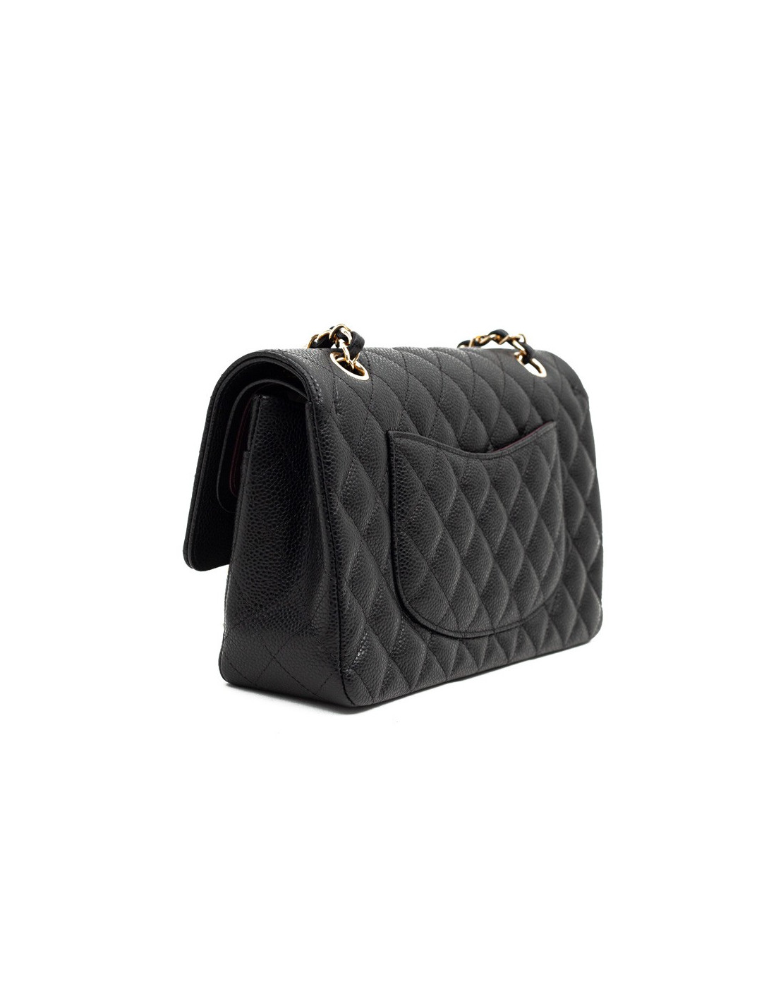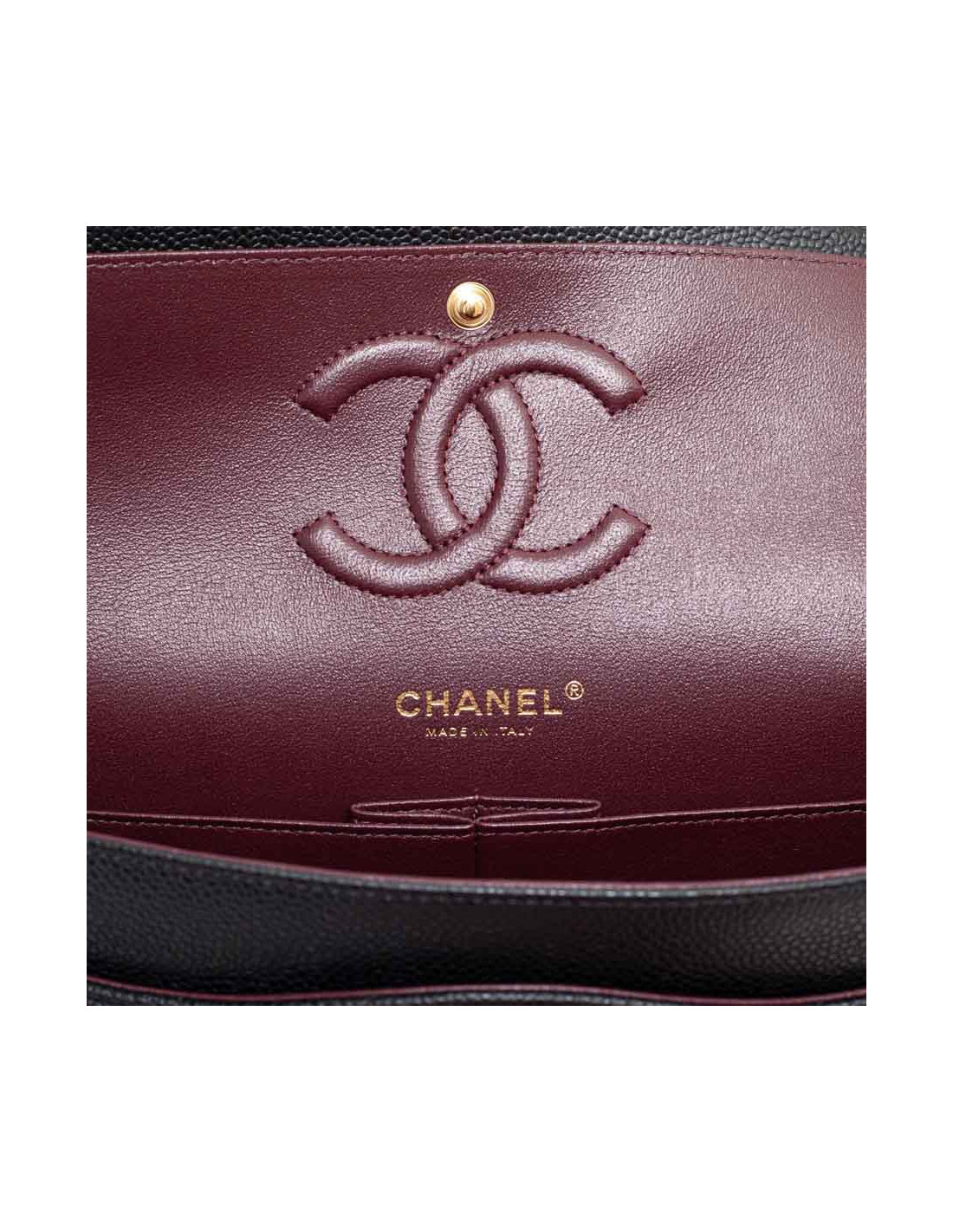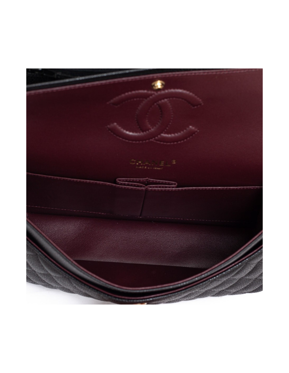 Magnifique pièce intemporelle CHANEL modèle Timeless appelé aussi sac Classique en cuir caviar noir. La bijouterie dorée et est doublé de cuir bordeaux. Chaîne emblématique entrelacée de cuir.