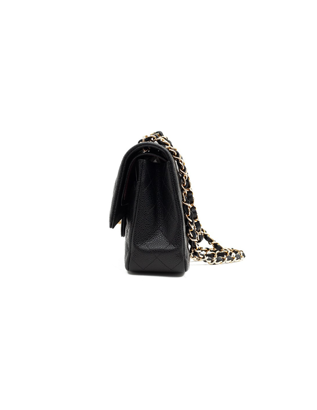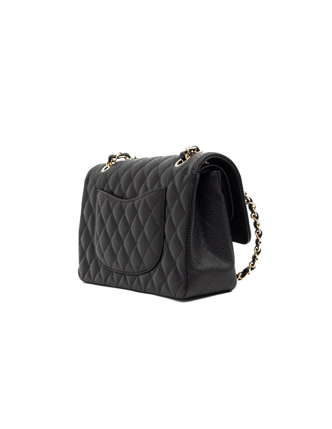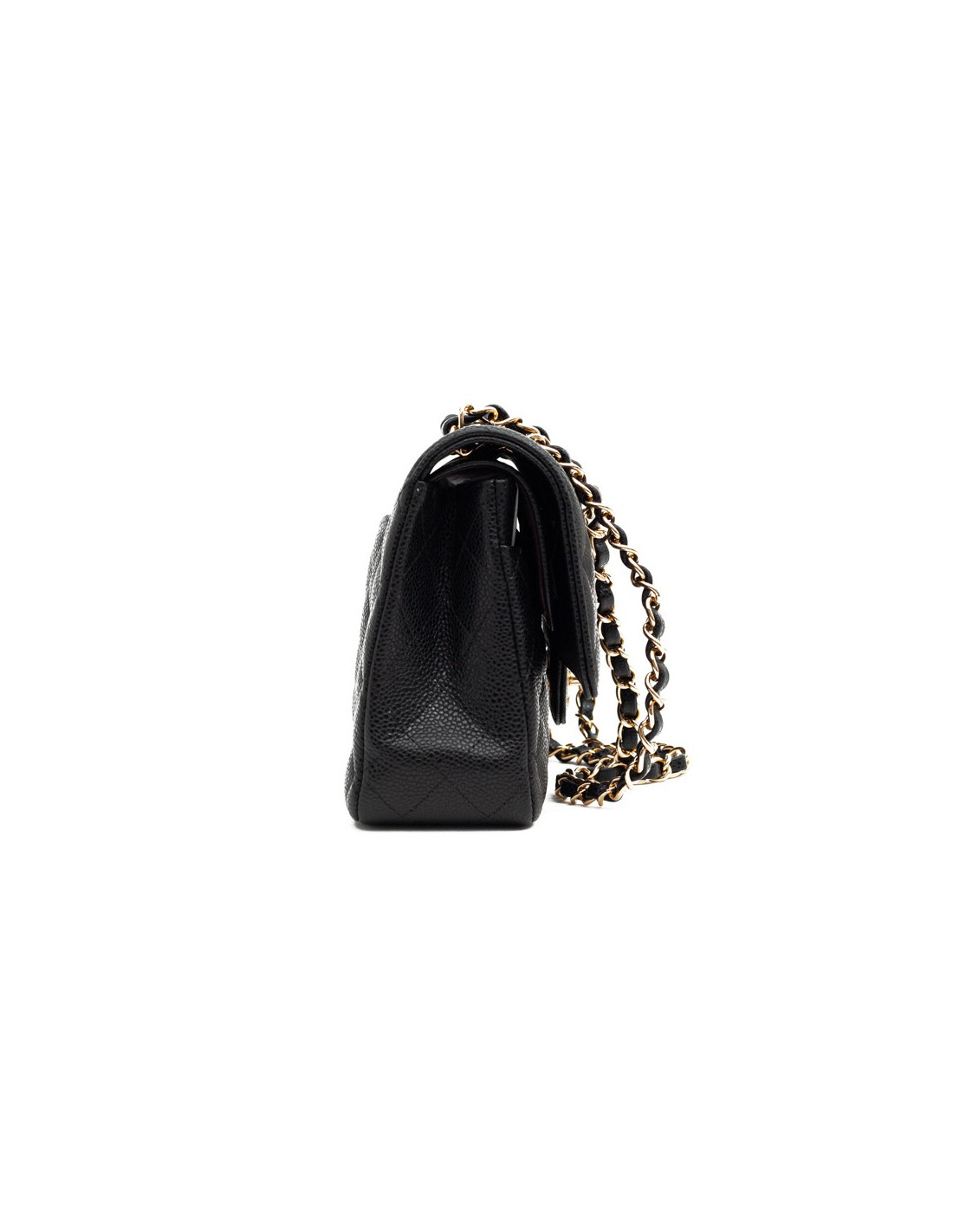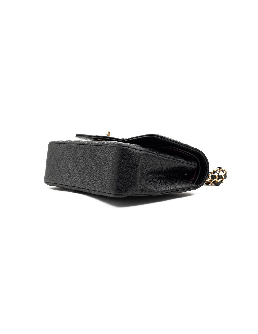 Magnifique pièce intemporelle CHANEL modèle Timeless appelé aussi sac Classique en cuir caviar noir. La bijouterie dorée et est doublé de cuir bordeaux. Chaîne emblématique entrelacée de cuir.