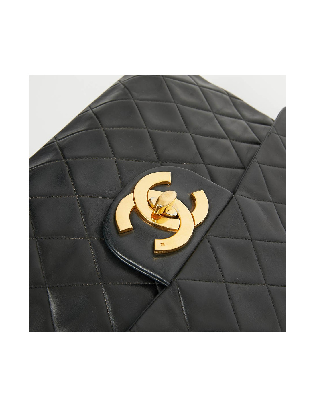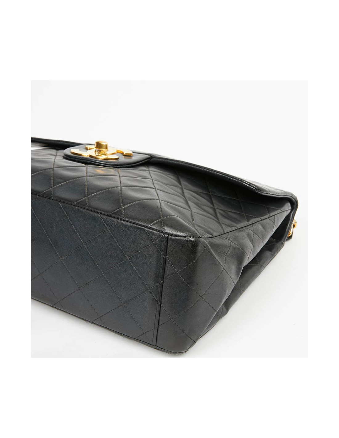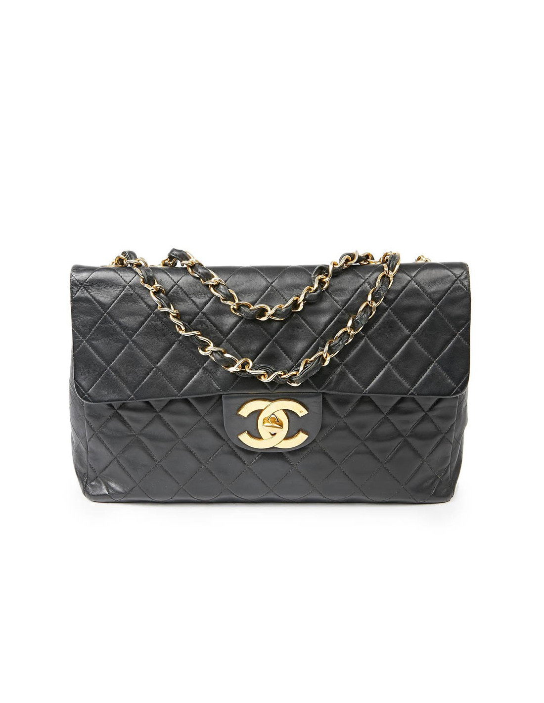 Ce maxi jumbo est le symbole des années Chanel des années 90'. Le gros double "C" est en métal or vintage. Il représente l'époque des top models qui le portaient lors des défilés qui faisaient sensation.