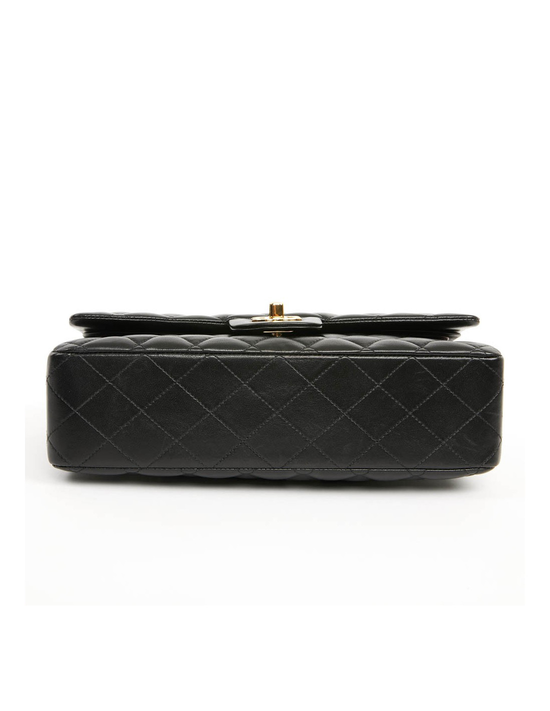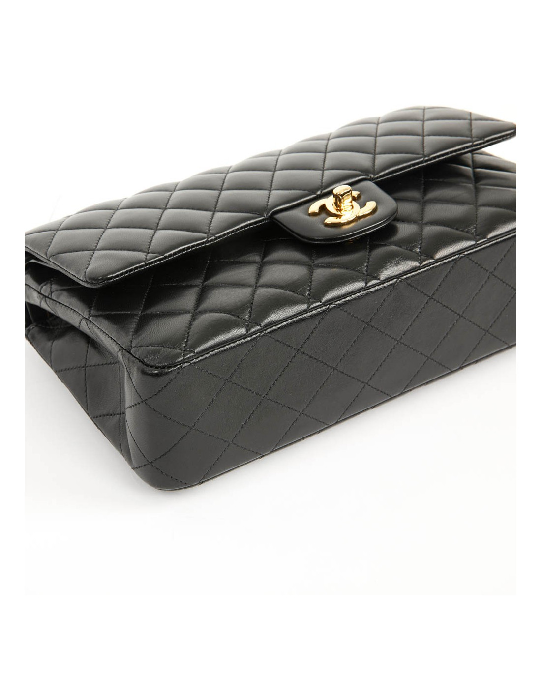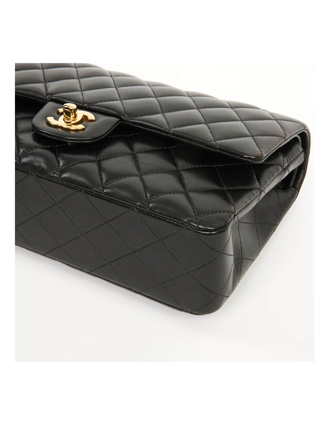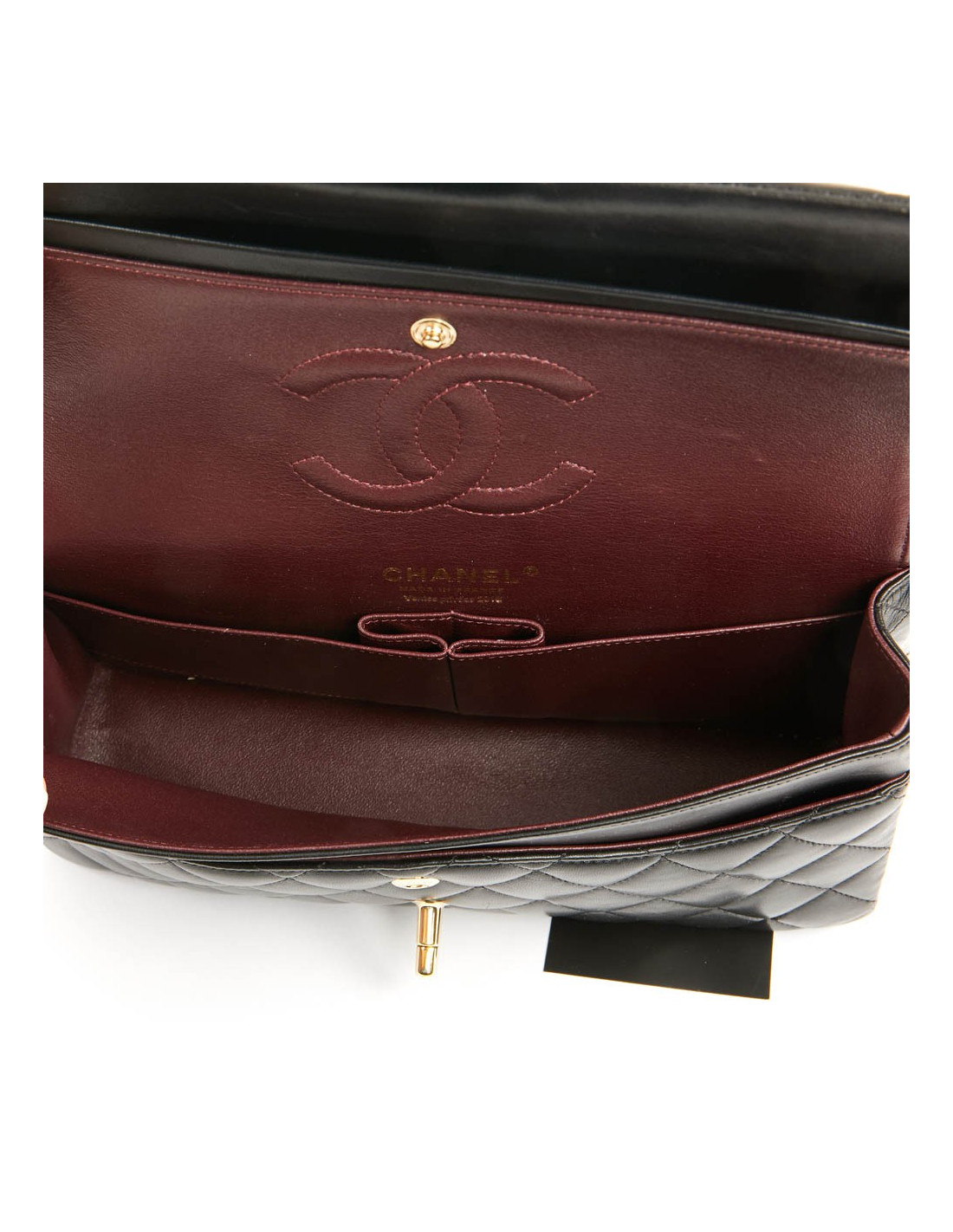 Elégant sac à main Chanel, en cuir d'agneau lisse matelassé. La bijouterie est dorée. Il se porte à l'épaule. Il a un double rabat. L'intérieur est doublé en cuir bordeaux. Sur le double rabat, légères griffures dues à la fragilité du cuir.