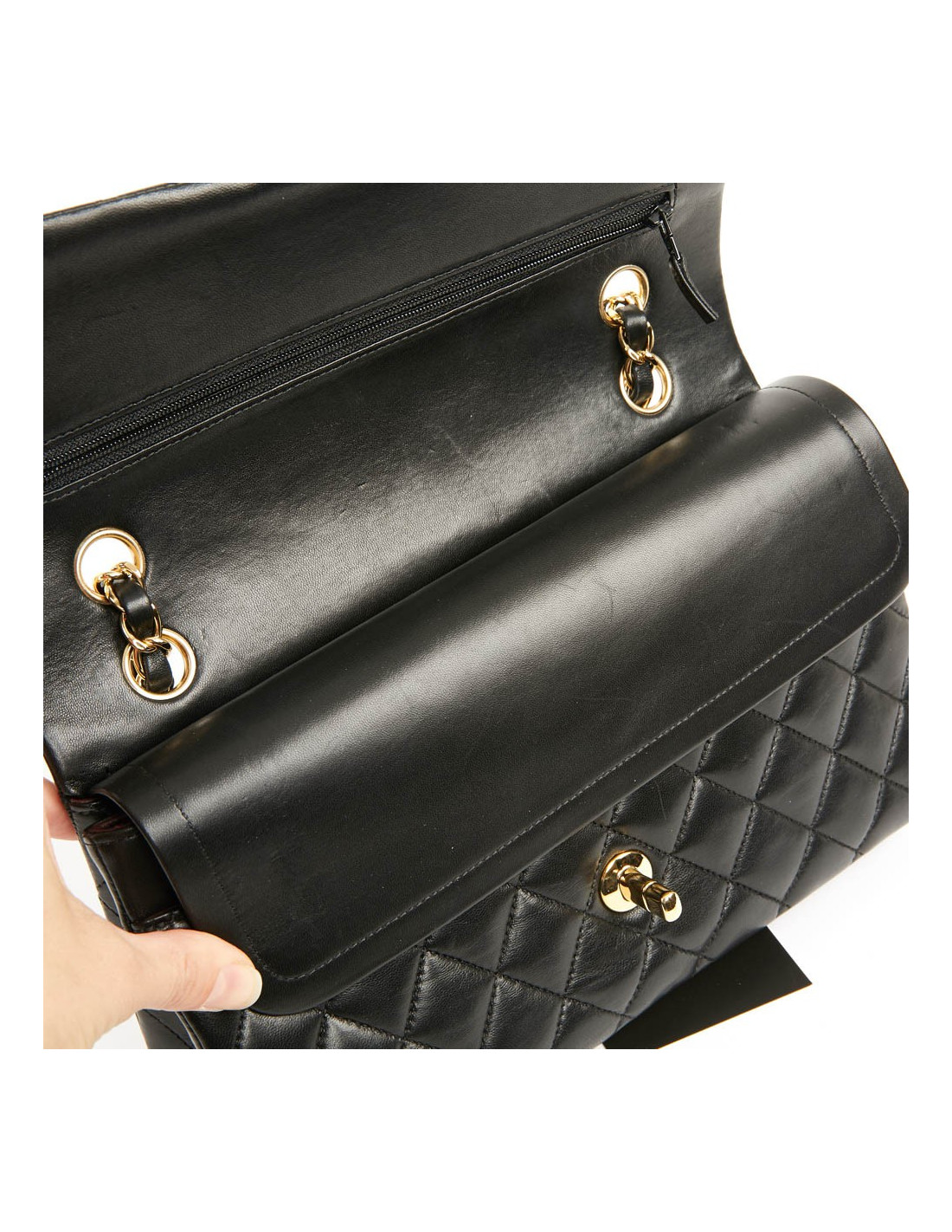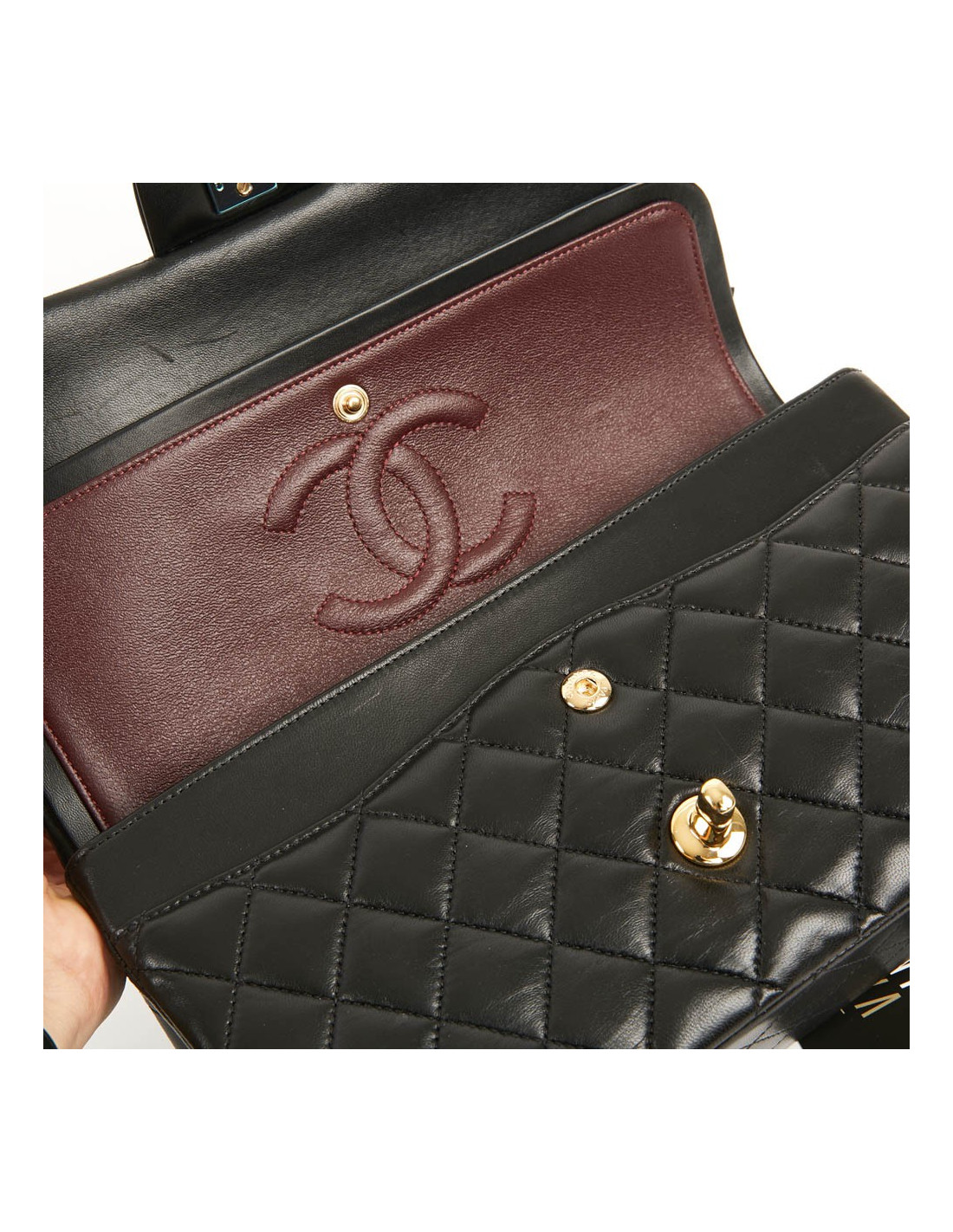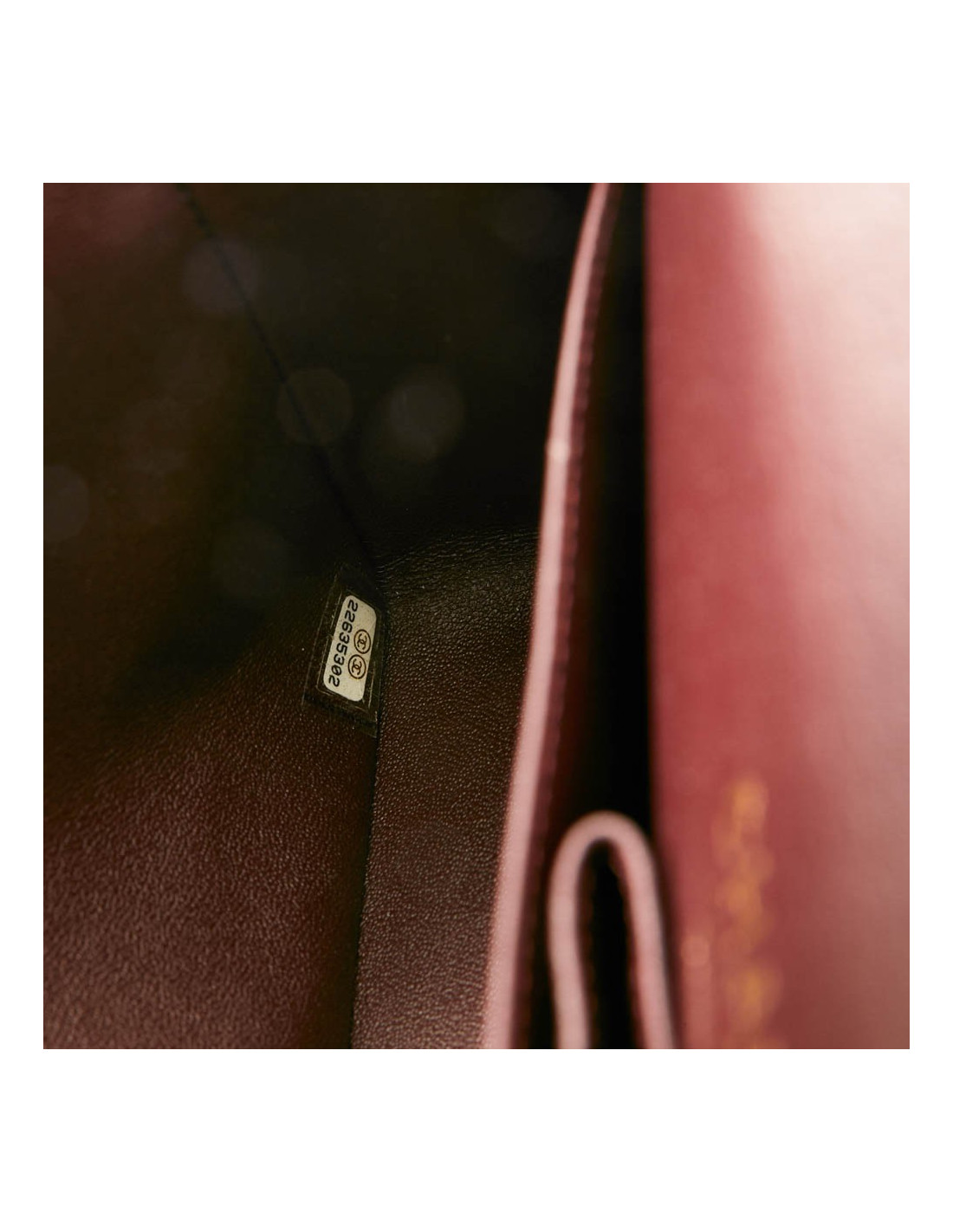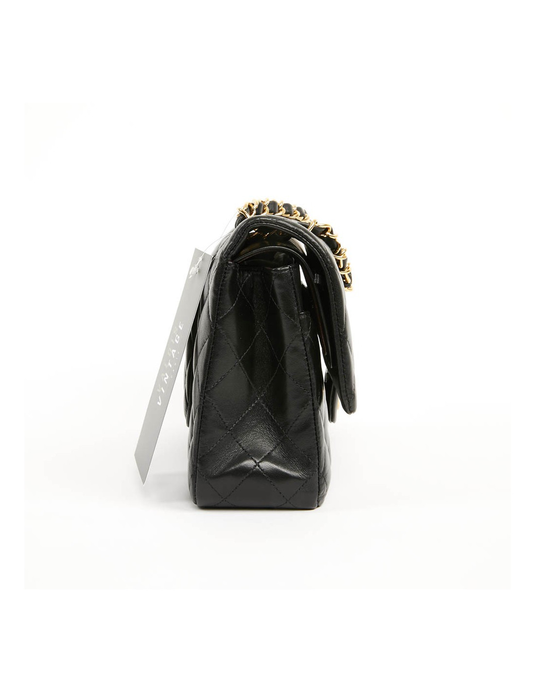 Elégant sac à main Chanel, en cuir d'agneau lisse matelassé. La bijouterie est dorée. Il se porte à l'épaule. Il a un double rabat. L'intérieur est doublé en cuir bordeaux. Sur le double rabat, légères griffures dues à la fragilité du cuir.