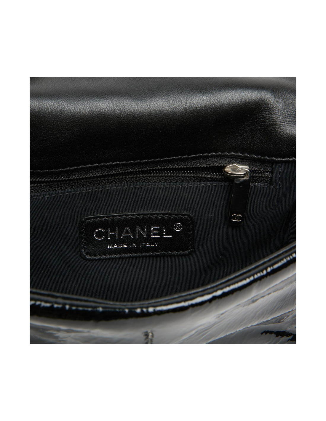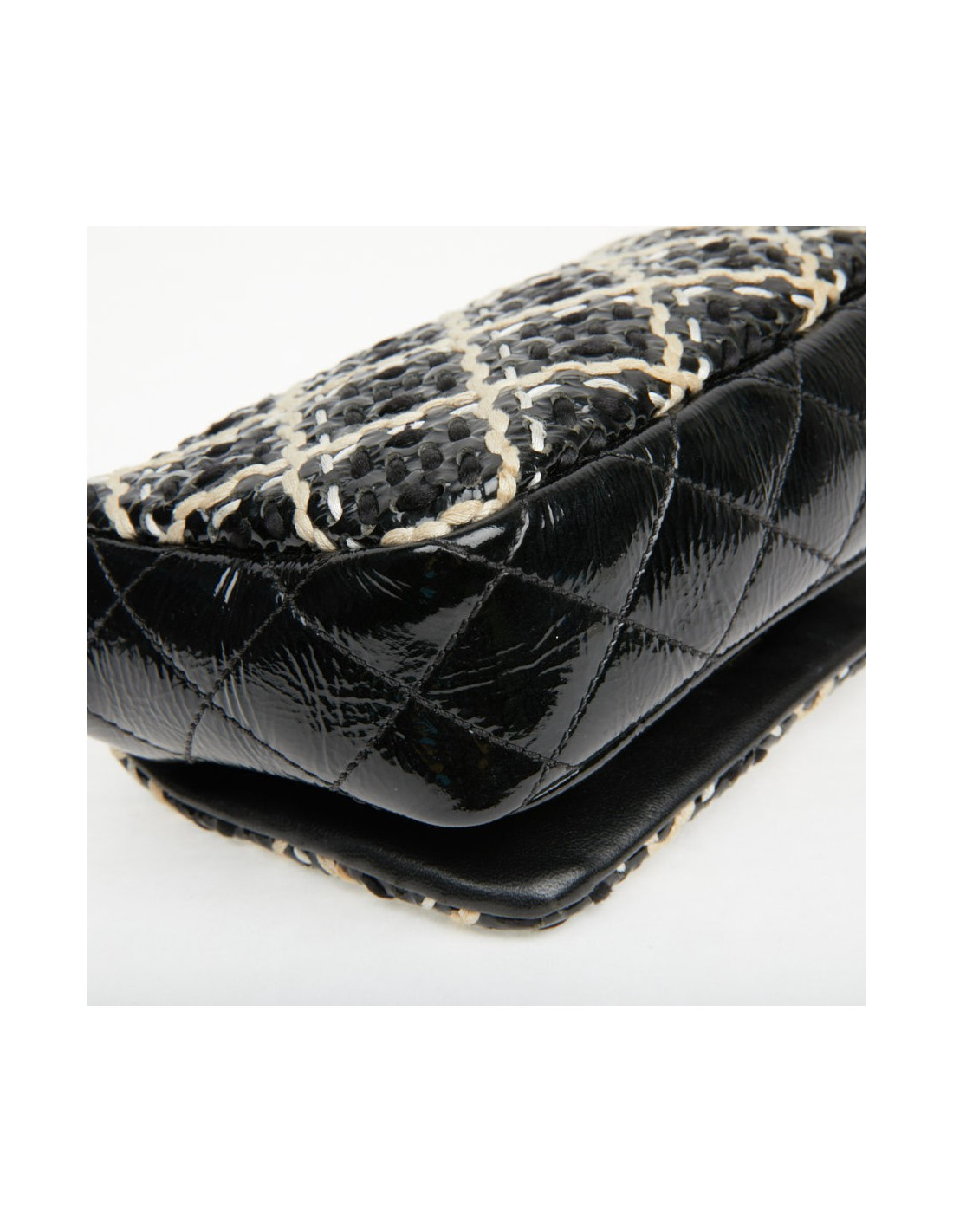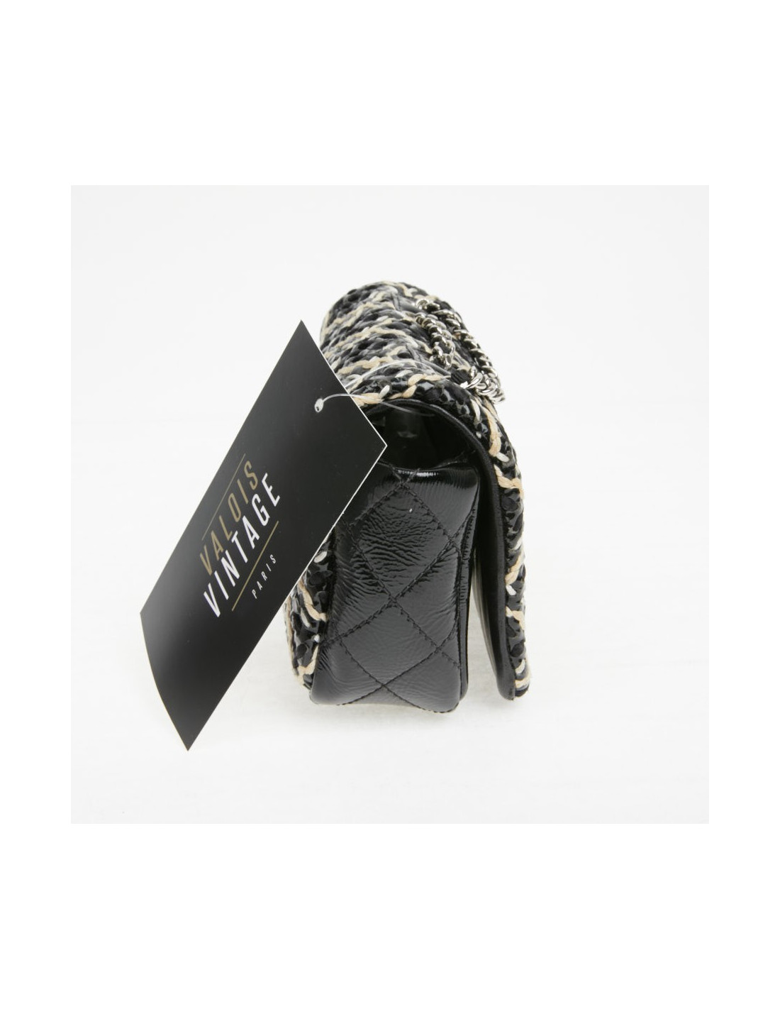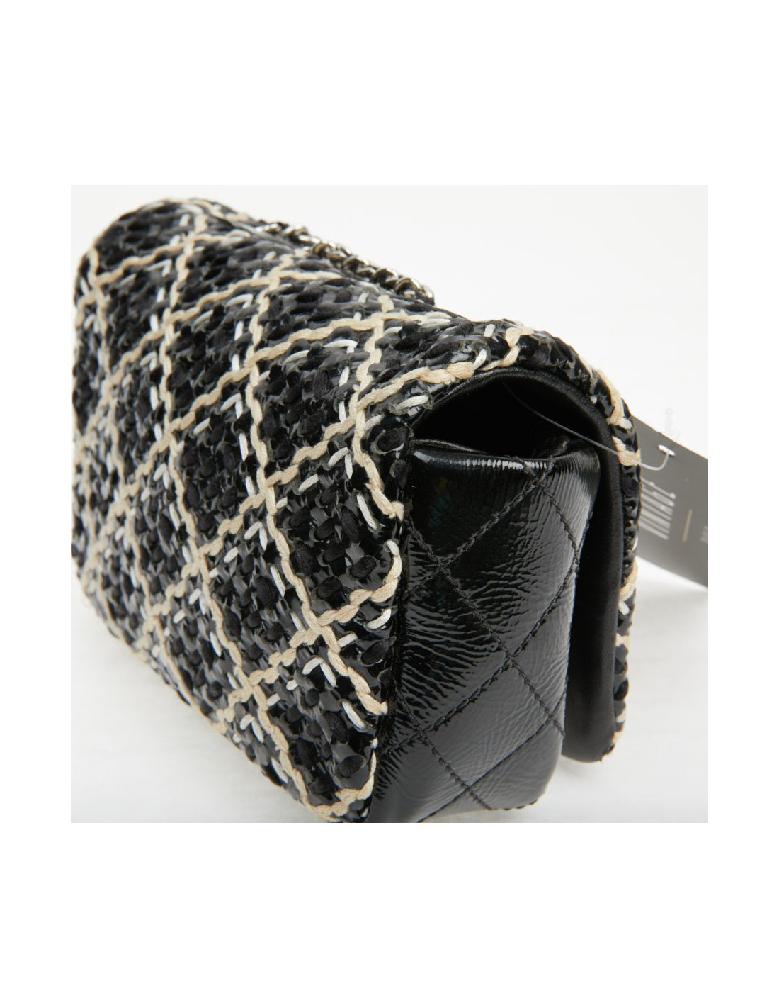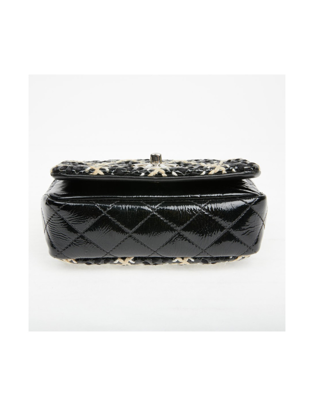Mini sac à main de la Maison Chanel. Il est en cuir verni tressé en superposition sur un cuir lisse noir. Il est brodé d’un fil en corde beige.La bijouterie est en métal argent palladié. l’intérieur est doublé en toile noire avec une petite poche en toile noire. Il se porte à l’épaule ou croisé.