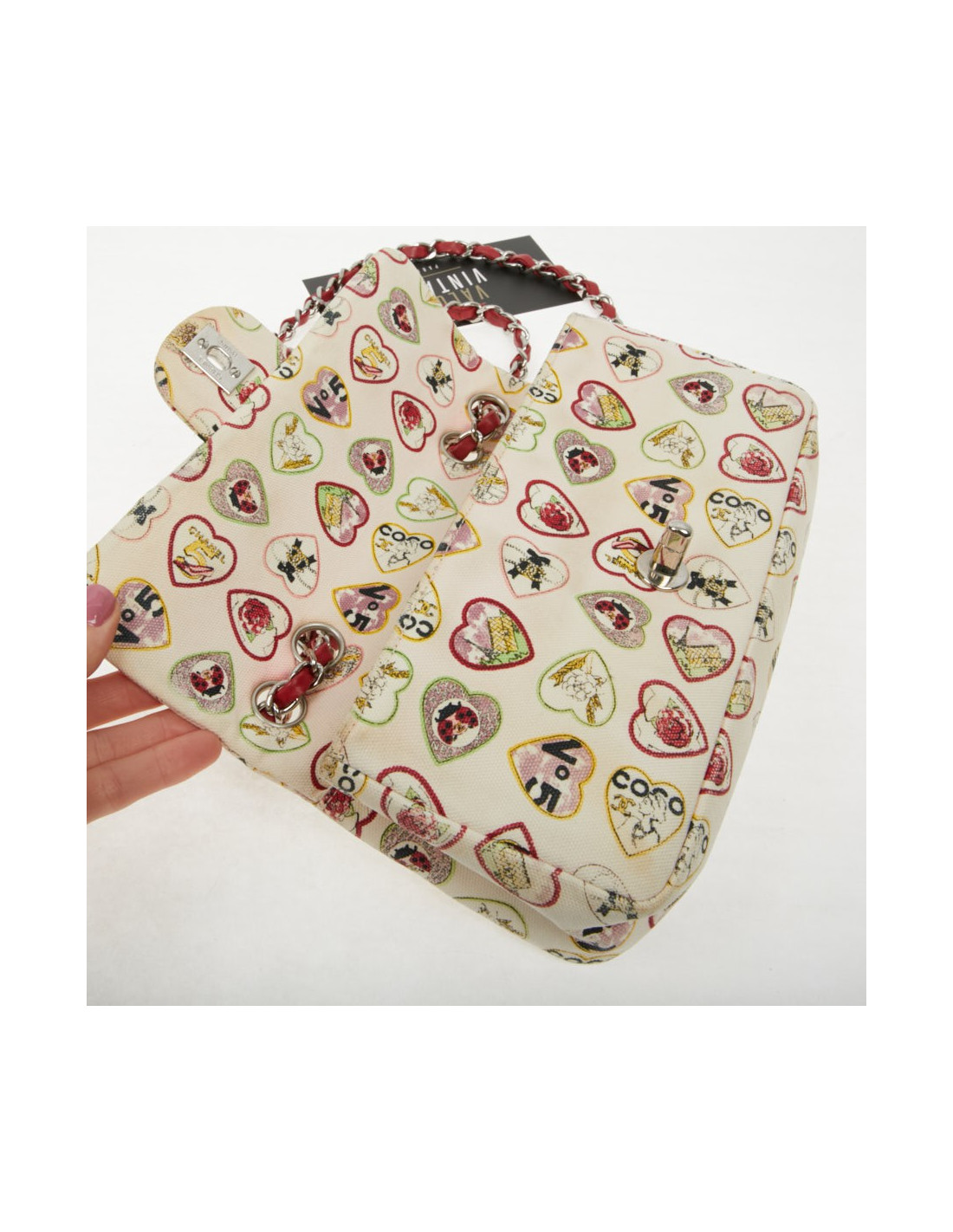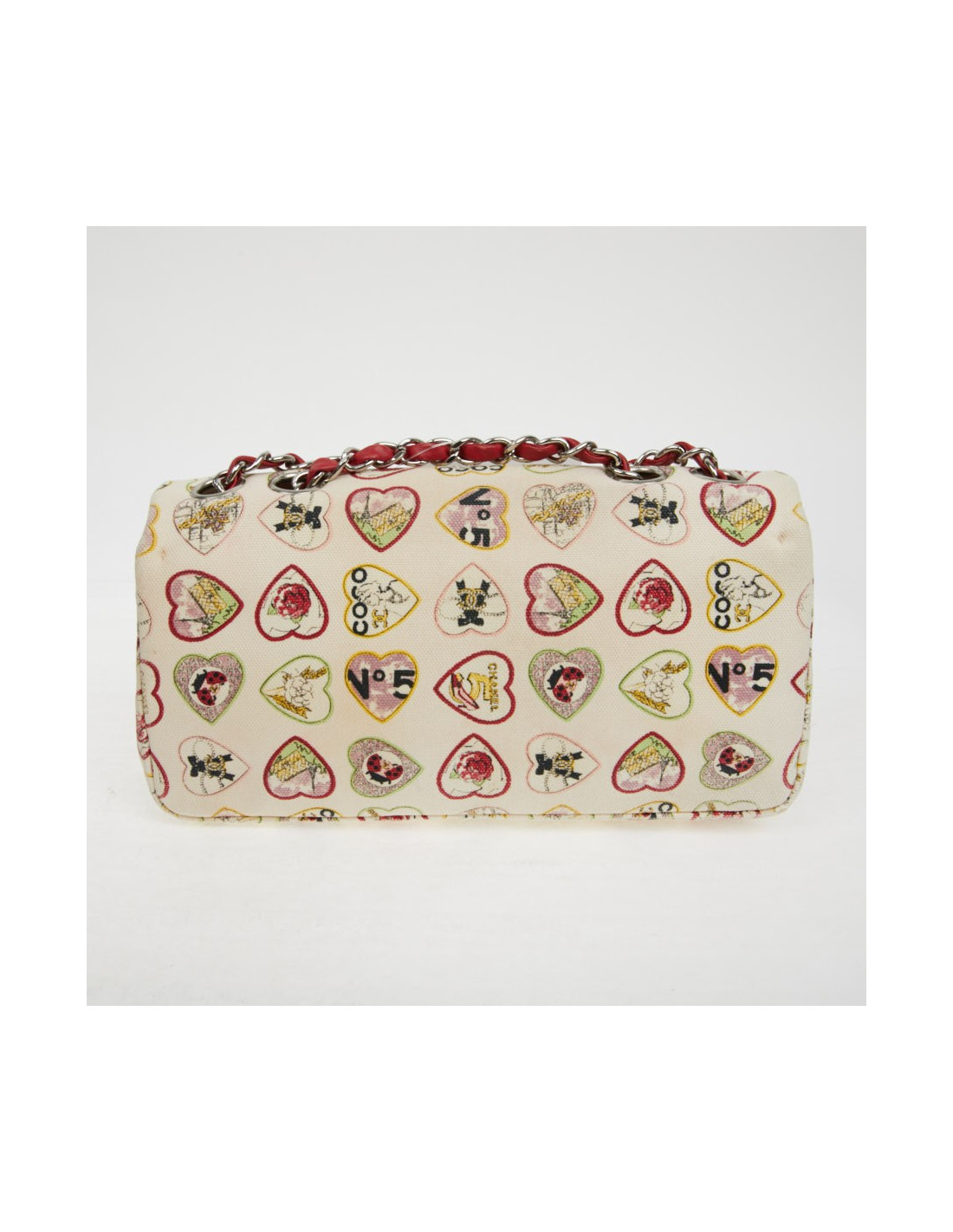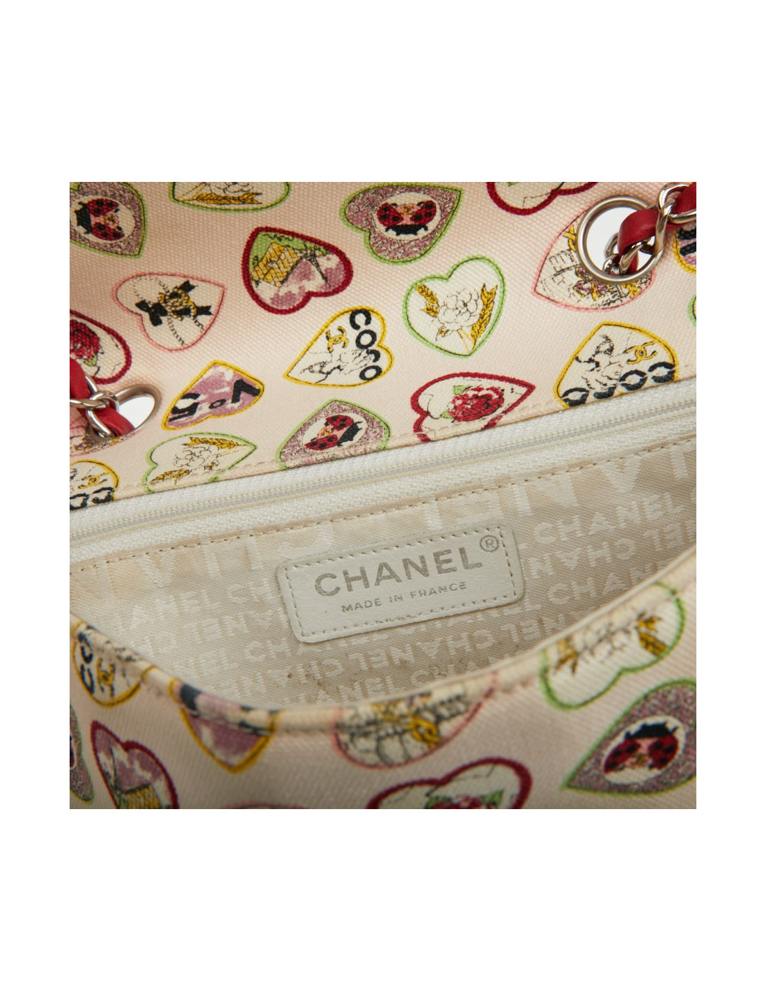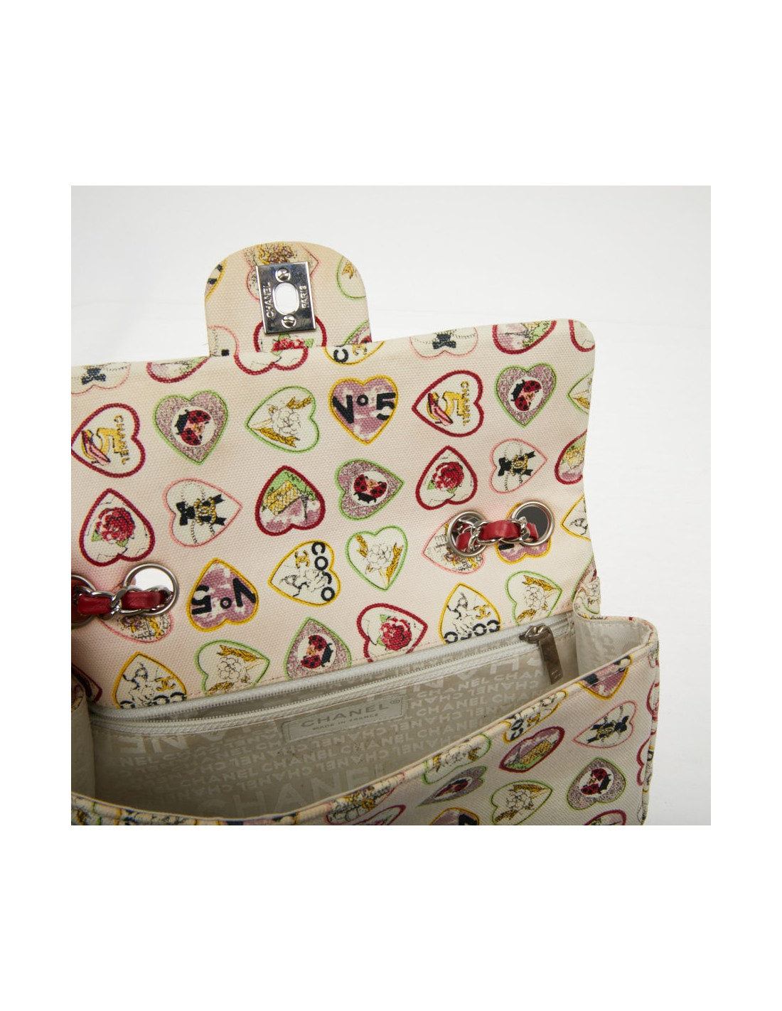 Collector. Ce sac à main est ideal à porter le printemps ou l’été. Il a une taille moyenne. Il est double d’un tissu monogramme beige avec une poche zippee. Il est recouvert de cœurs avec les symboles : camélias, Coco, N 5, coccinelle, timeless, noeud, sautoir, CC, chaussures. La chaîne en métal argent palladié entrelacée de cuir rouge.