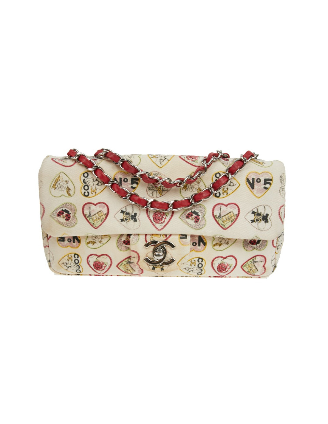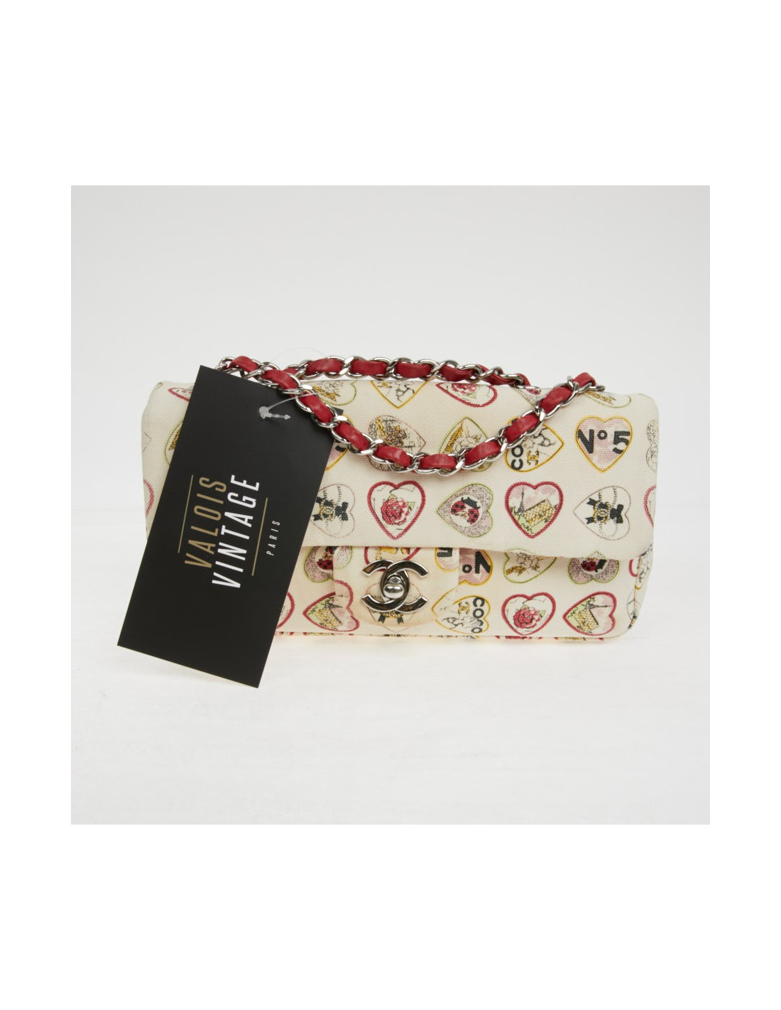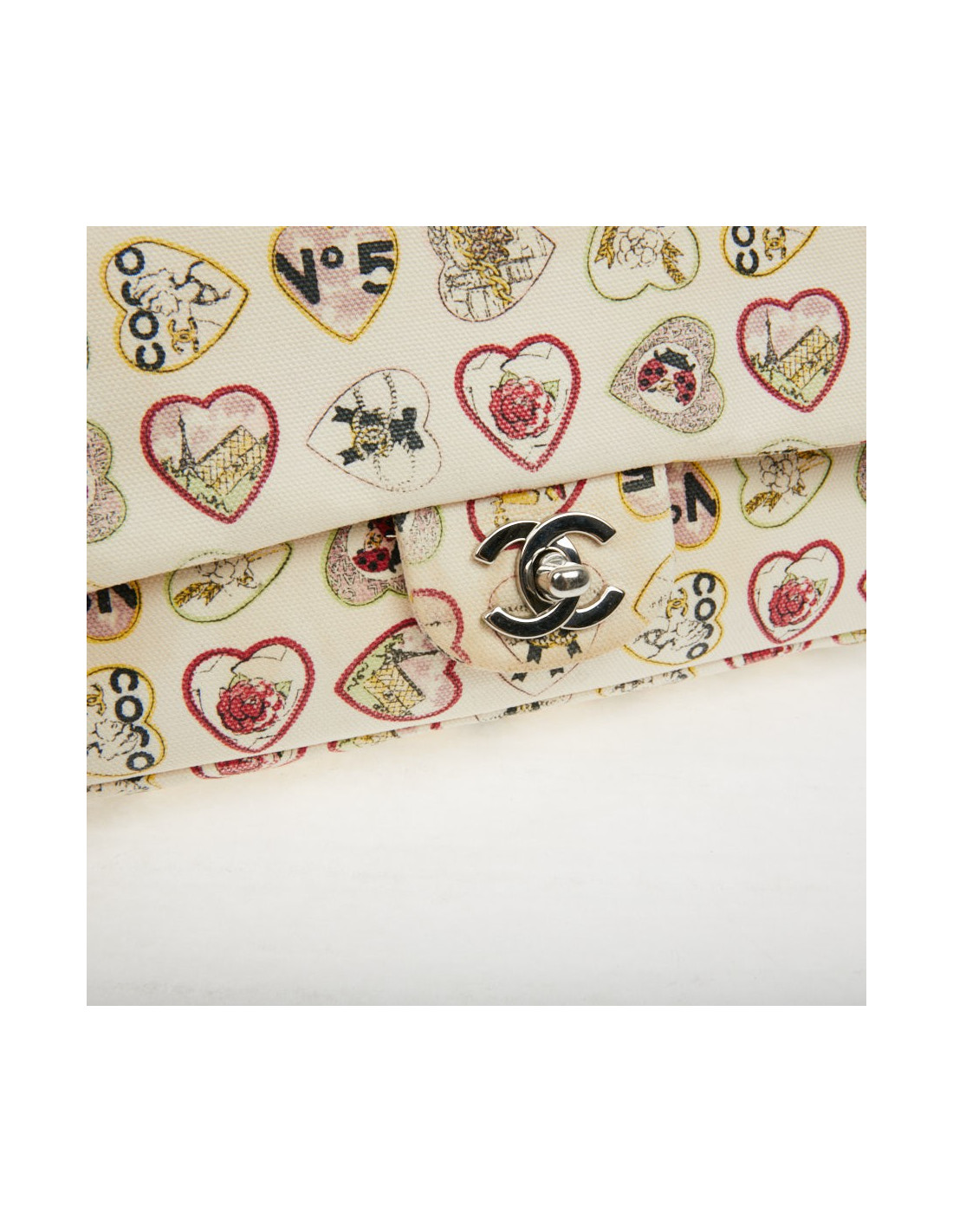 Collector. Ce sac à main est ideal à porter le printemps ou l’été. Il a une taille moyenne. Il est double d’un tissu monogramme beige avec une poche zippee. Il est recouvert de cœurs avec les symboles : camélias, Coco, N 5, coccinelle, timeless, noeud, sautoir, CC, chaussures. La chaîne en métal argent palladié entrelacée de cuir rouge.