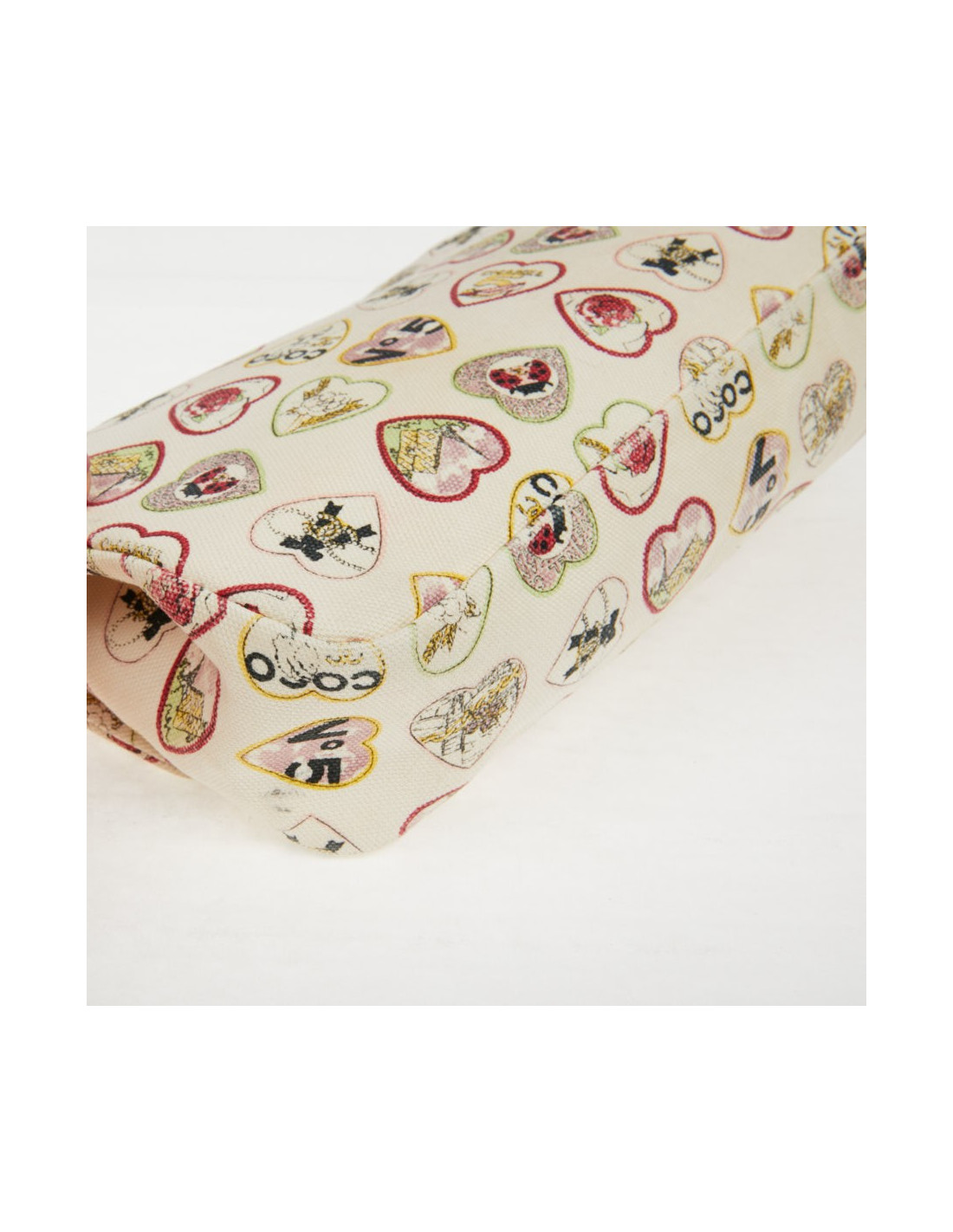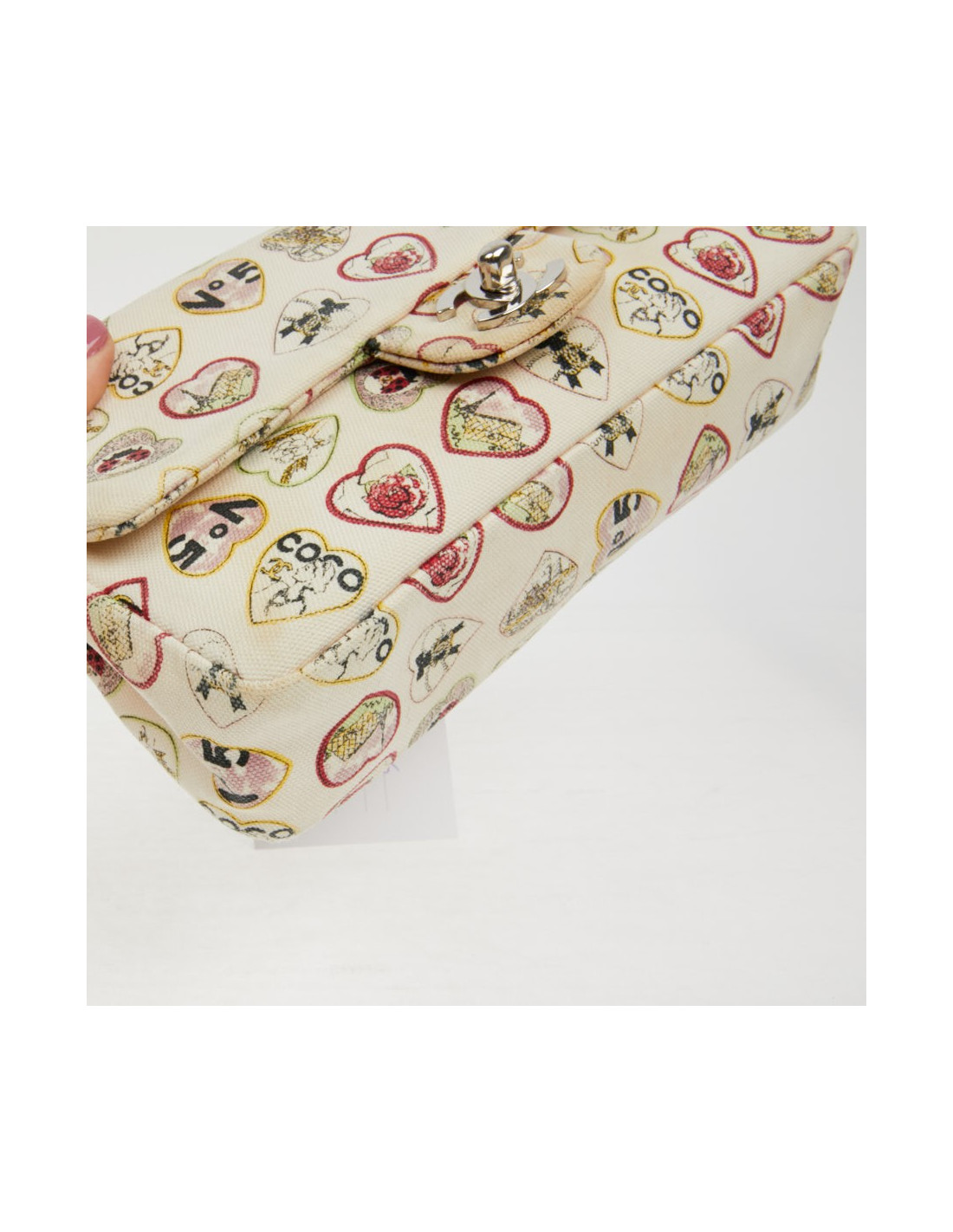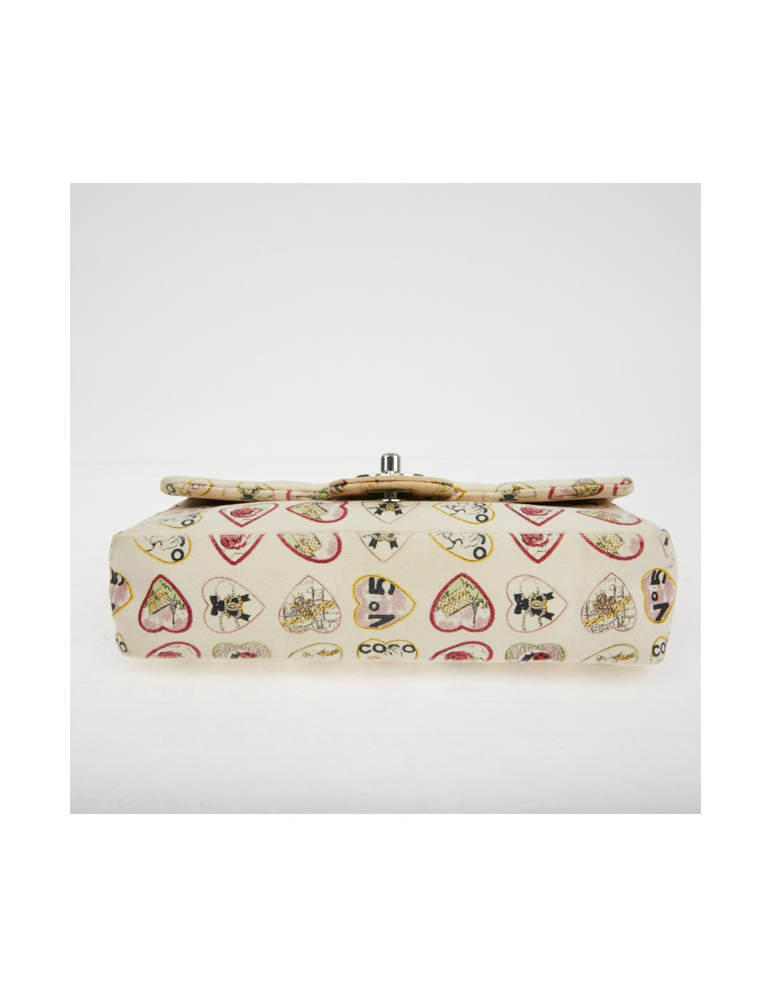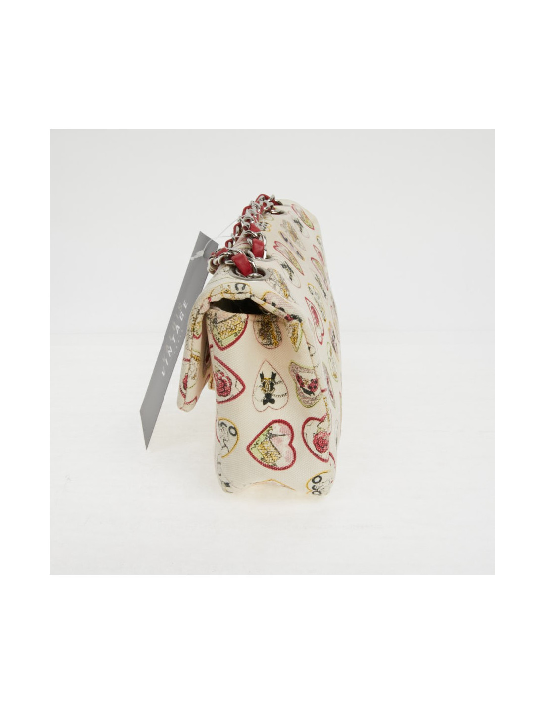 Collector. Ce sac à main est ideal à porter le printemps ou l’été. Il a une taille moyenne. Il est double d’un tissu monogramme beige avec une poche zippee. Il est recouvert de cœurs avec les symboles : camélias, Coco, N 5, coccinelle, timeless, noeud, sautoir, CC, chaussures. La chaîne en métal argent palladié entrelacée de cuir rouge.