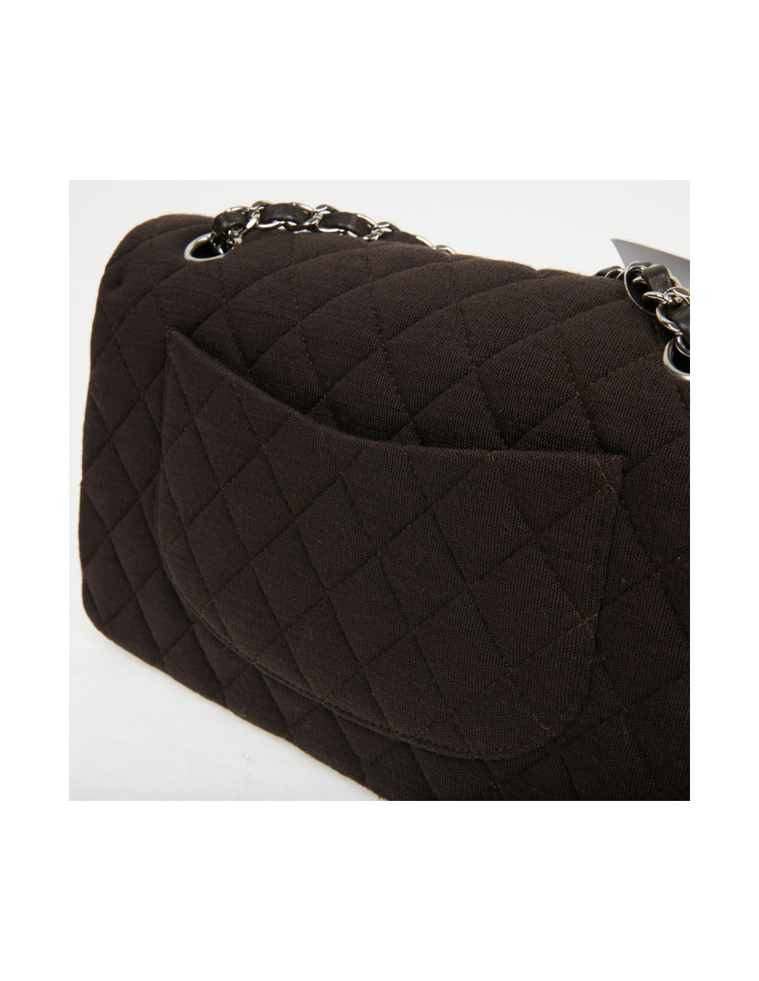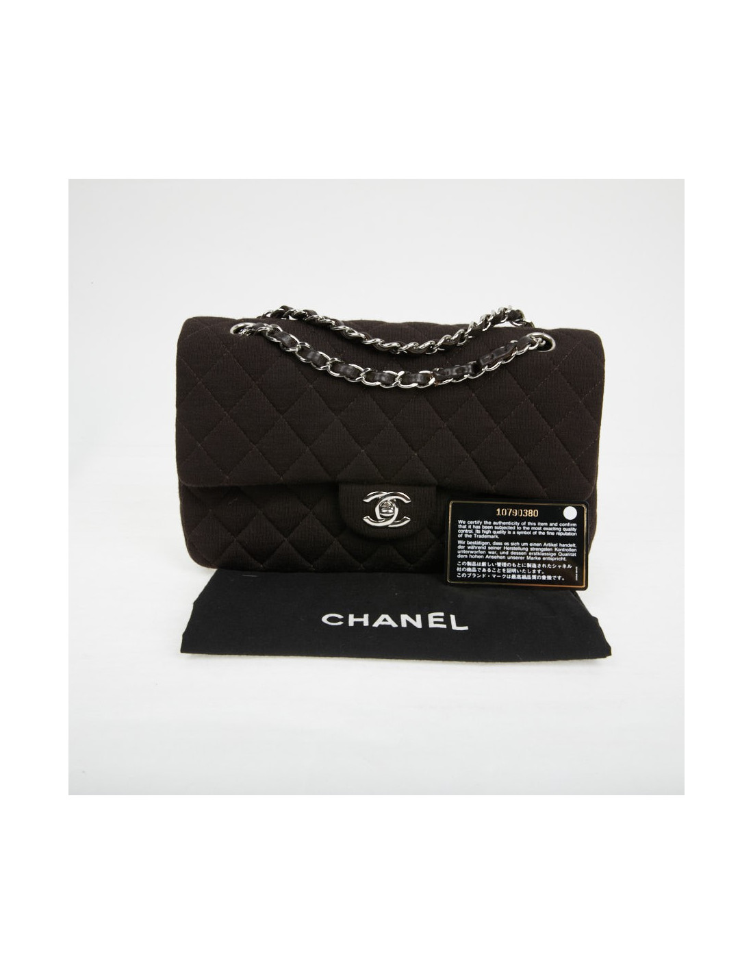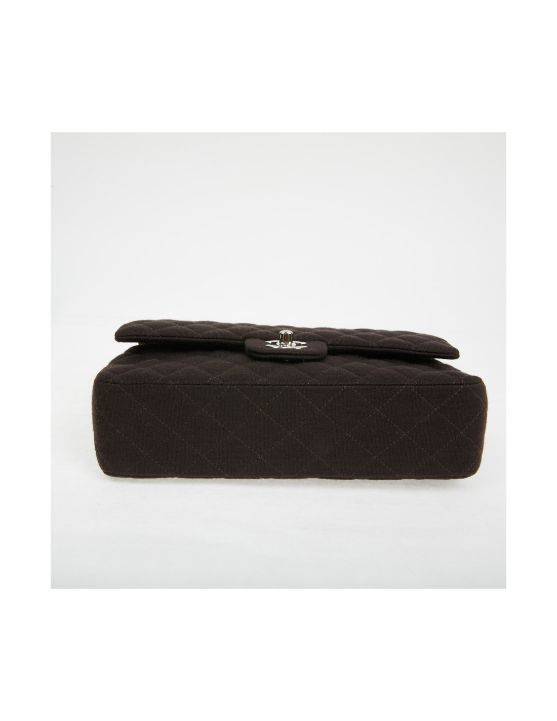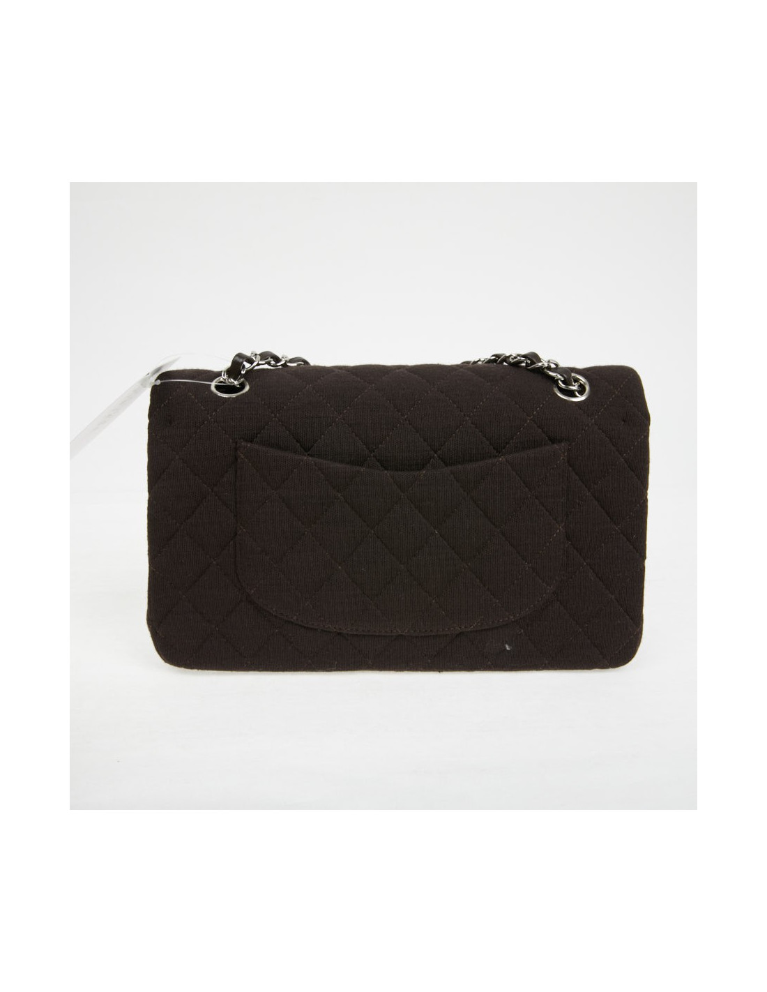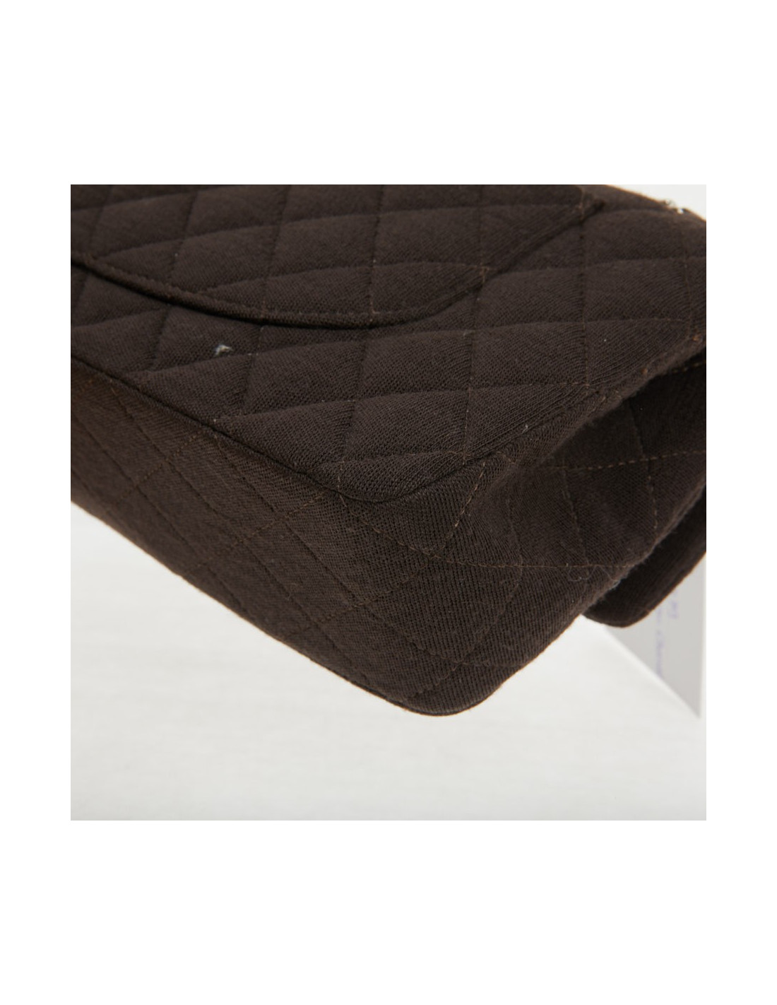 Un grand classique chez Chanel. Un sac à main à porter en toutes occasions en jersey marron. Il est très élégant. Il a un double rabat et l’intérieur est en cuir marron avec une poche a l’avant et 3 fentes.