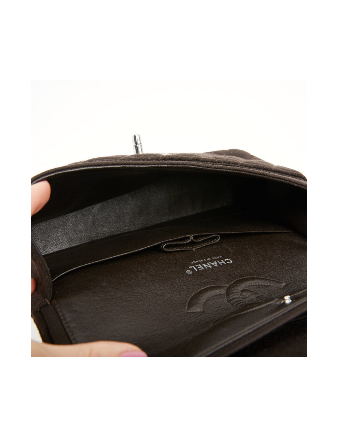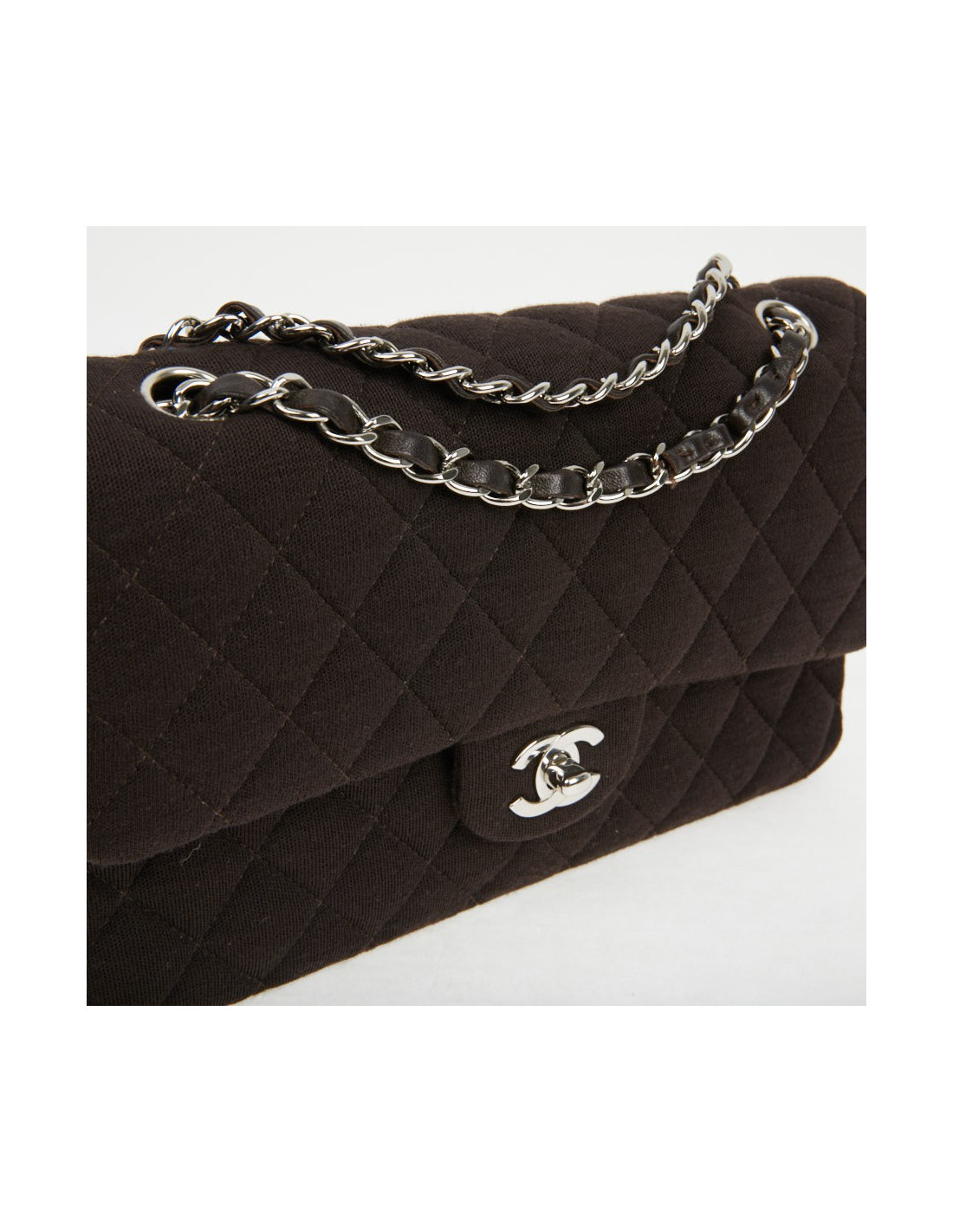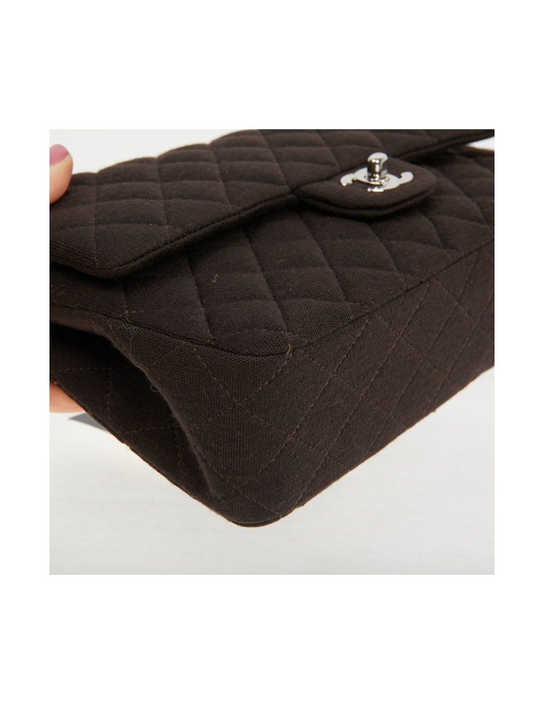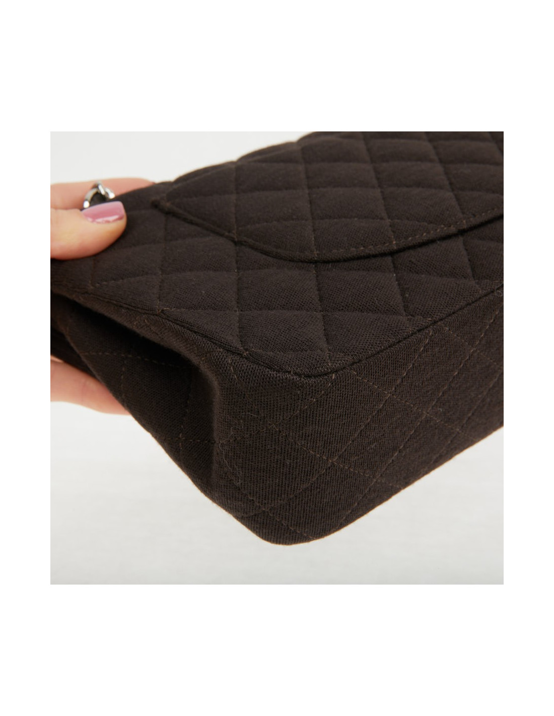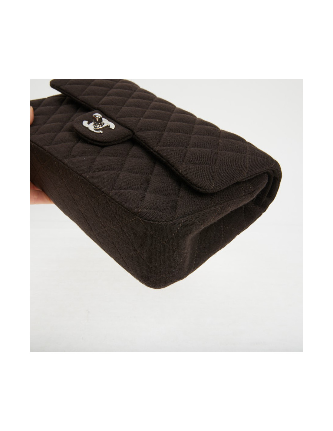 Un grand classique chez Chanel. Un sac à main à porter en toutes occasions en jersey marron. Il est très élégant. Il a un double rabat et l’intérieur est en cuir marron avec une poche a l’avant et 3 fentes.