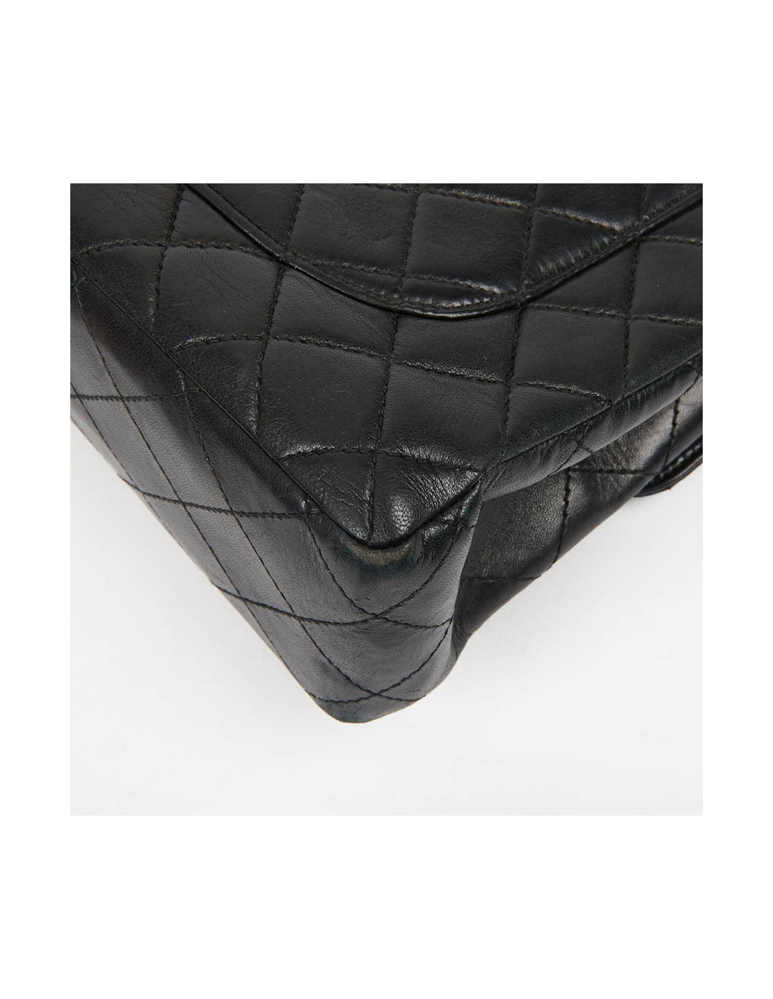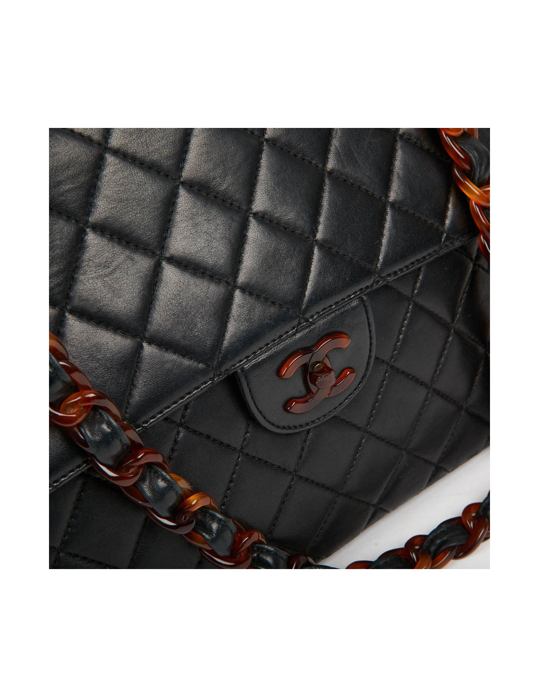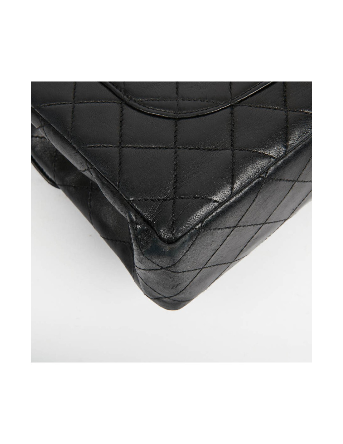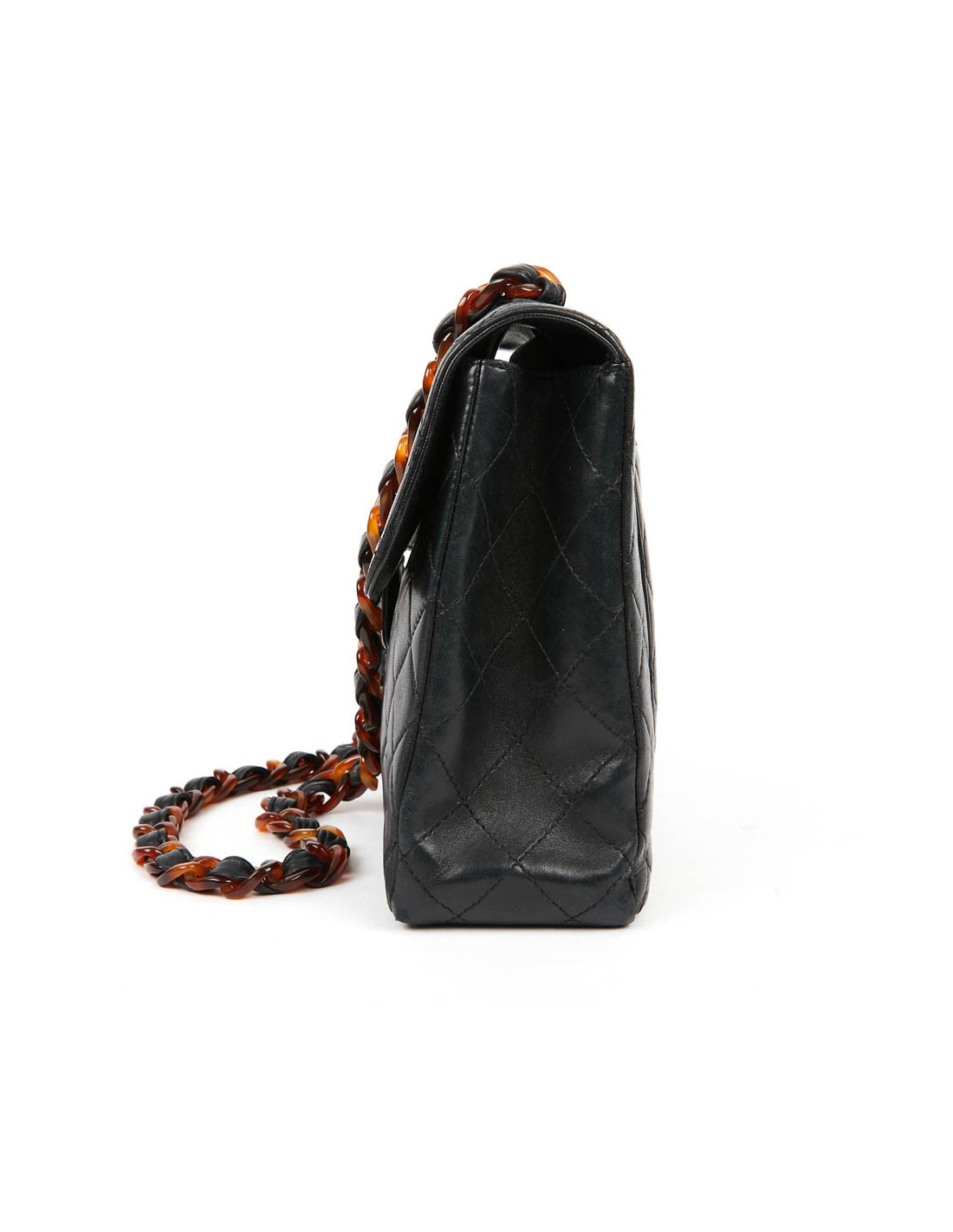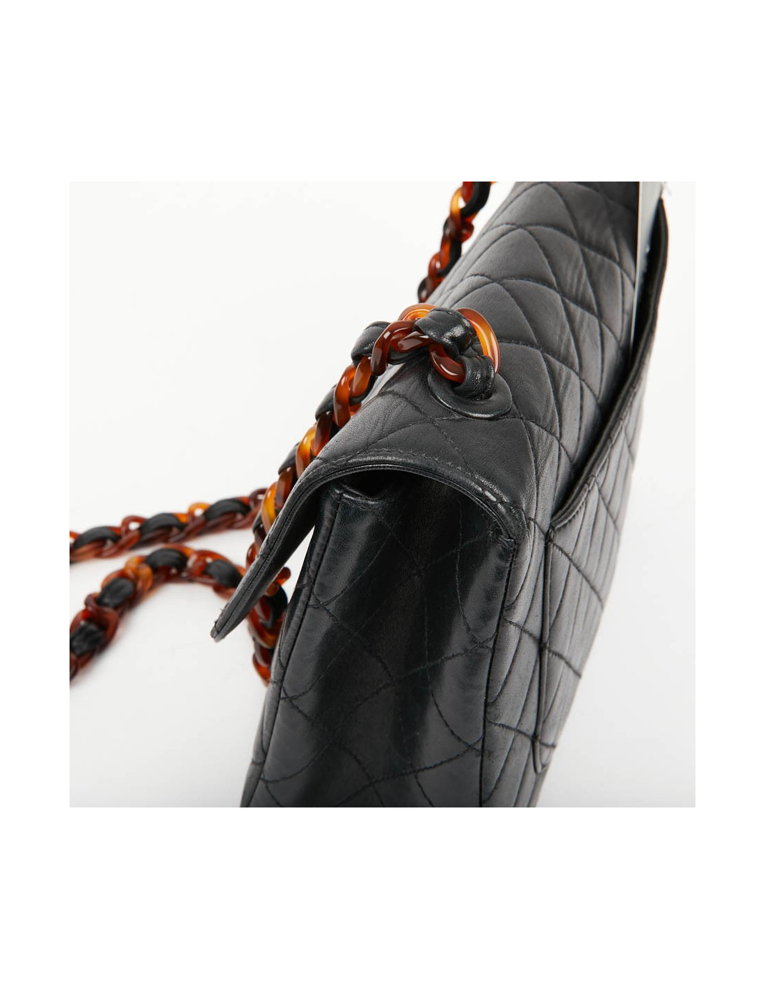 Ce grand sac vintage classique CHANEL, avec sa bandoulière façon écaille, est en cuir lisse noir matelassé. Il peut se porter crossbody.