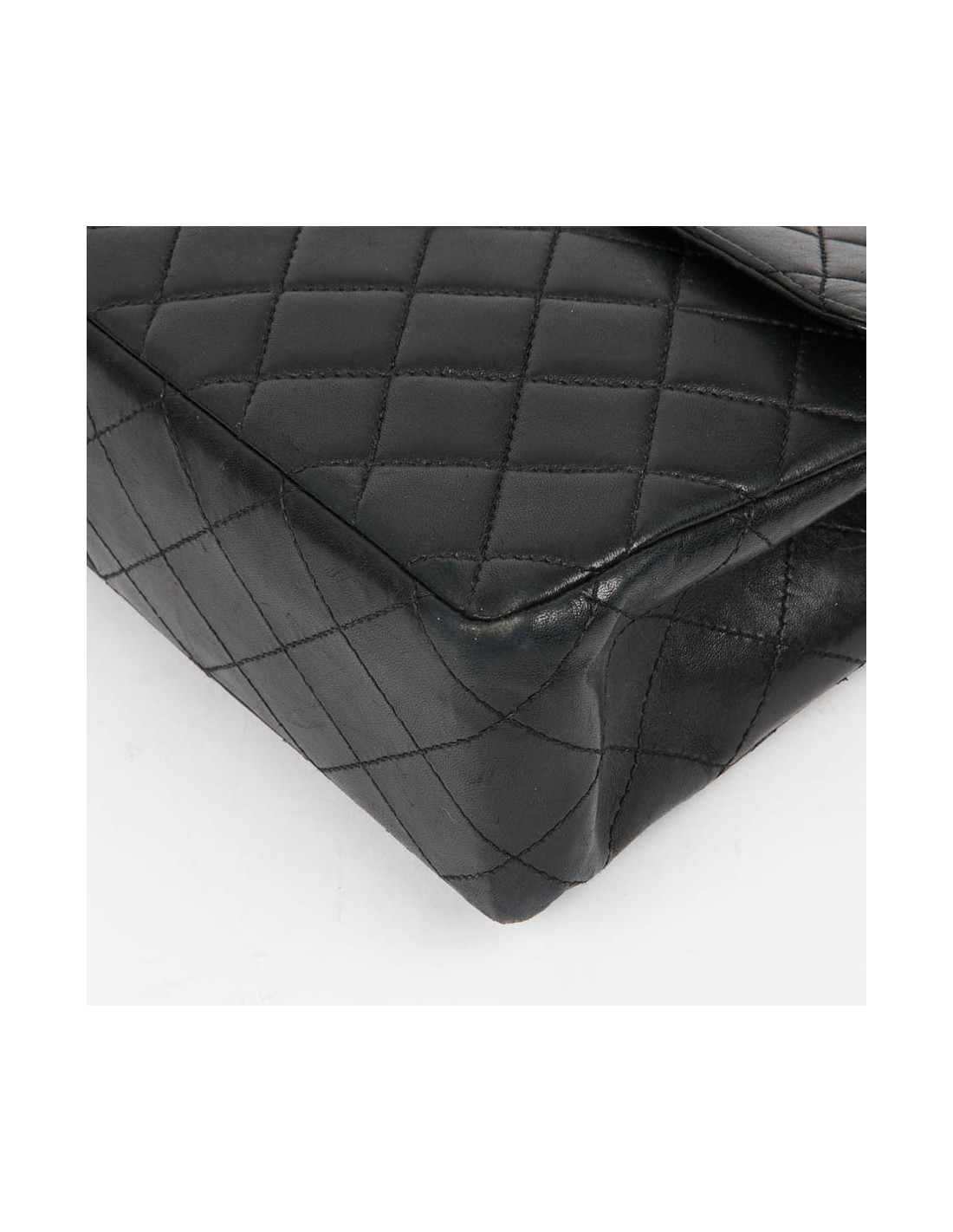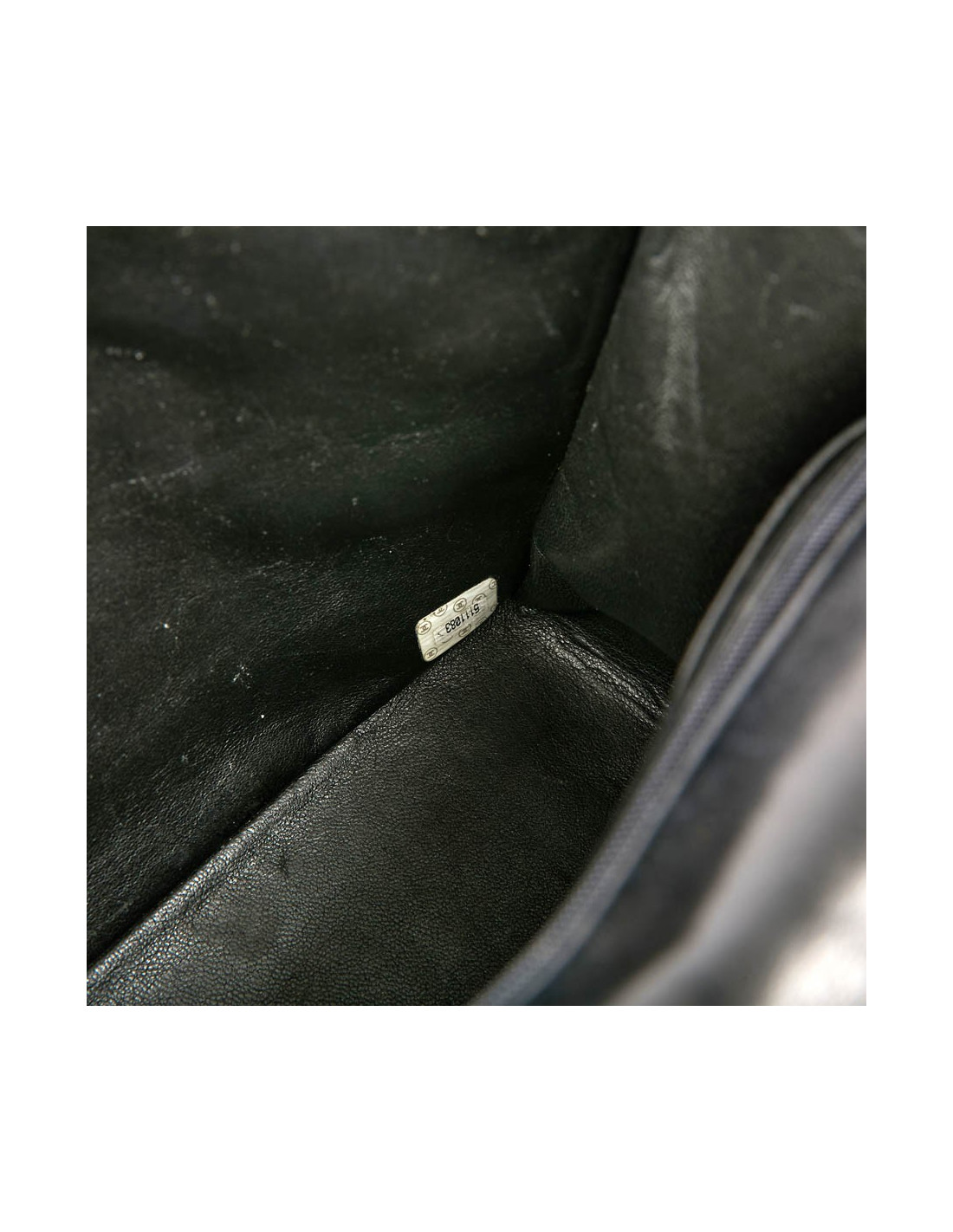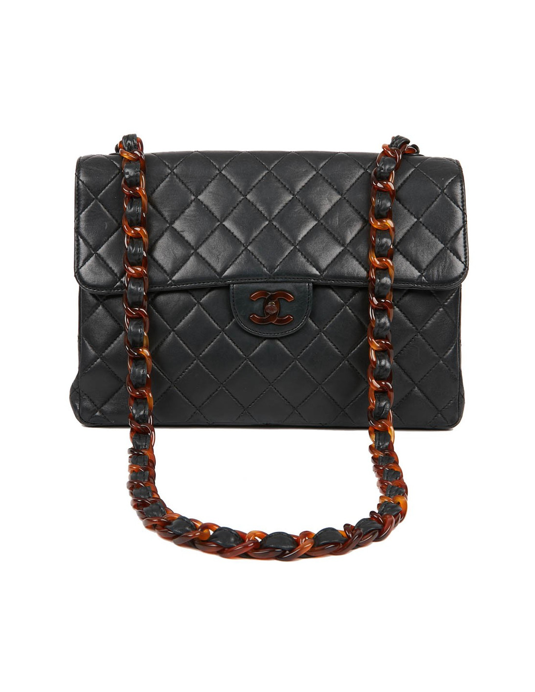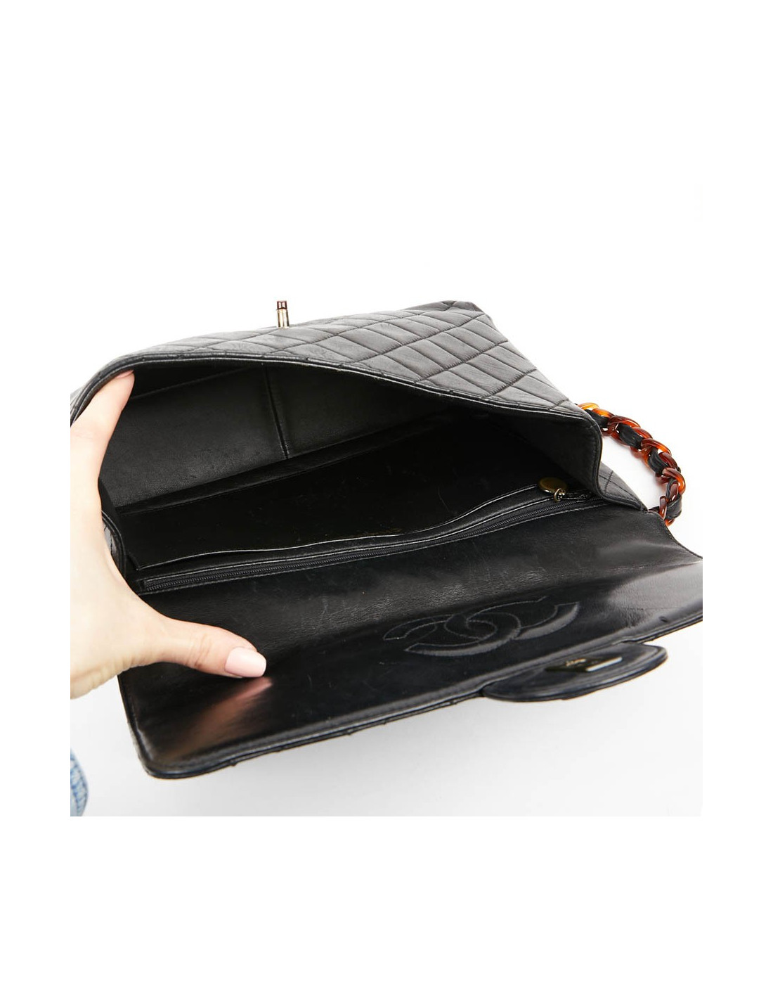 Ce grand sac vintage classique CHANEL, avec sa bandoulière façon écaille, est en cuir lisse noir matelassé. Il peut se porter crossbody.