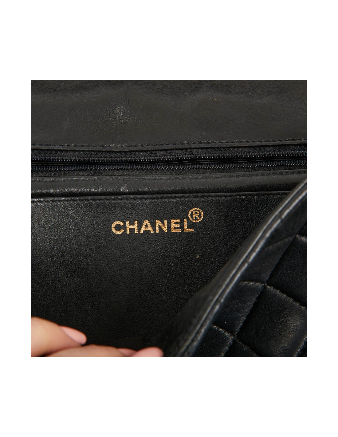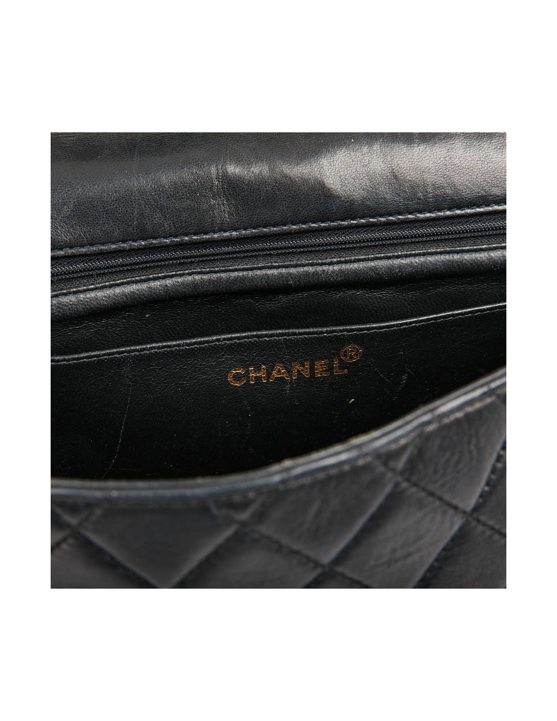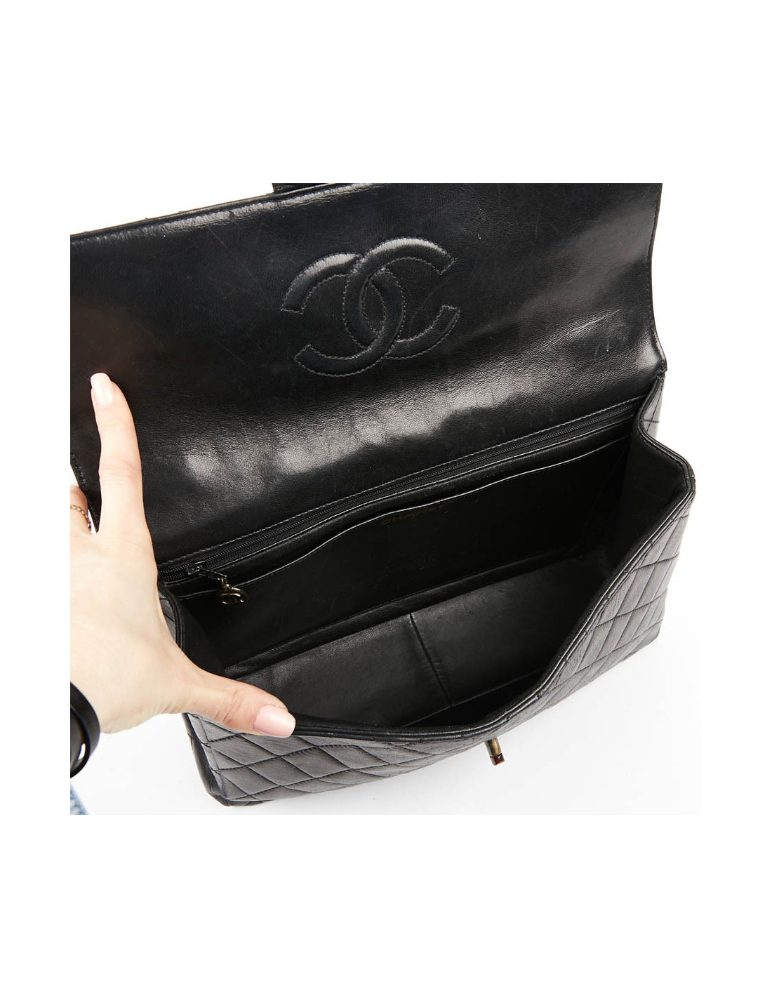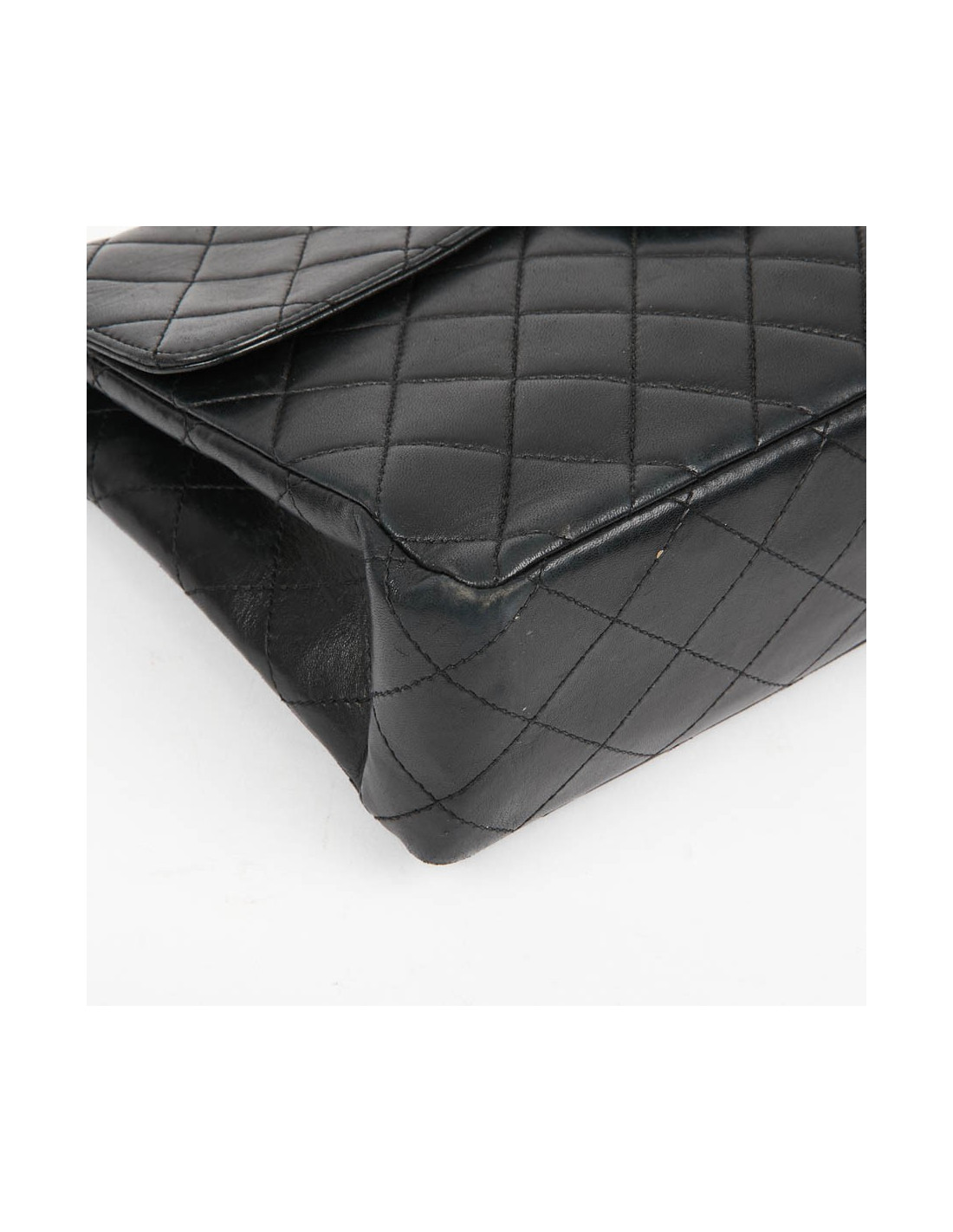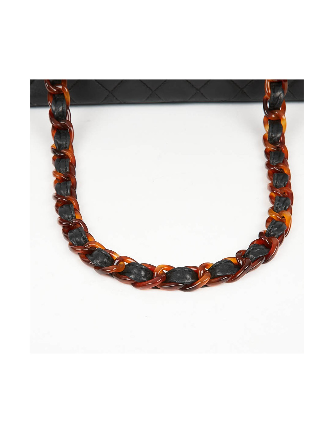Ce grand sac vintage classique CHANEL, avec sa bandoulière façon écaille, est en cuir lisse noir matelassé. Il peut se porter crossbody.