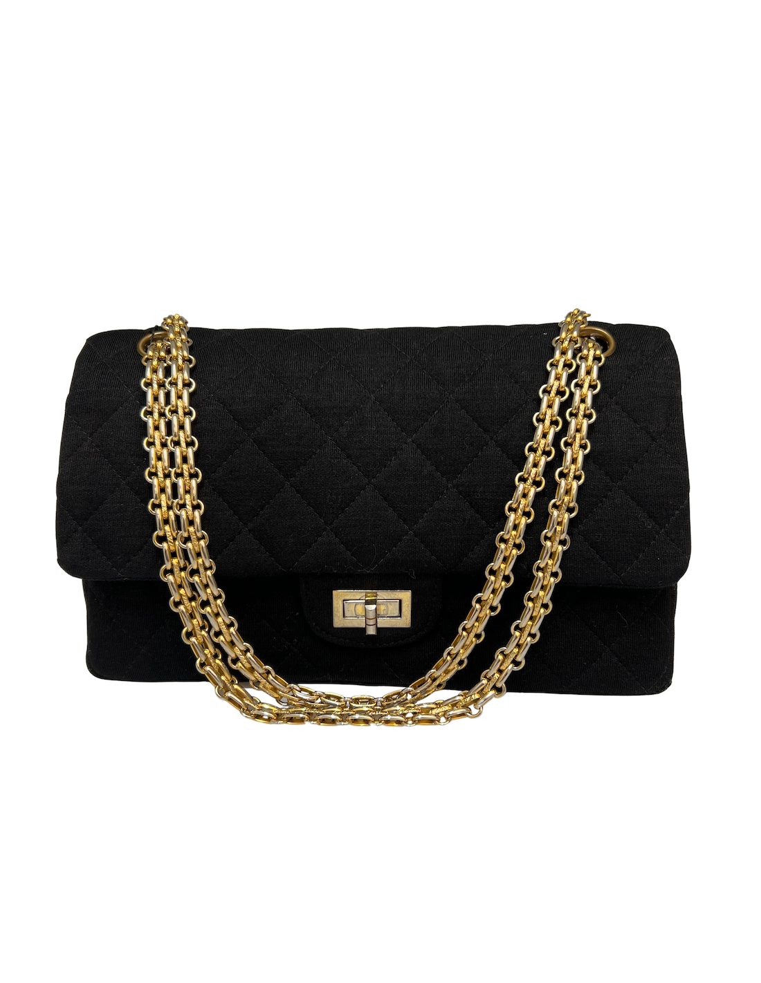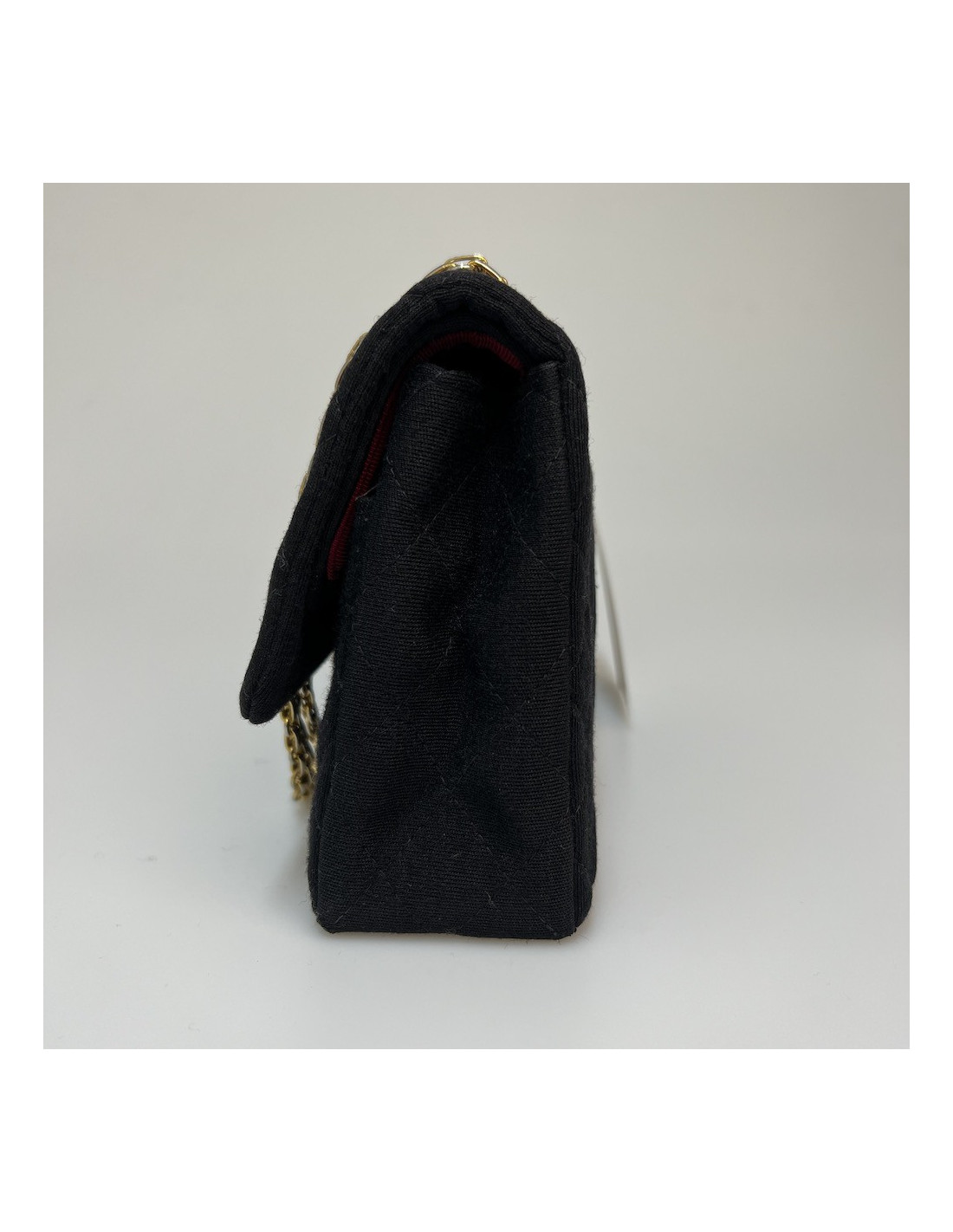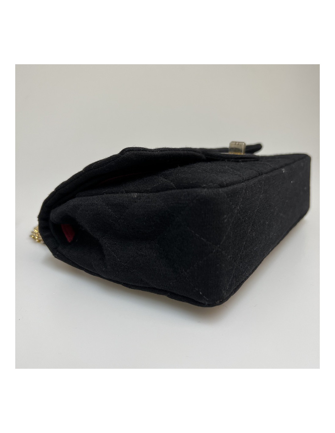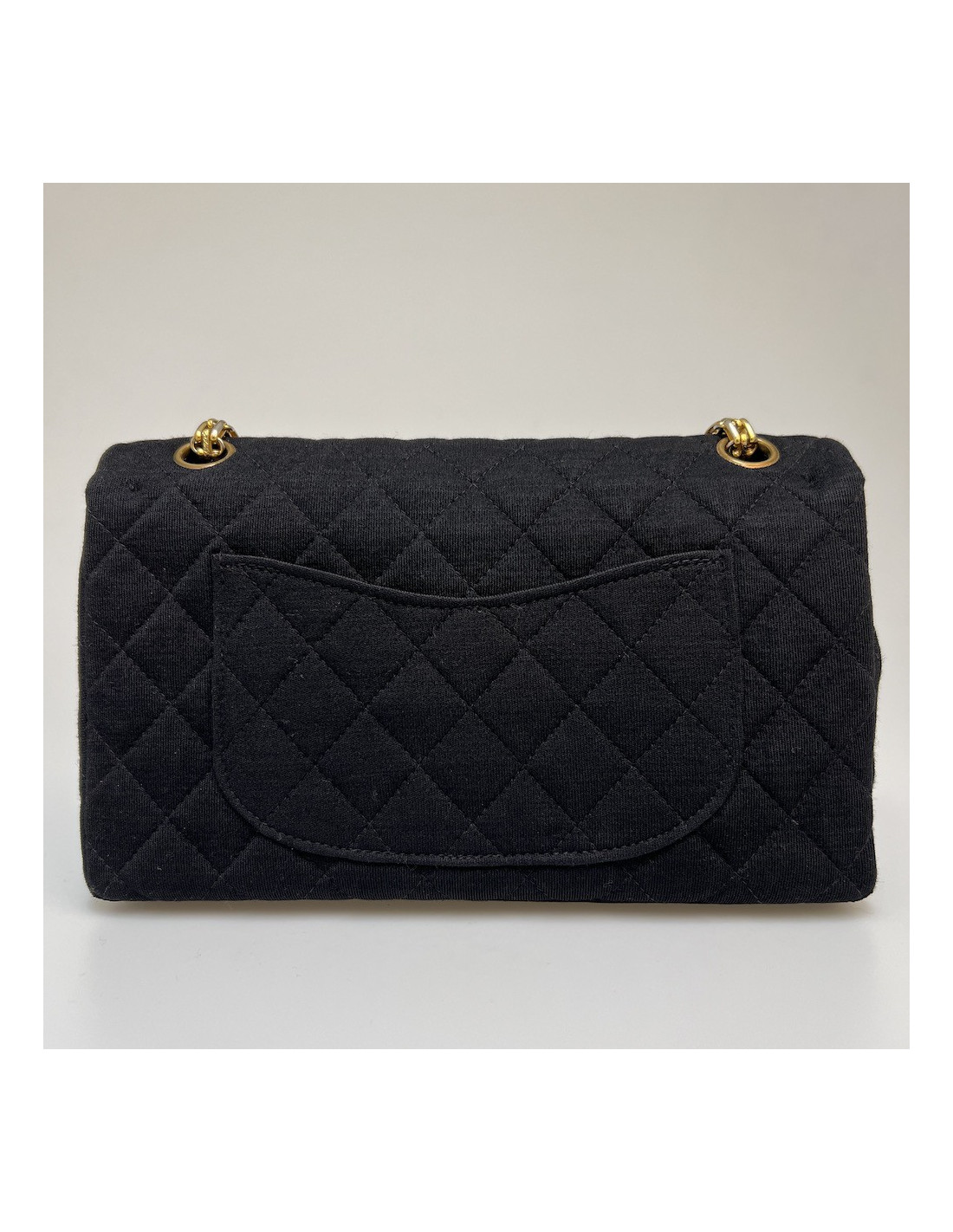 Ce sac vintage CHANEL est en jersey noir. La bijouterie est en métal doré avec des micro-rayures.