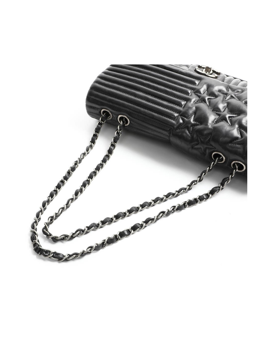 Sac Collector du défilé Métiers d'Art "Paris Dallas" Chanel en cuir d'agneau souple lisse noir. La bijouterie et en métal argent vieilli. Le double "C" représente des fers à chevaux cloutés.