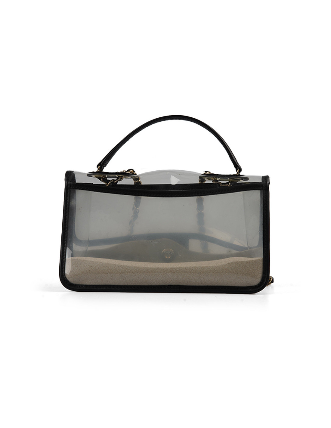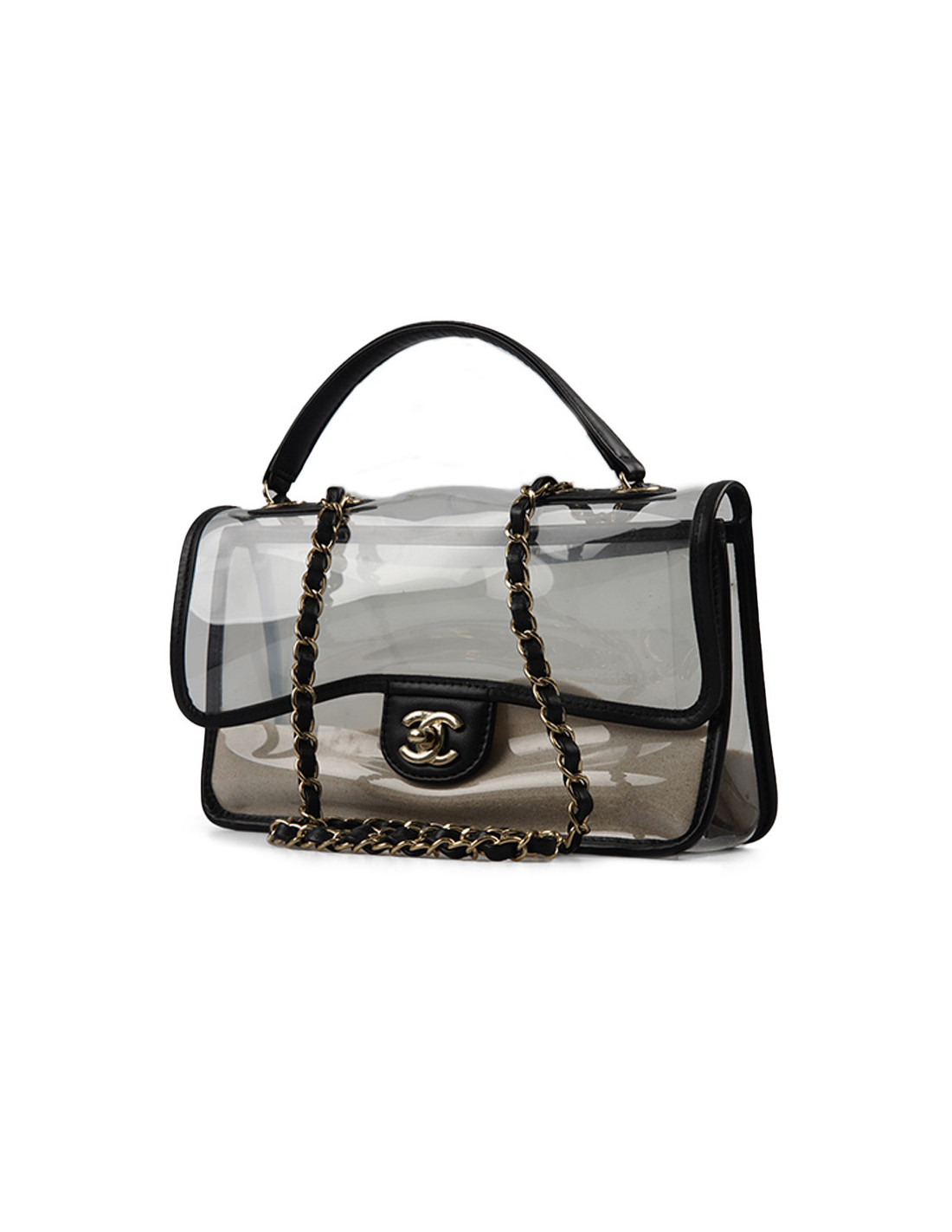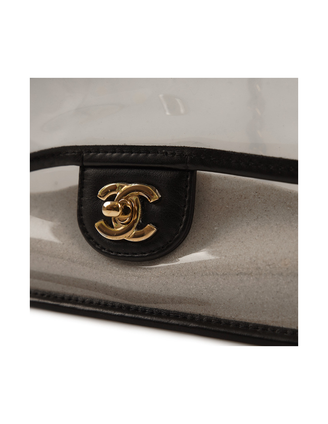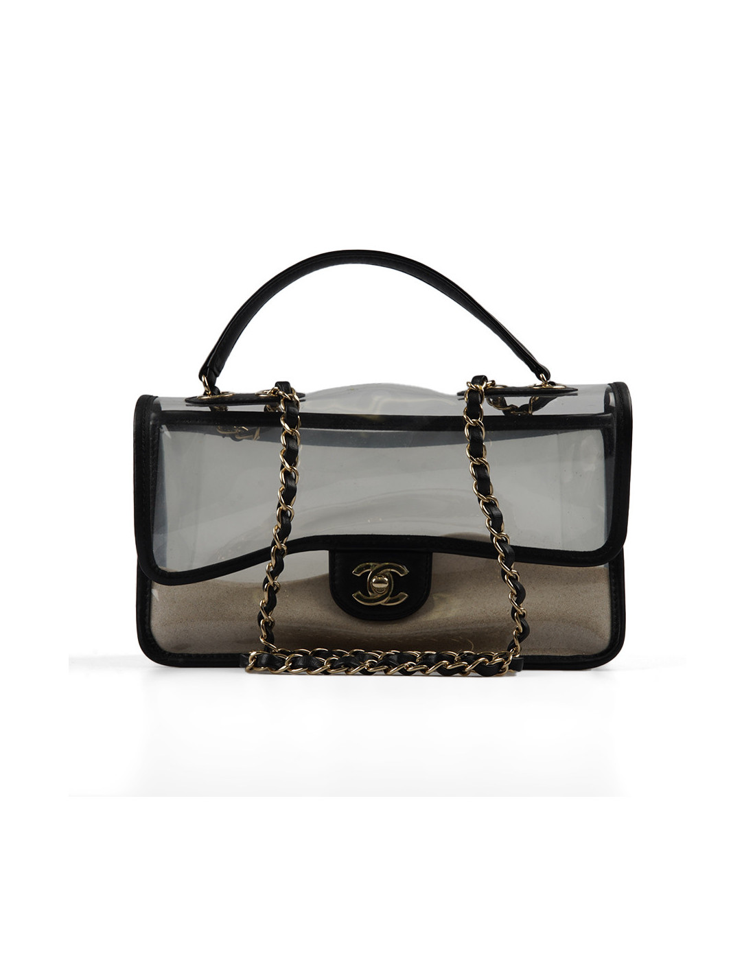 Détails : vu sur le défilé Resort " Sur la Plage " 2019. Timeless transparent avec des empiècements en cuir noir, poches en PVC remplies de sable fin des deux côtés du sac. Plastique toujours sur le fermoir CC.