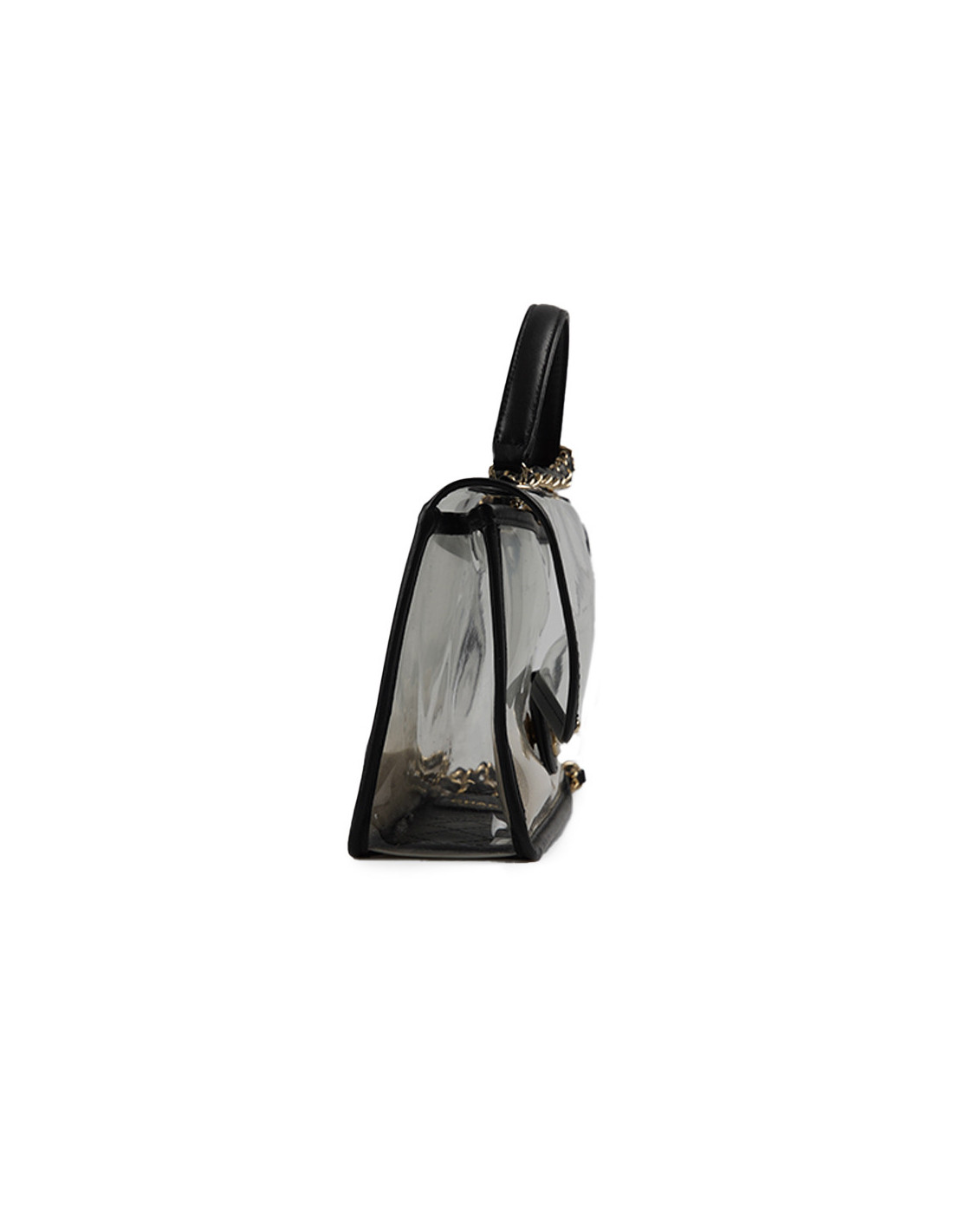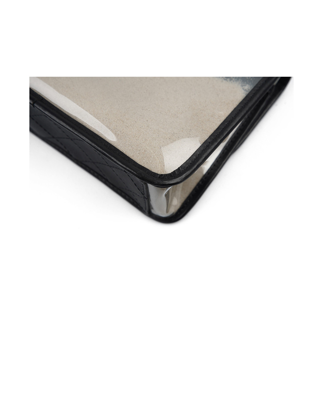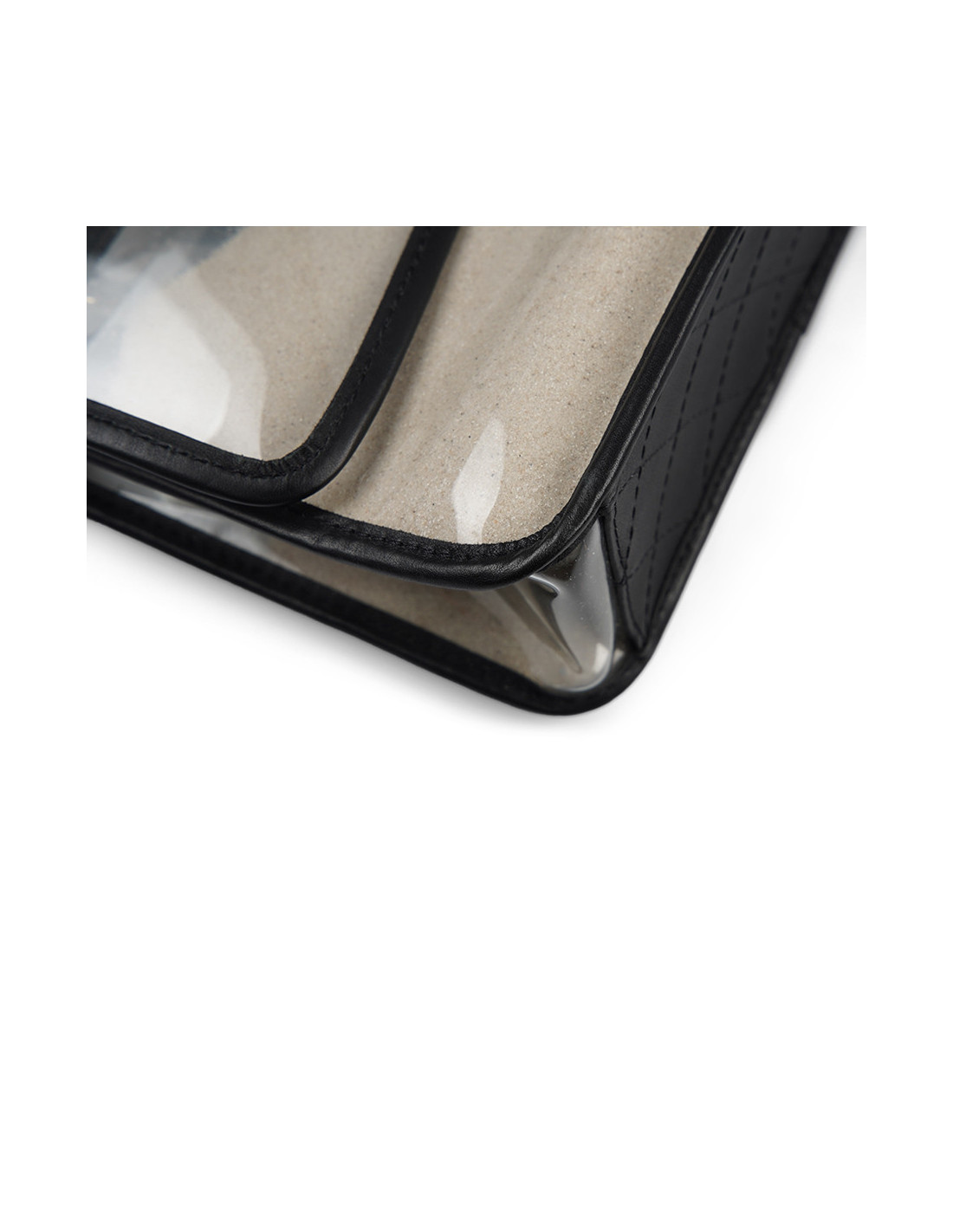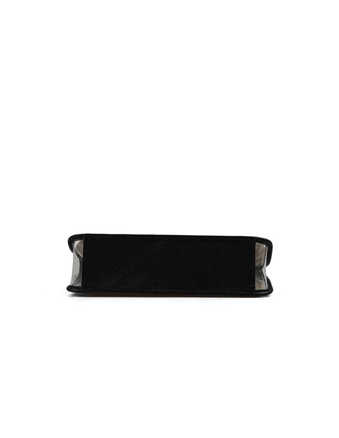 Détails : vu sur le défilé Resort " Sur la Plage " 2019. Timeless transparent avec des empiècements en cuir noir, poches en PVC remplies de sable fin des deux côtés du sac. Plastique toujours sur le fermoir CC.